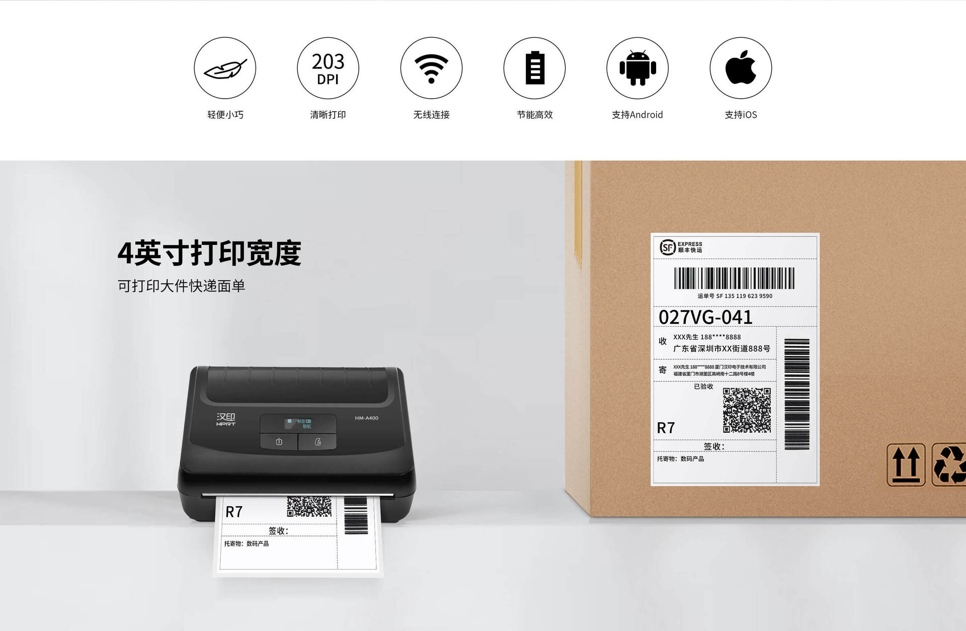 Hanyin HM-A400 휴대용 열전사 라벨 프린터 110mm 우편 교차 물류 양식 프린터