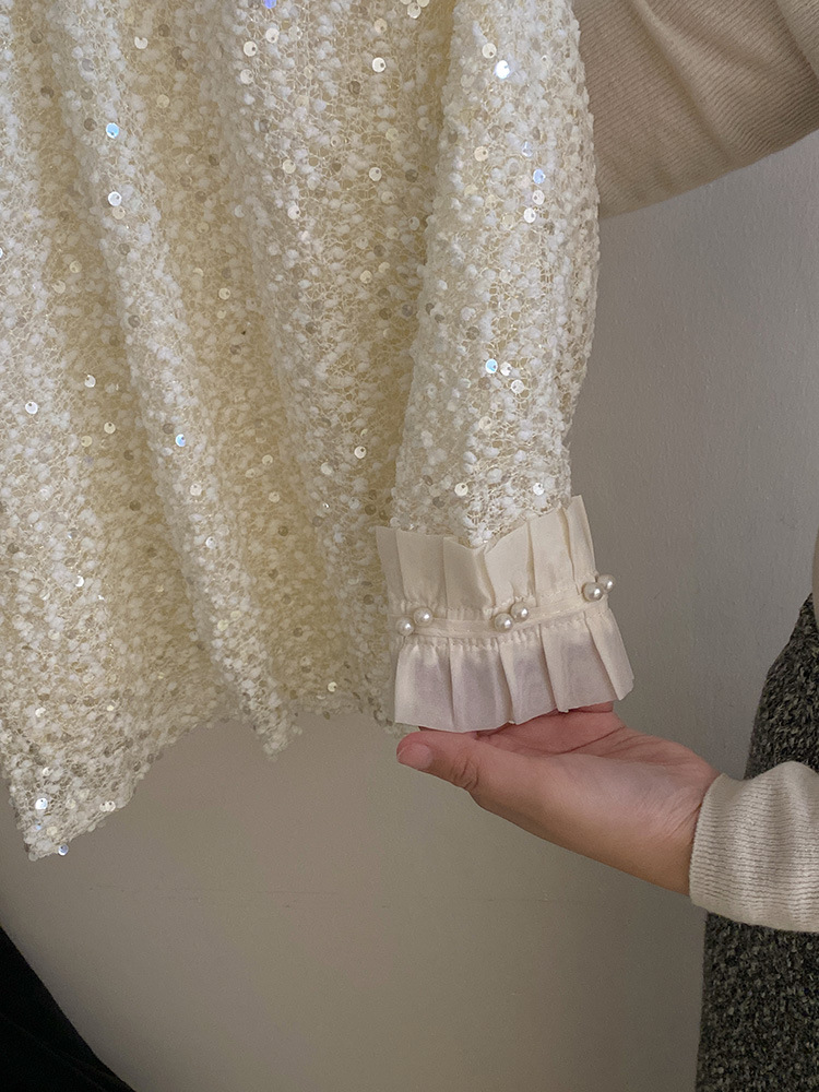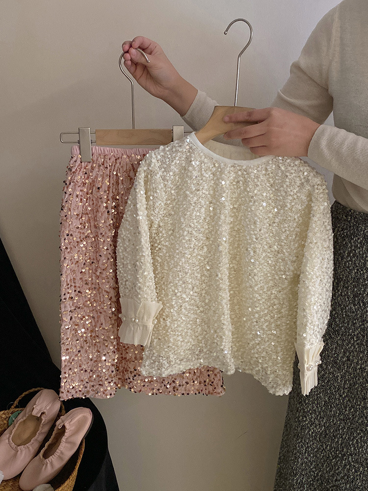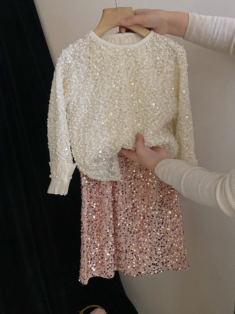 한국식 소녀 2024 봄 새로운 스팽글 커프 비즈 탑 스위트 핑크 스팽글 긴 스커트 유행 스커트스토어 가기