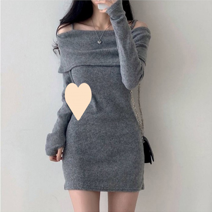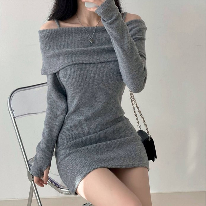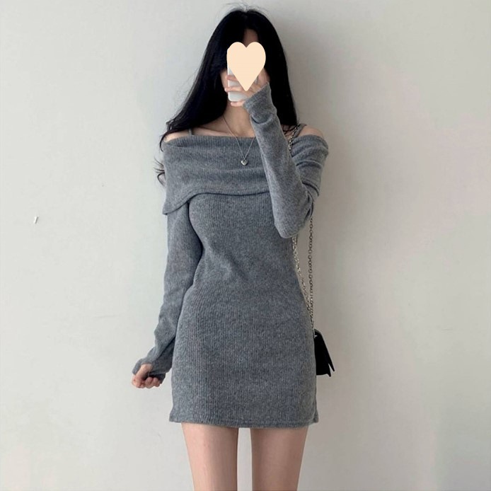 원피스 여성의 2023 순수한 욕망 가을과 겨울 새로운 어깨 스웨터 원피스 니트 어깨 허리 슬리밍 엉덩이 스커트