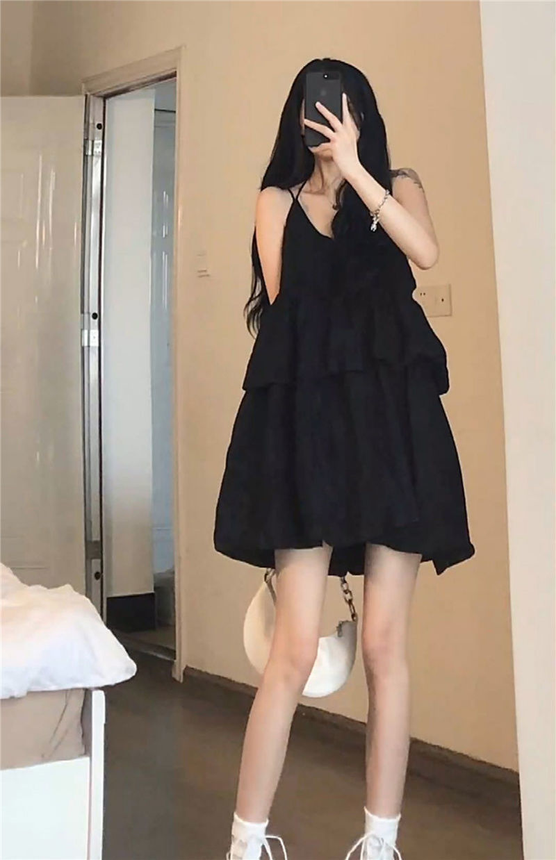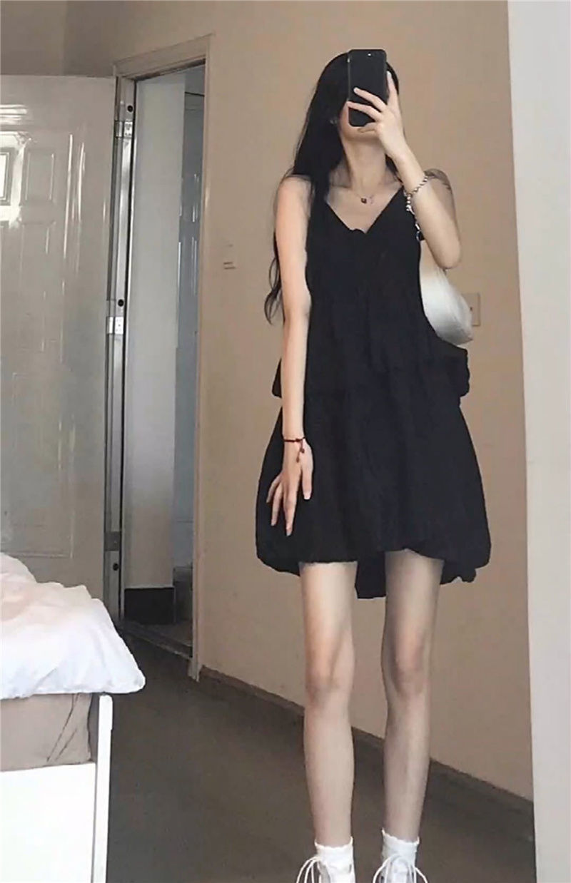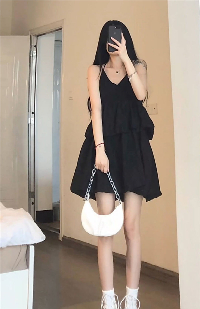 한국식 솔리드 컬러 러플 V 넥 쉬폰 민소매 스트랩 원피스 여자 여름 느슨한 A 라인 원피스 하이 허리 스트랩 원피스스토어 가기