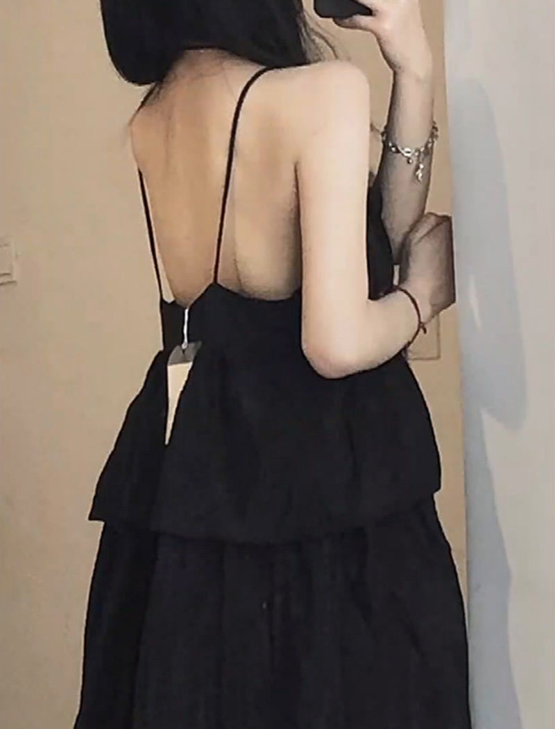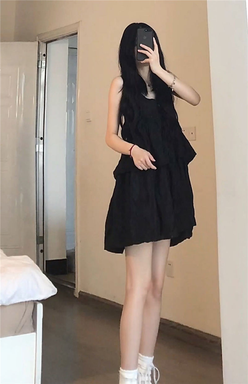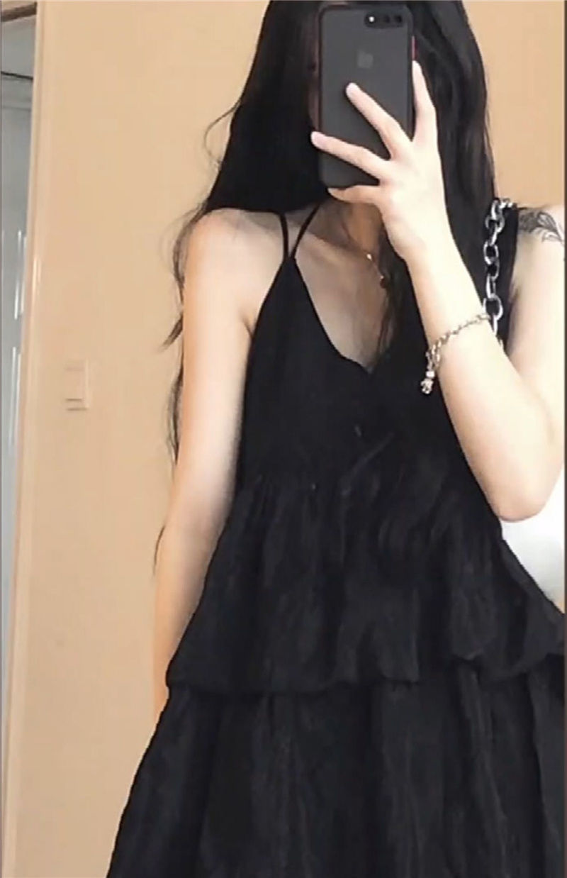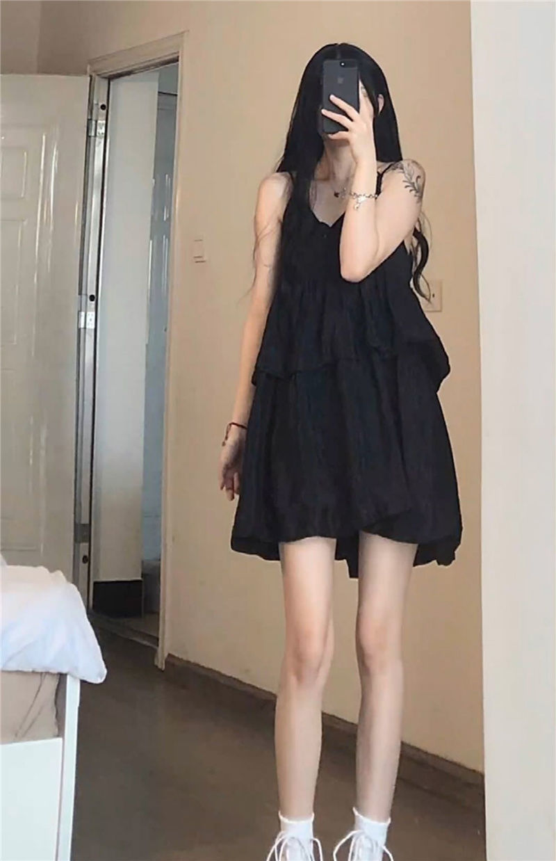 한국식 솔리드 컬러 러플 V 넥 쉬폰 민소매 스트랩 원피스 여자 여름 느슨한 A 라인 원피스 하이 허리 스트랩 원피스스토어 가기