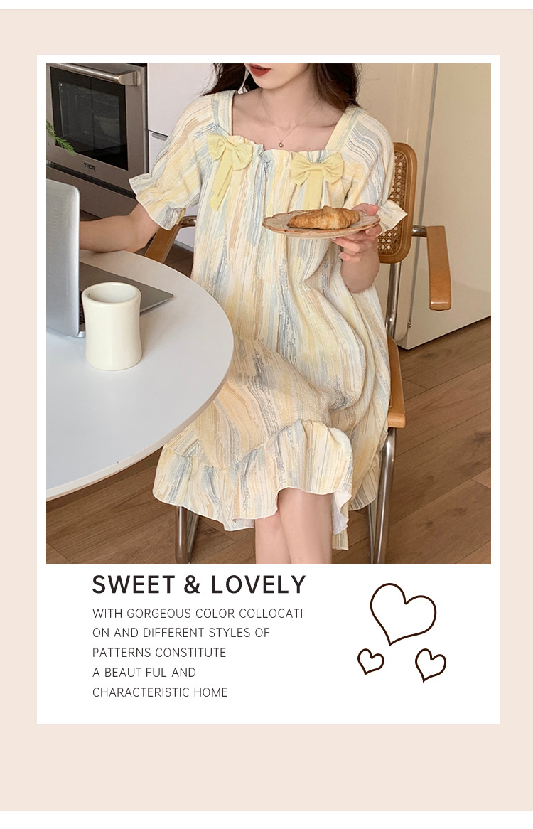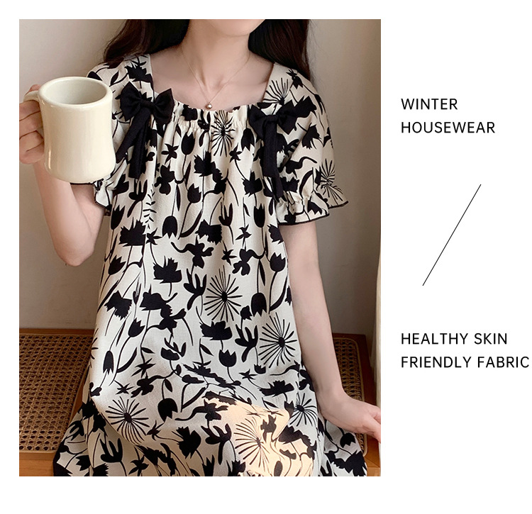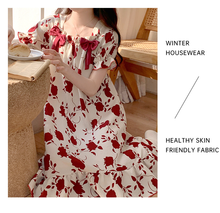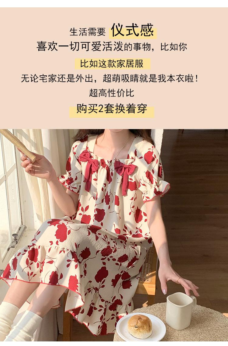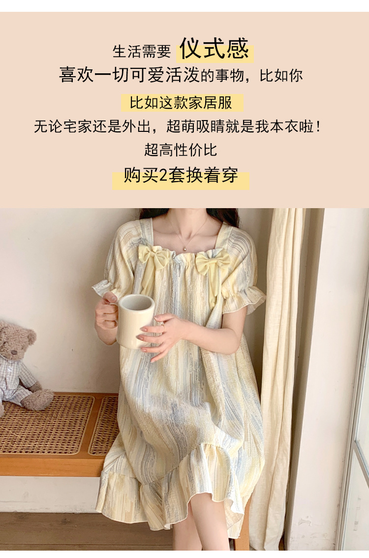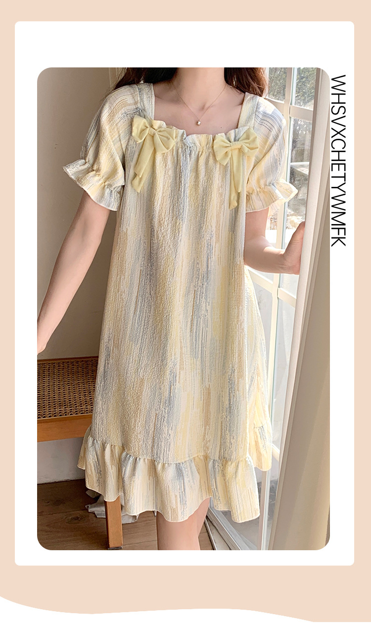 2024 새로운 잠옷 여성 여름 반팔 미디 원피스 공주 스타일 느슨한 거품 크레이프 홈 착용 공장 도매스토어 가기