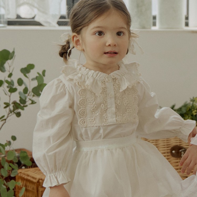 2025 가을 딸기 Shan 한국 소녀 소녀 어린이 우아한 면화 주름진 칼라 레이스 셔츠 재고 있음