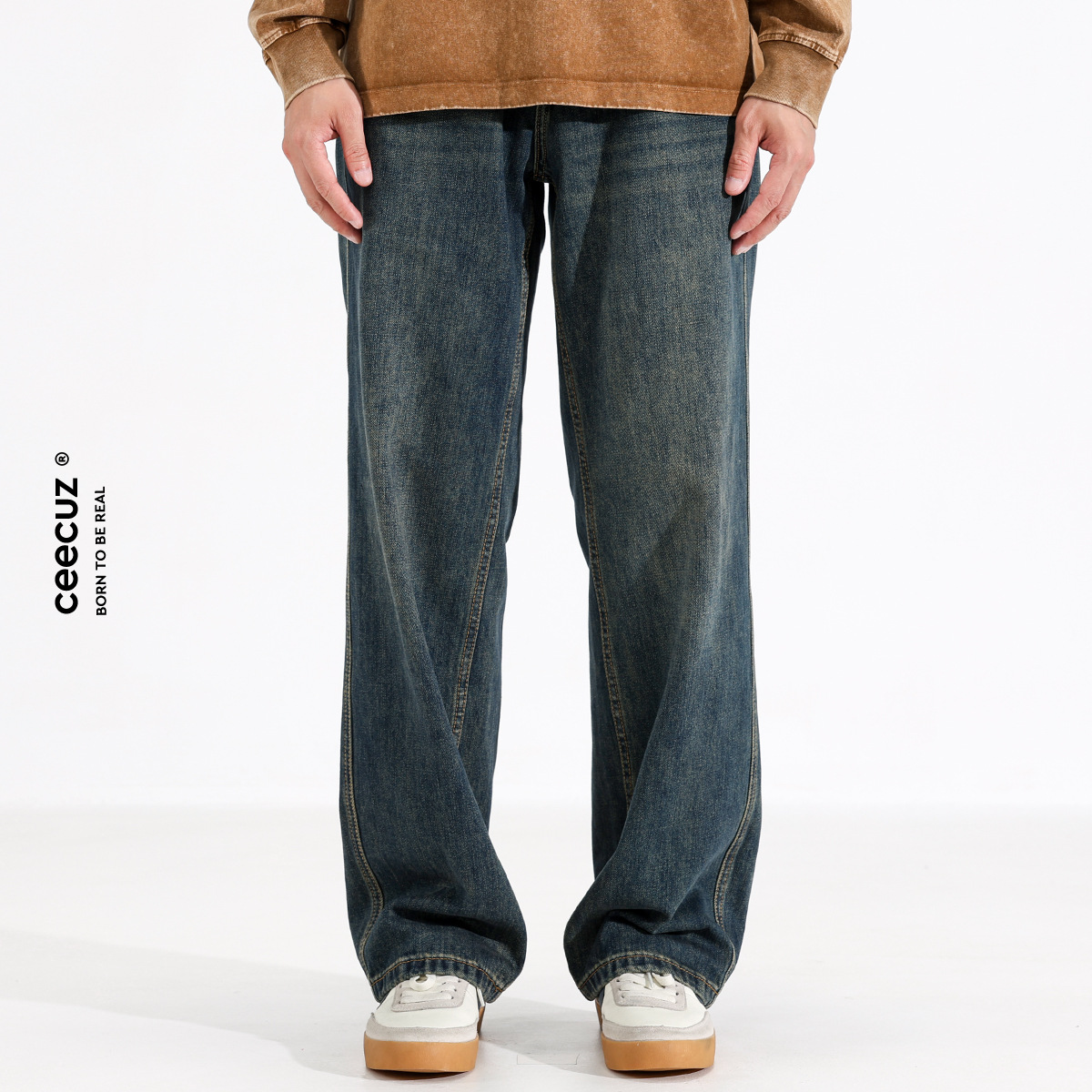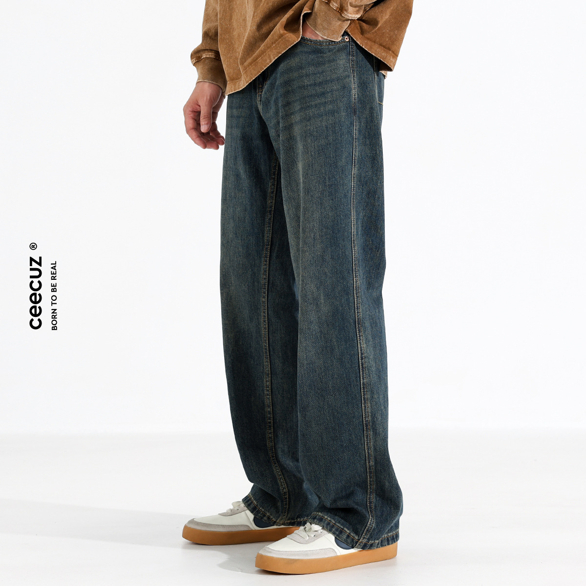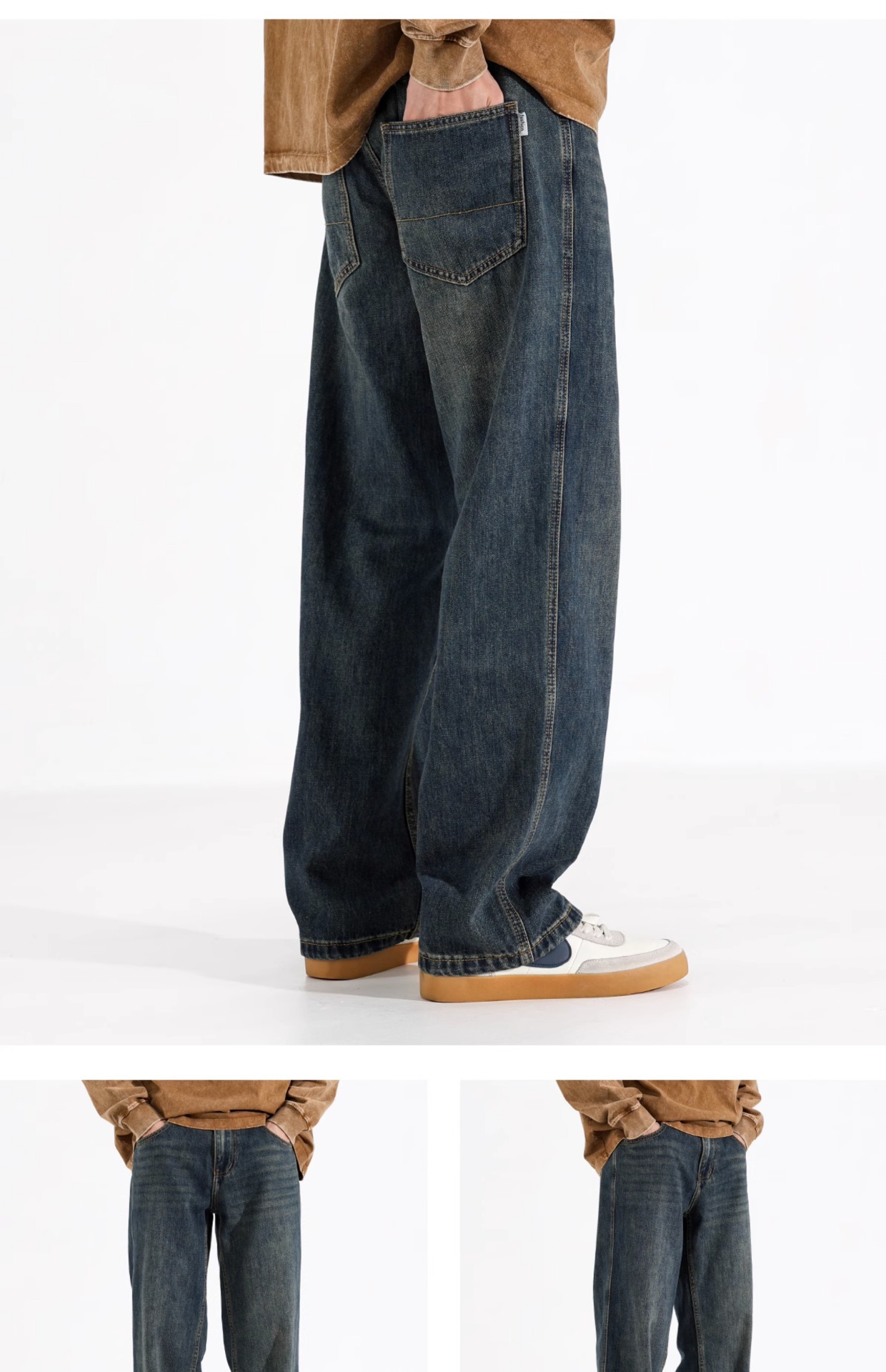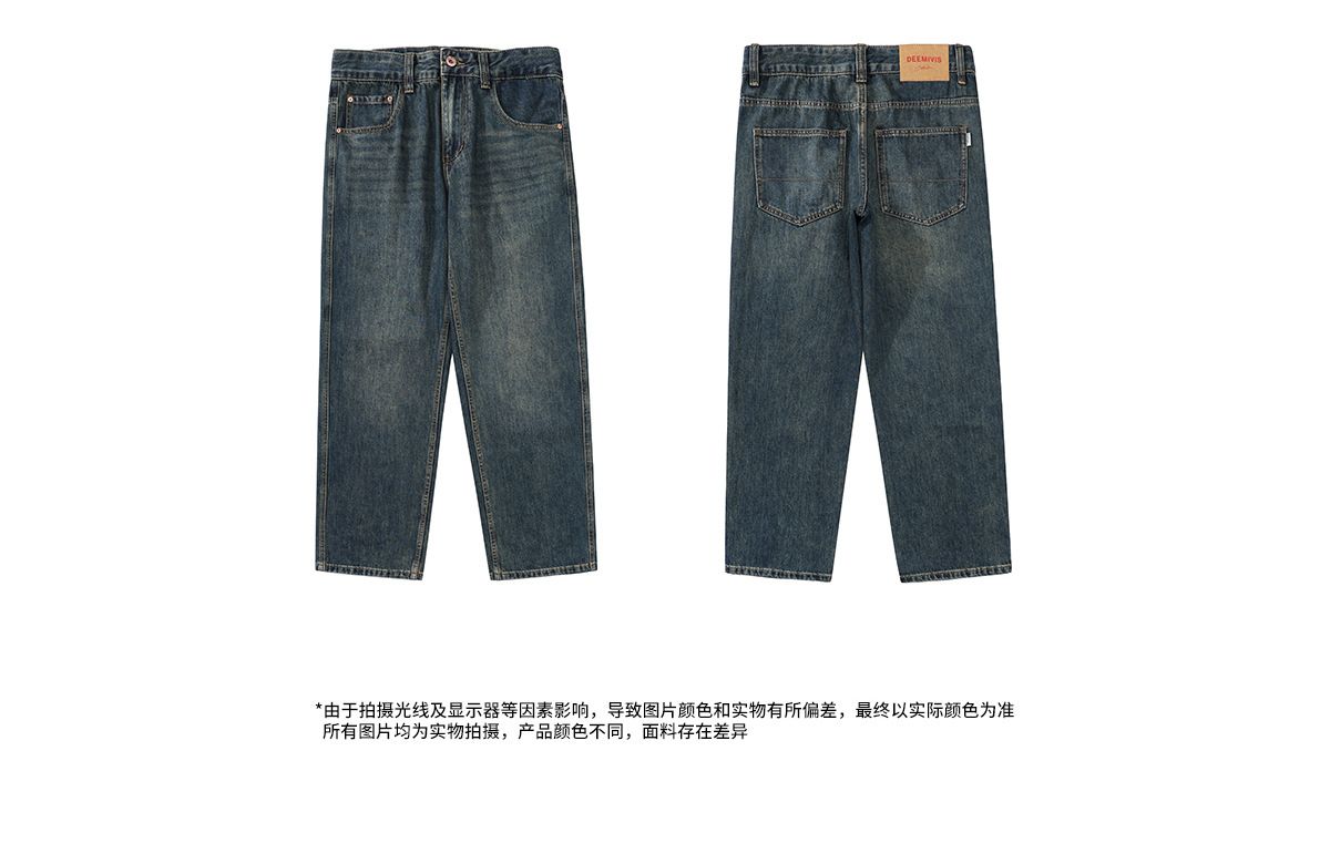 시쿠즈 가을 신상 아메리칸 레트로 스트레이트 플리스 안감 두꺼운 데님 팬츠 남성 루즈핏 큰 사이즈 와이드 레그 롱 팬츠스토어 가기