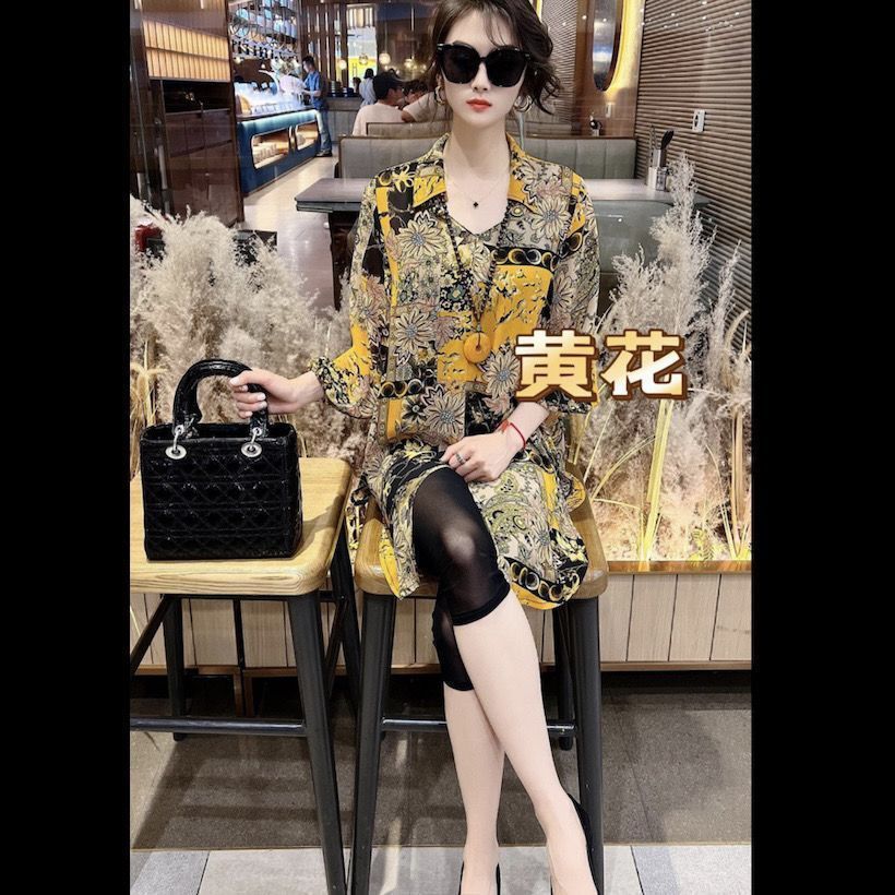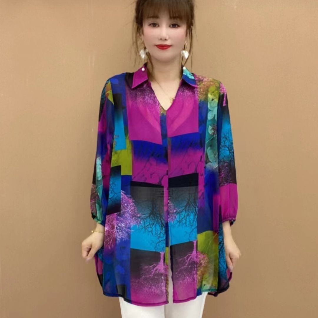 서양식 한국식 인쇄 풀오버 시폰 셔츠 여름 새로운 도착 느슨한 고기 커버 중간 길이 대형 셔츠 탑스토어 가기