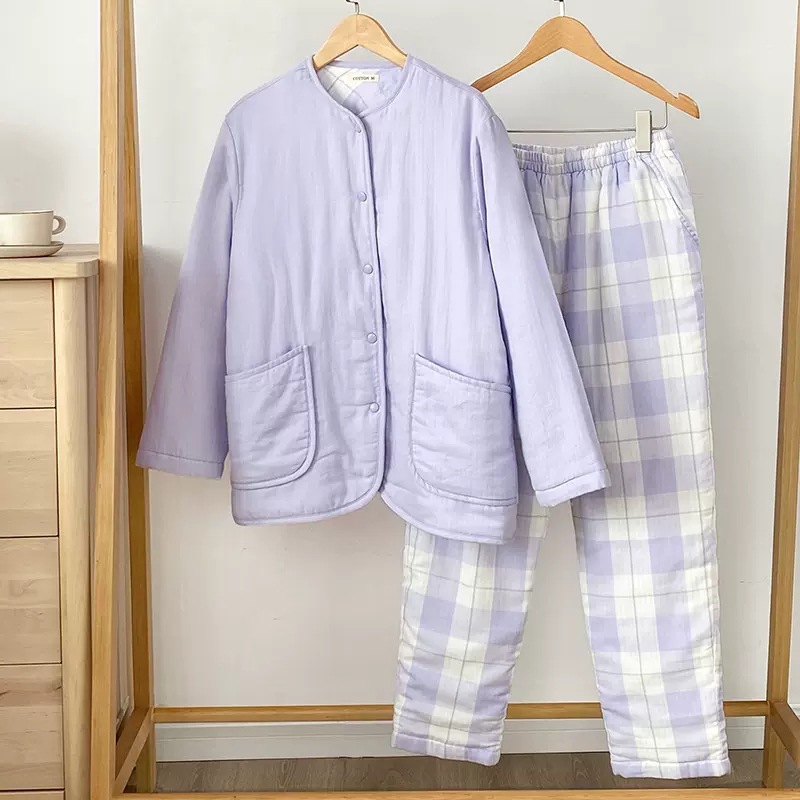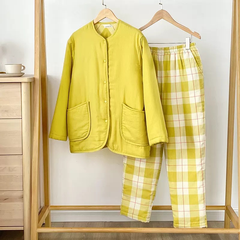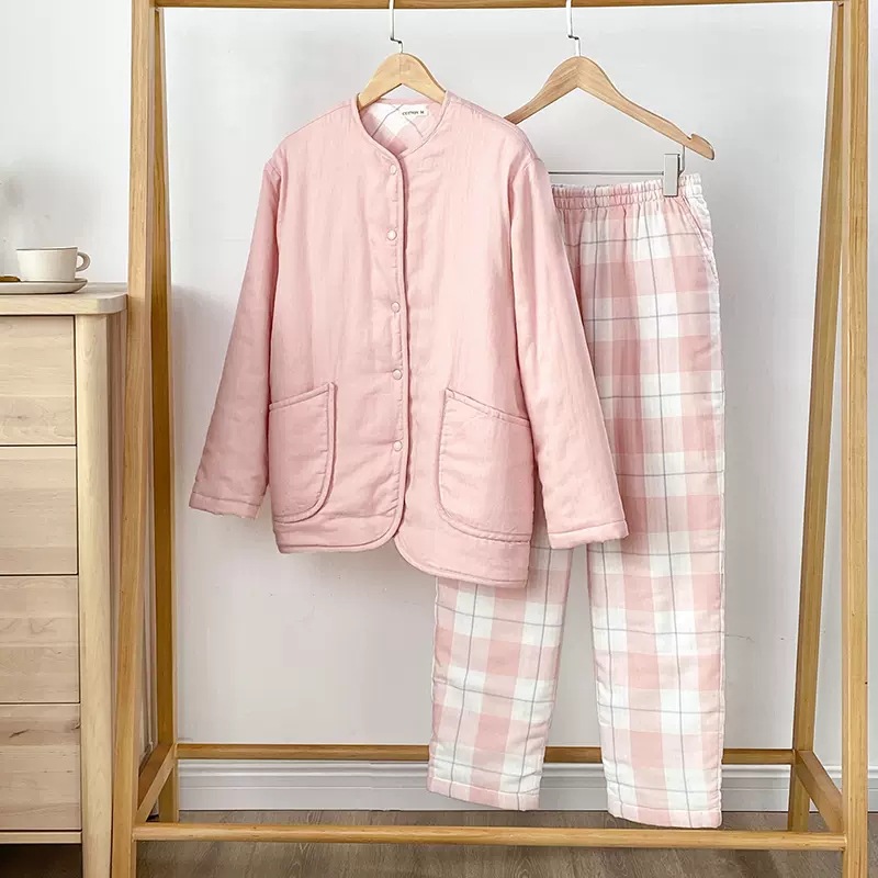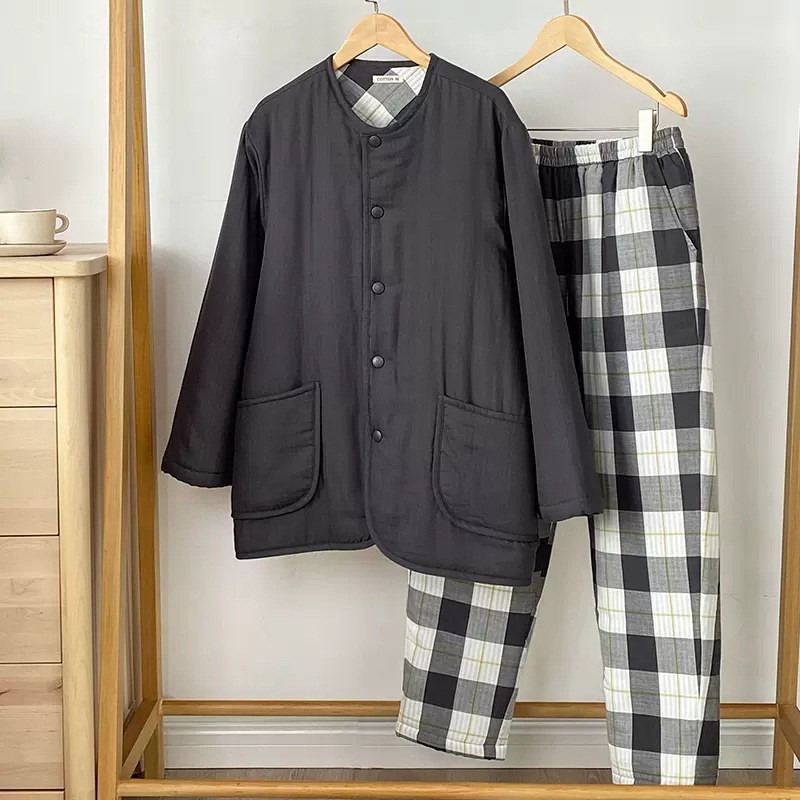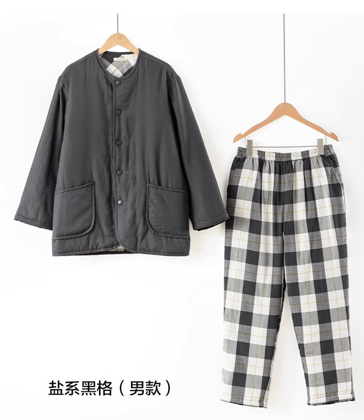 무인쇄 일본식 고급 순면 이중 거즈 누빔 잠옷 여성용 가을 겨울 홈웨어 남성용 외출복 면옷스토어 가기