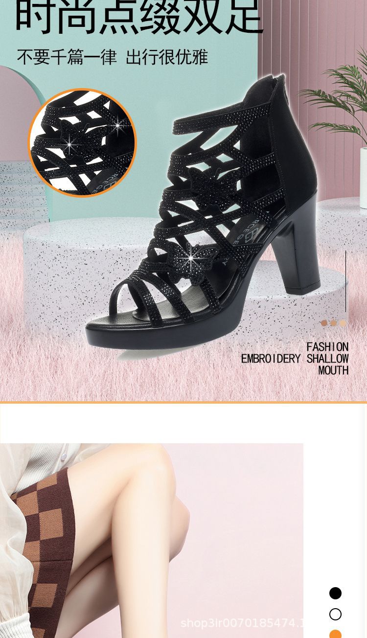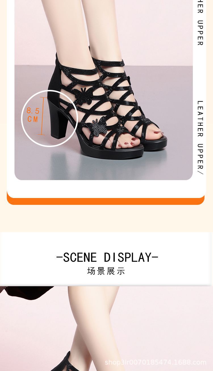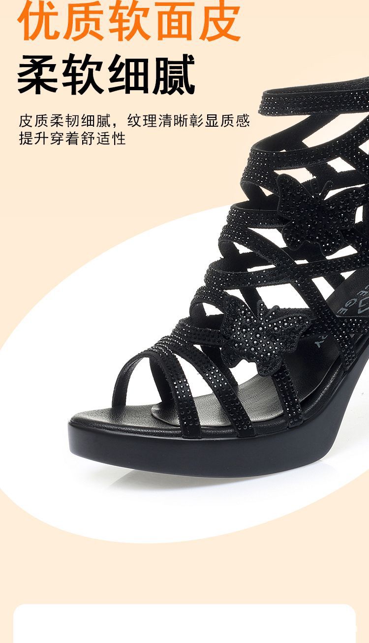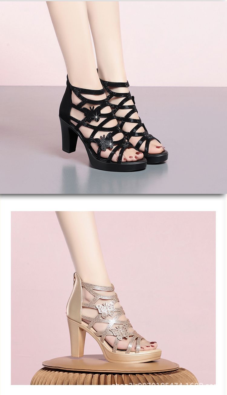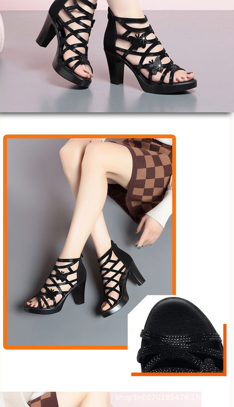 트루 소프트 가죽 샌들 여성용 2024 년 여름 새로운 오줌 발가락 신발 여성용 두꺼운 힐링 할로우 라인스톤 여성용 하이힐 샌들스토어 가기