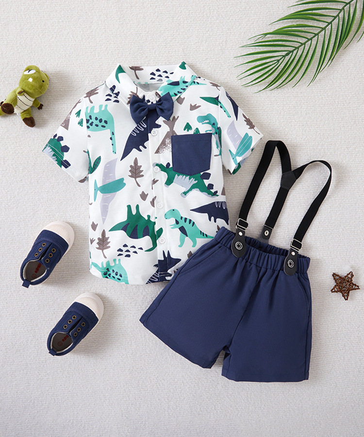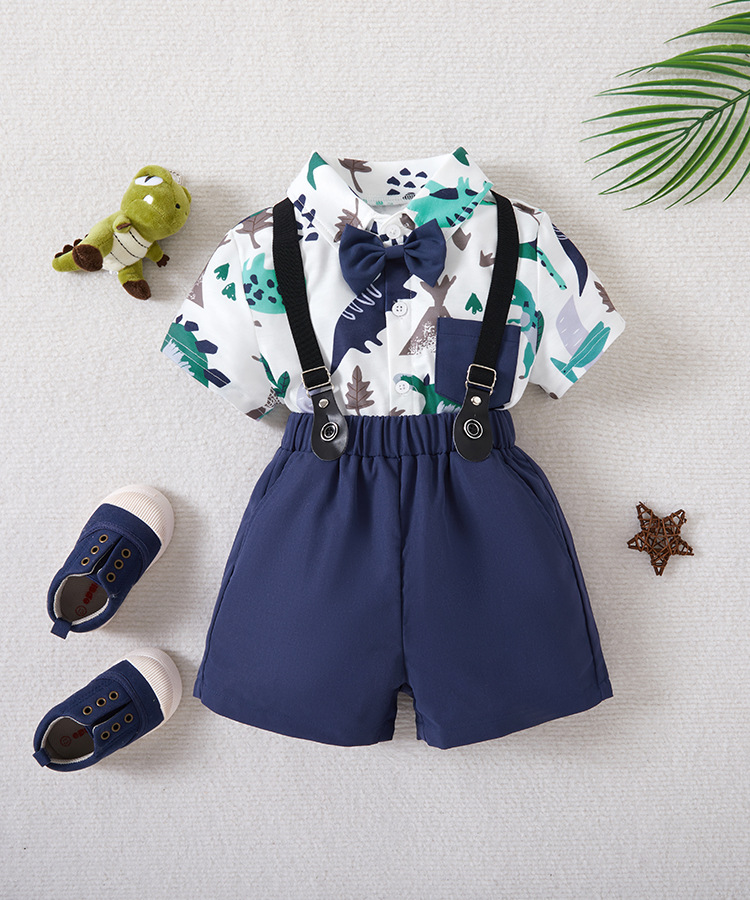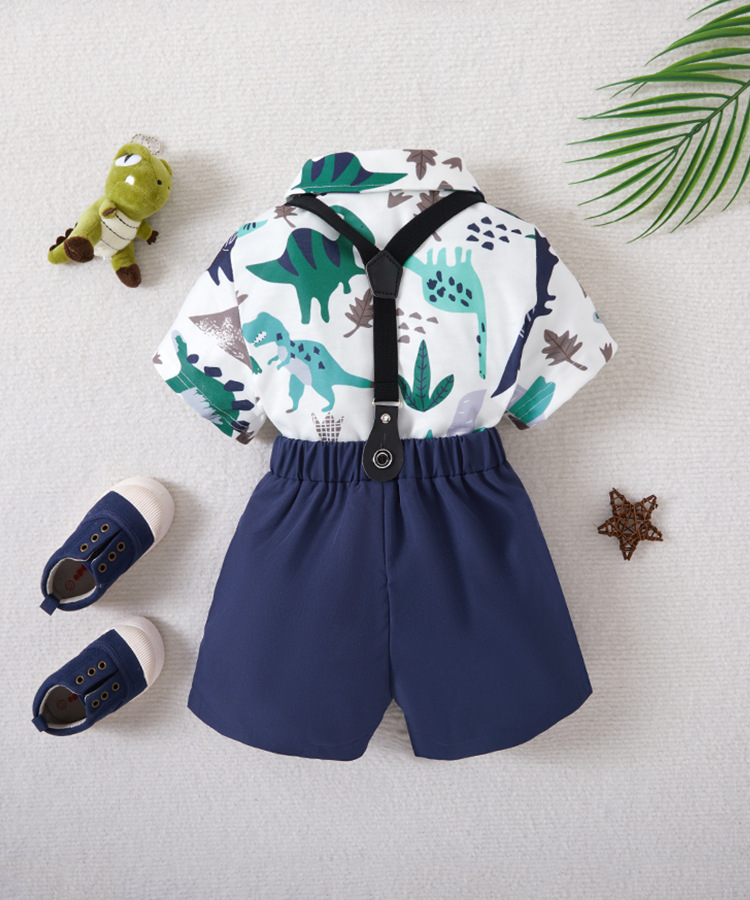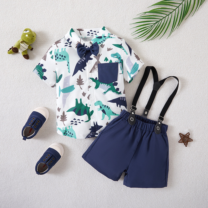 국경 간 소년의 여름 세트 아기 신사 바지 어린이 공룡 프린트 반팔 셔츠 나비 넥타이 투피스 세트