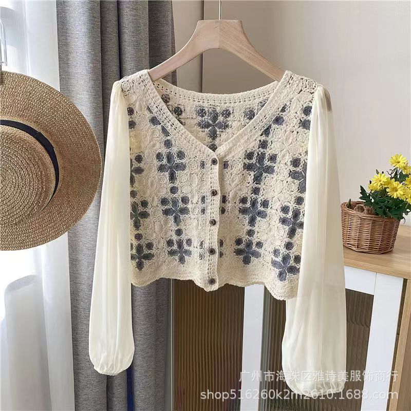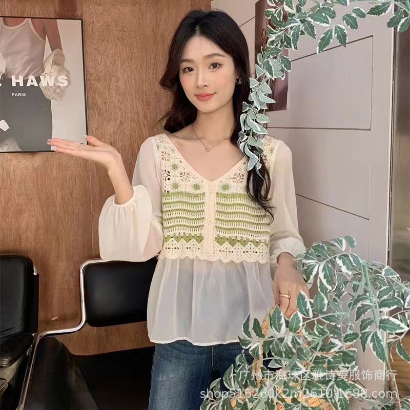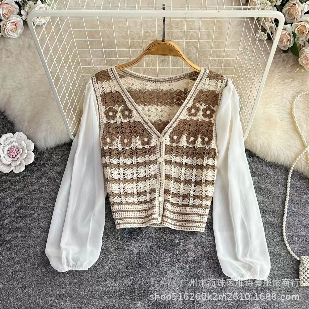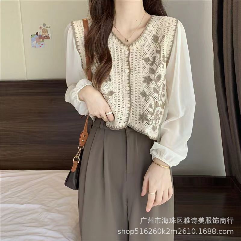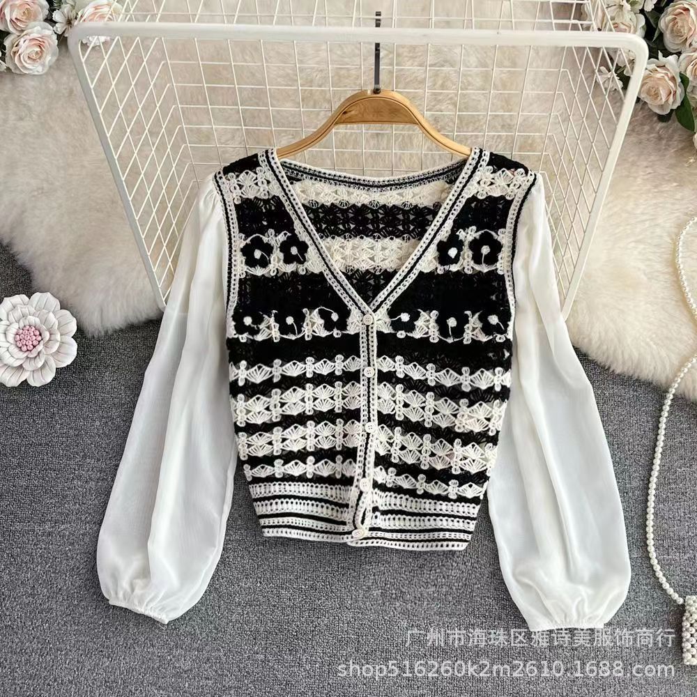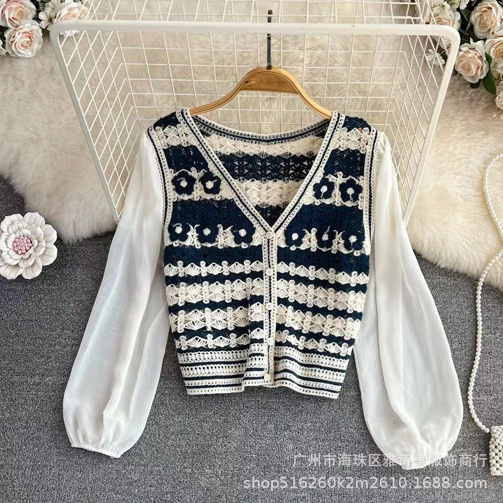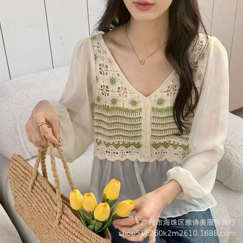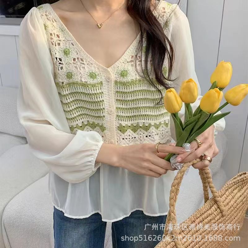 한국식 봄 새로운 스티칭 레이스 쉬폰 셔츠 여성용 그물 레드 스타일 웨스턴 스타일 니트 뜨개질 중공 긴팔 셔츠 패션스토어 가기