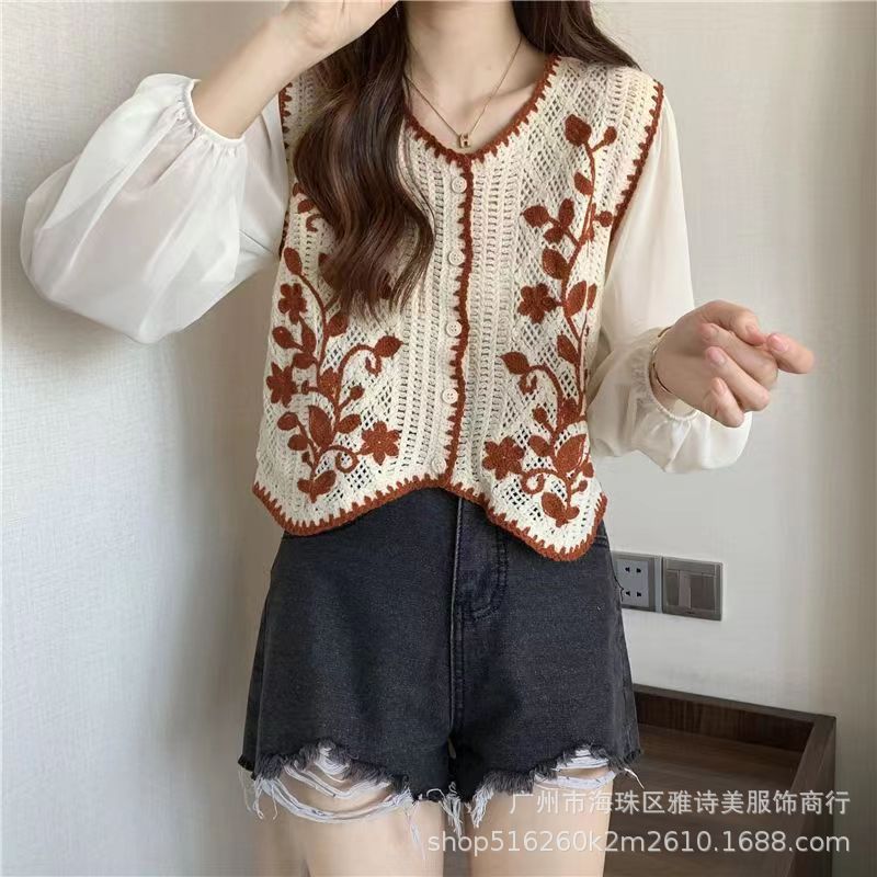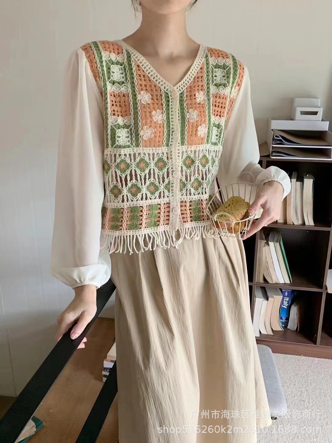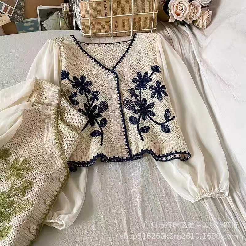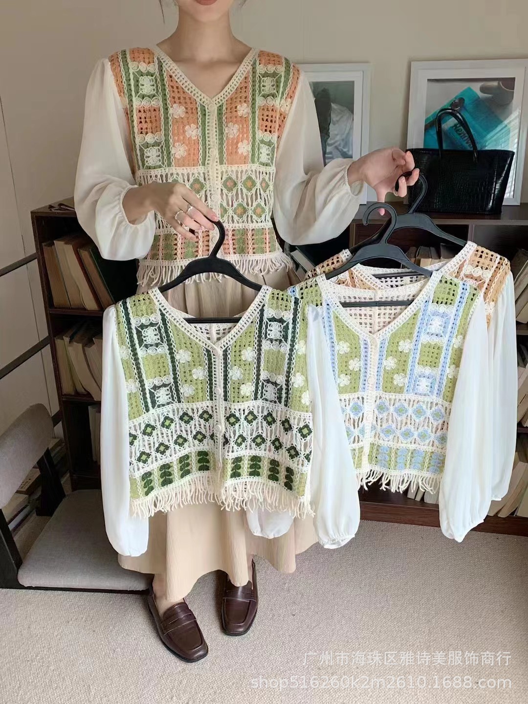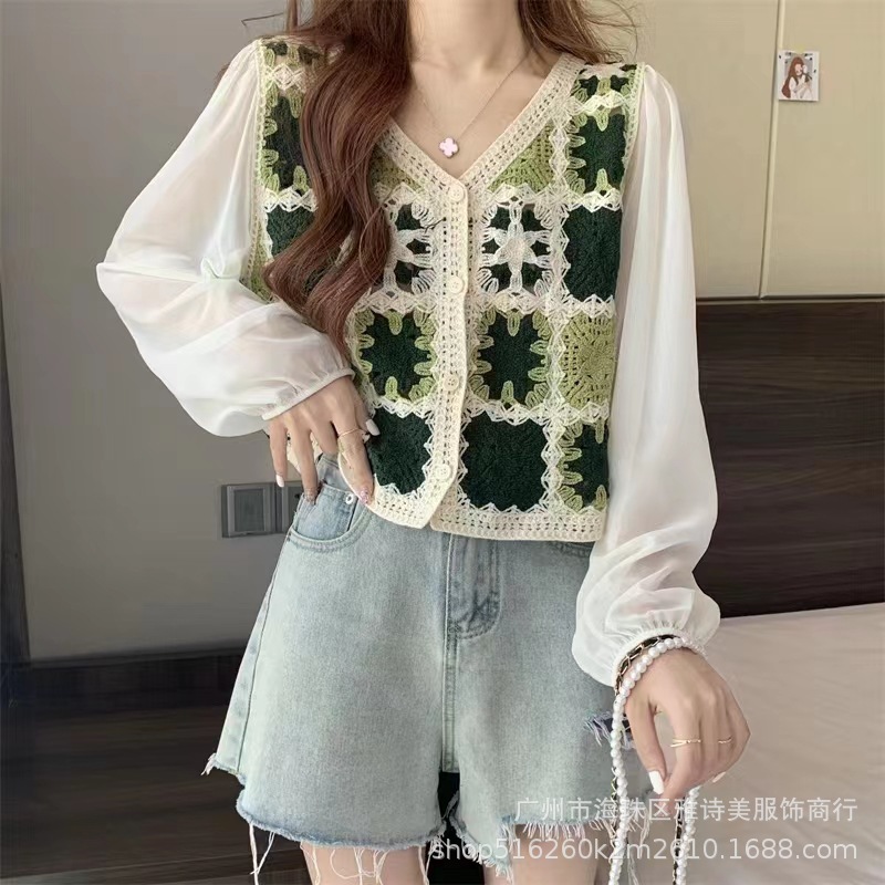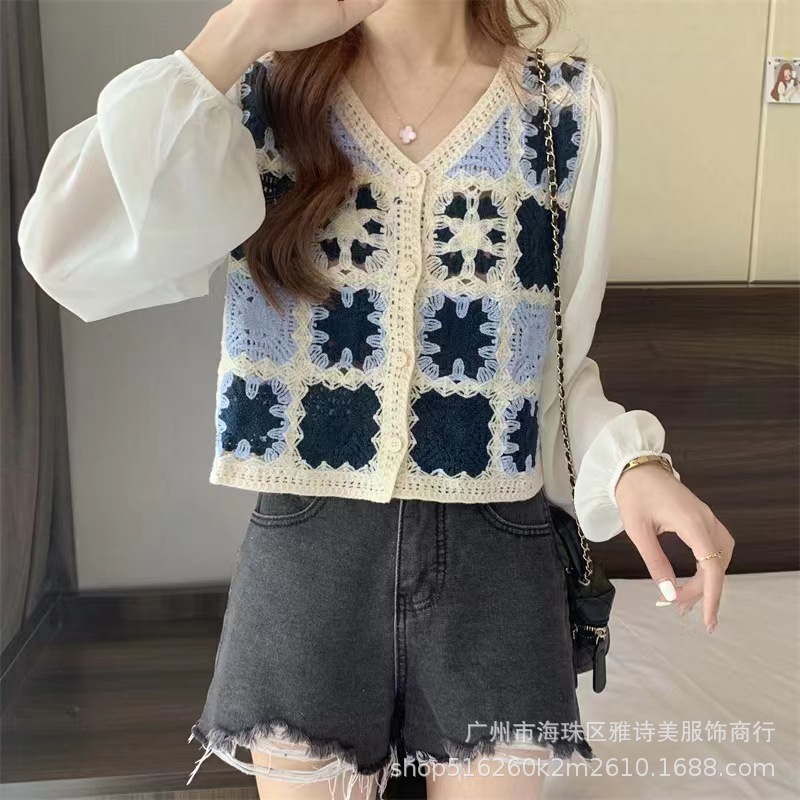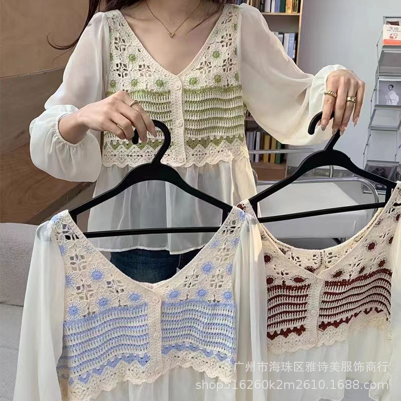 한국식 봄 새로운 스티칭 레이스 쉬폰 셔츠 여성용 그물 레드 스타일 웨스턴 스타일 니트 뜨개질 중공 긴팔 셔츠 패션스토어 가기