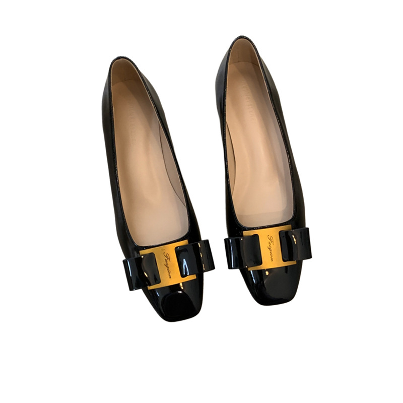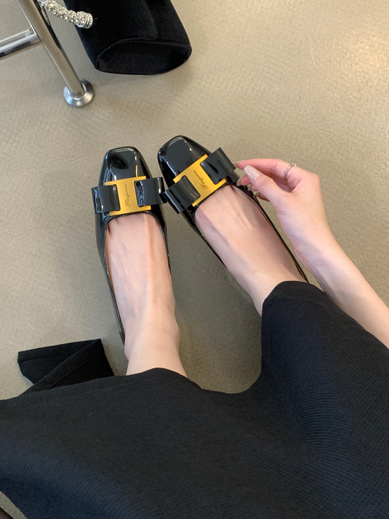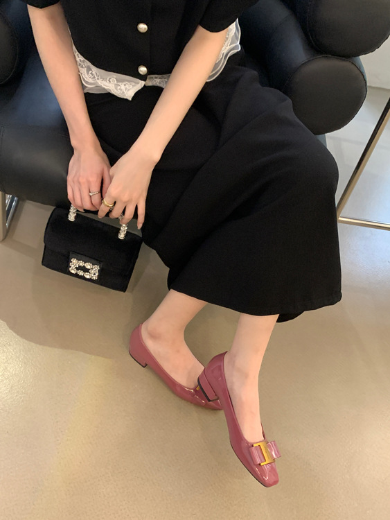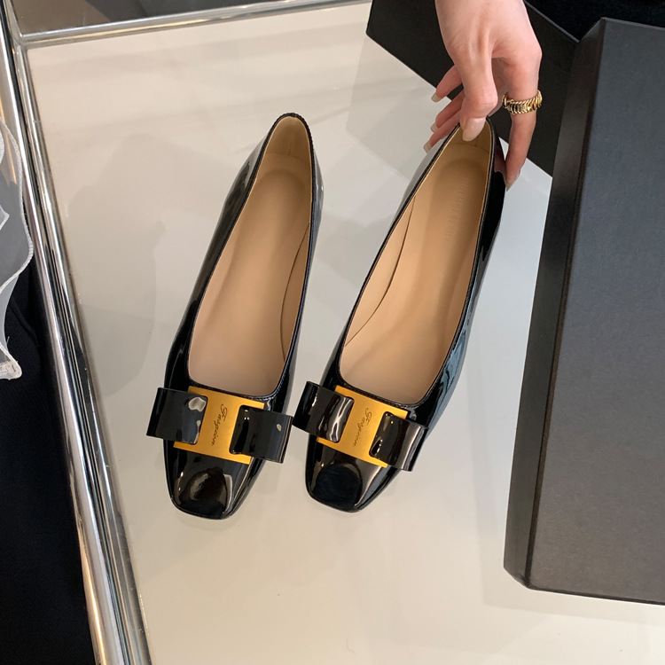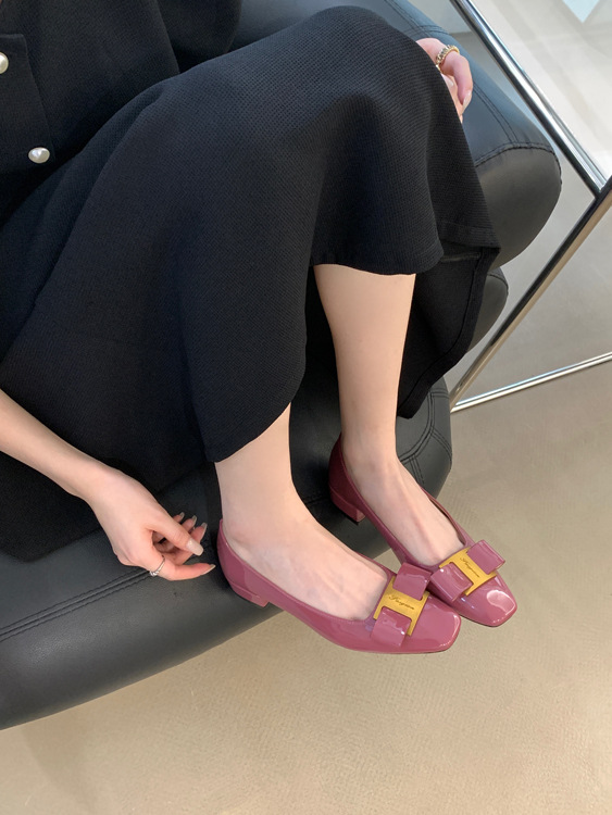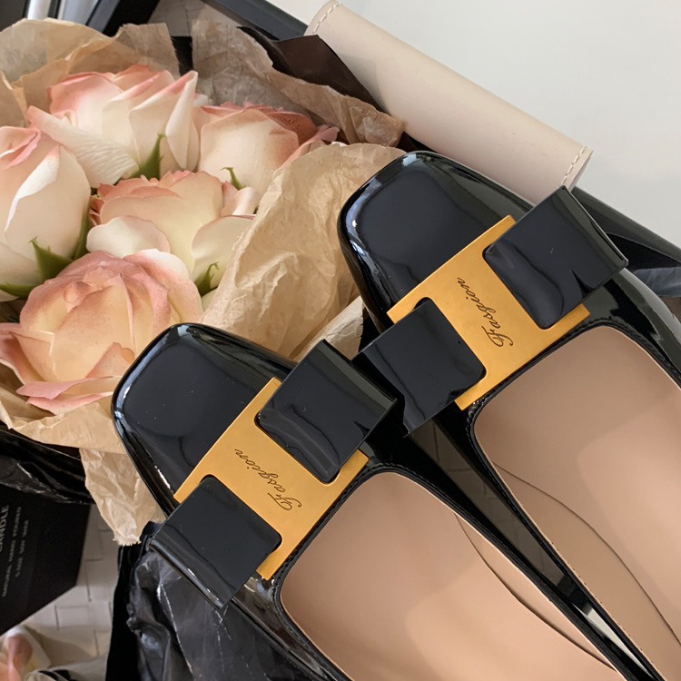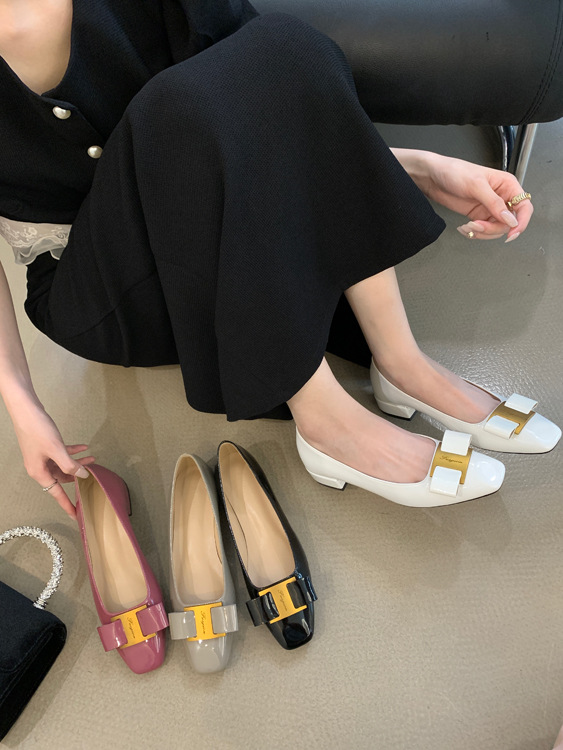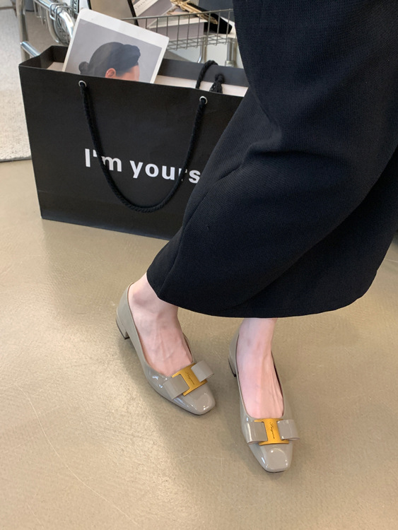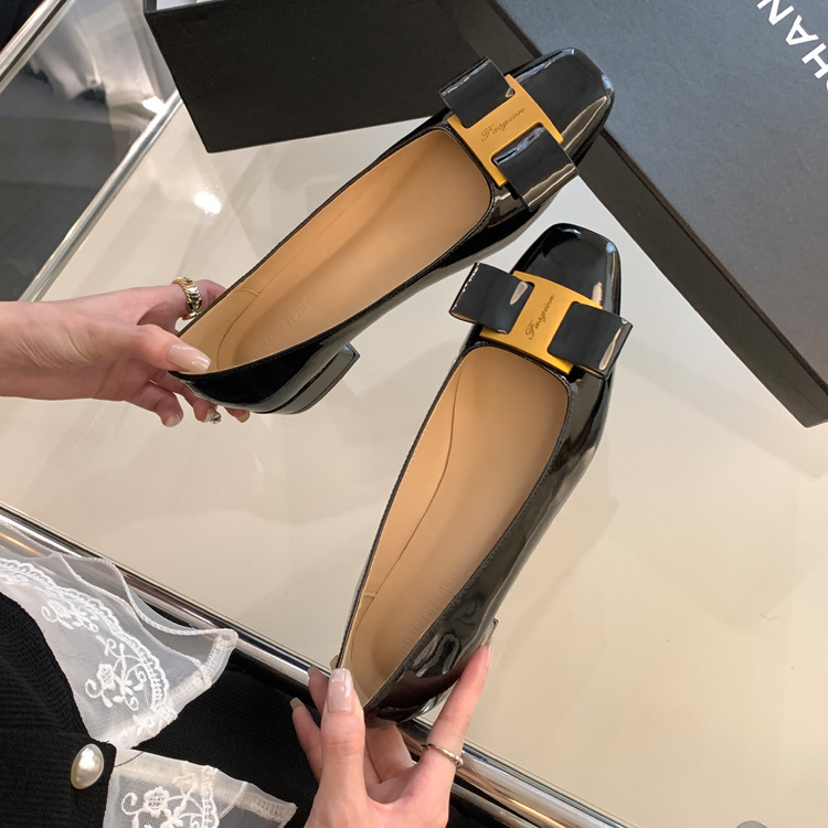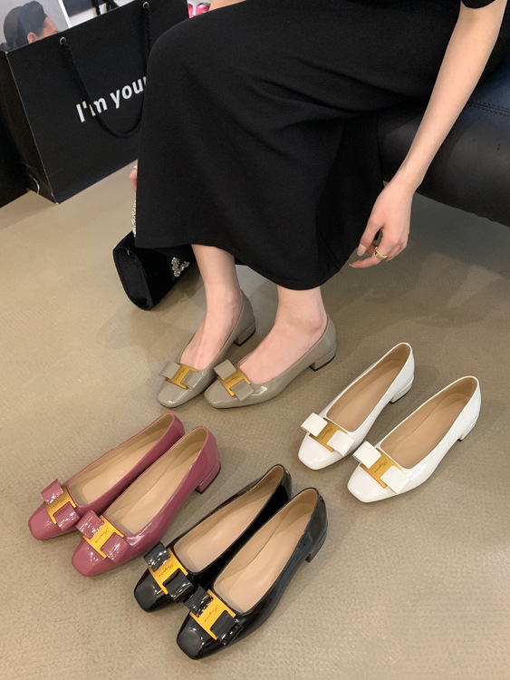 2026 봄 메탈 버클 에나멜 가죽 스퀘어 토 리본 장식 로우힐 여성용 오피스 워크 슈즈, 두꺼운 굽, 얕은 입구, 전문직용 싱글 슈즈