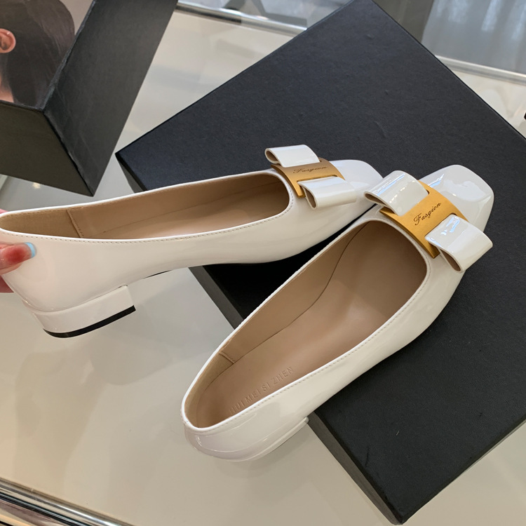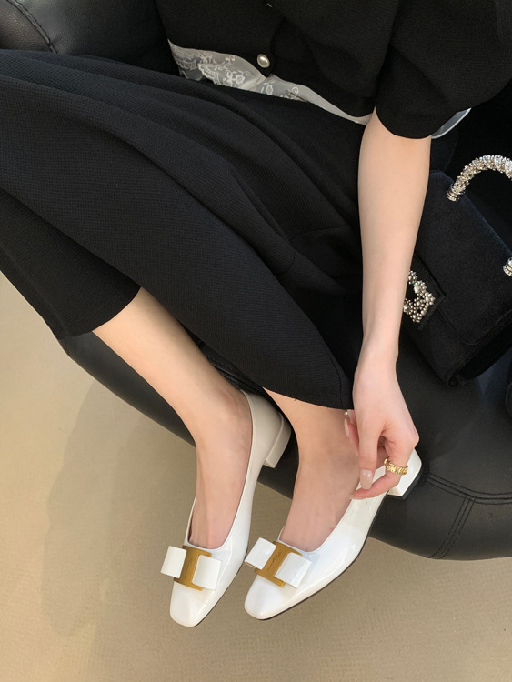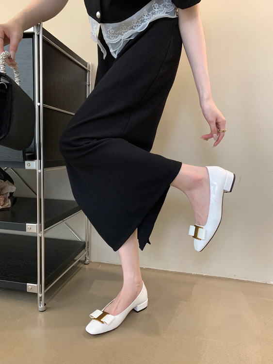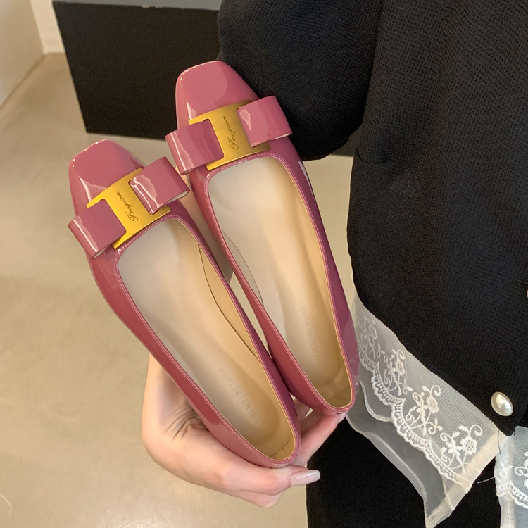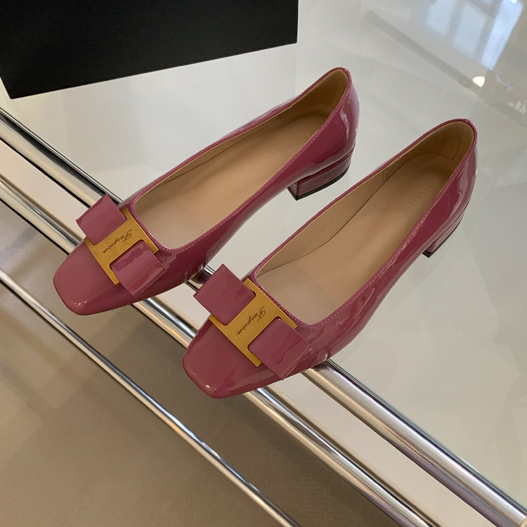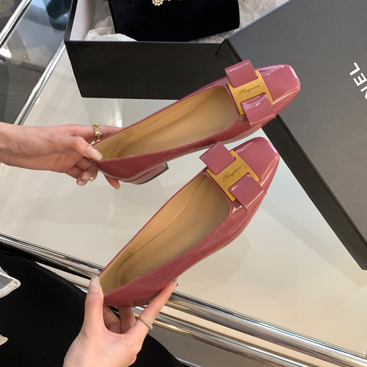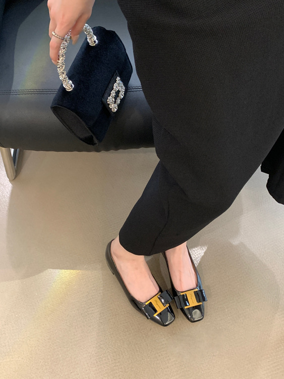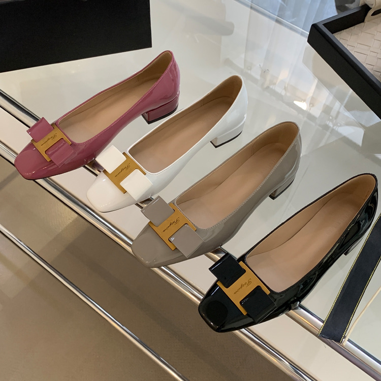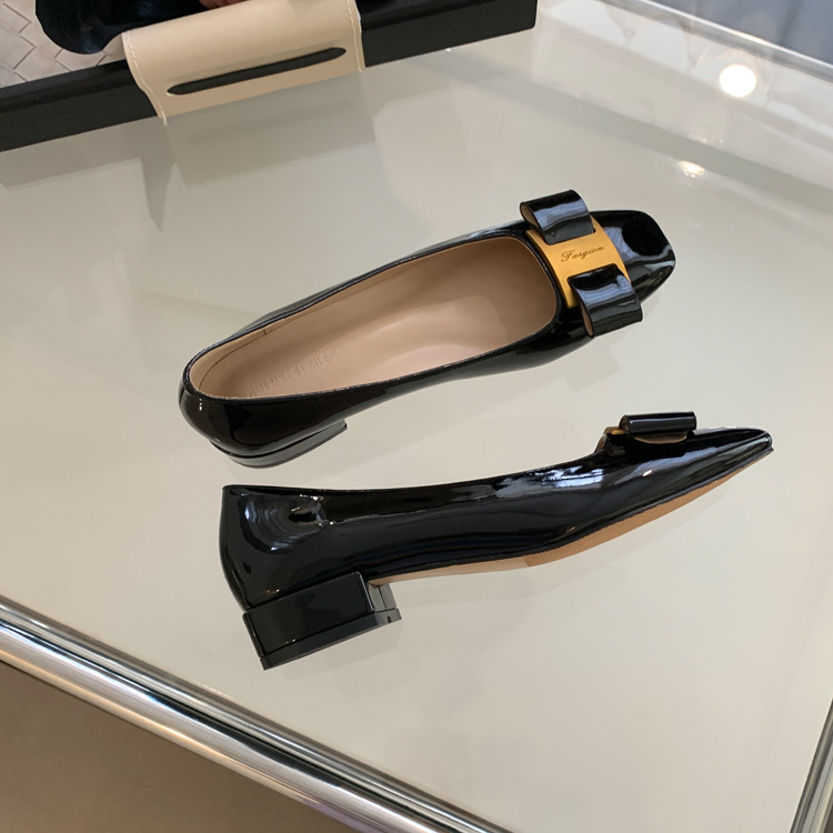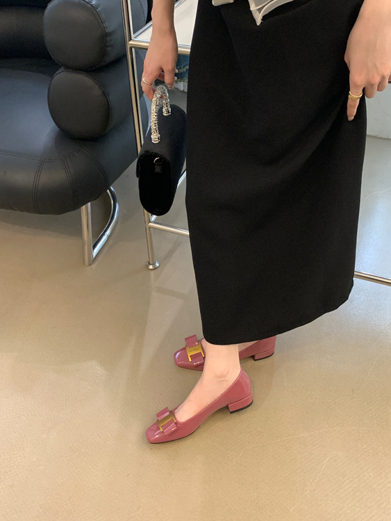 2026 봄 메탈 버클 에나멜 가죽 스퀘어 토 리본 장식 로우힐 여성용 오피스 워크 슈즈, 두꺼운 굽, 얕은 입구, 전문직용 싱글 슈즈