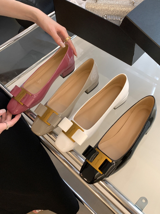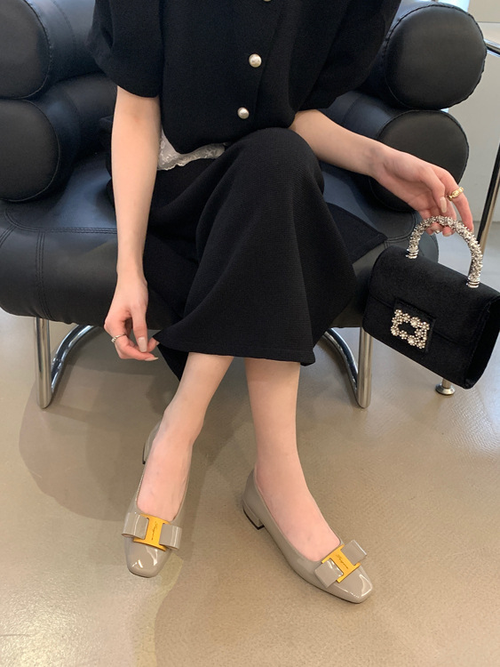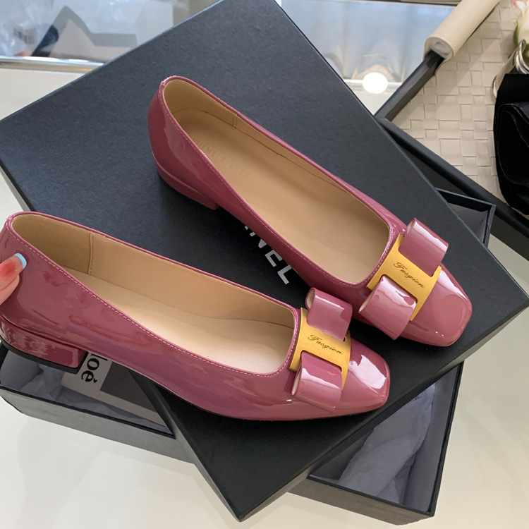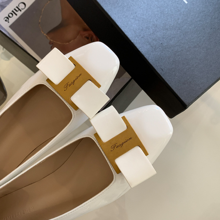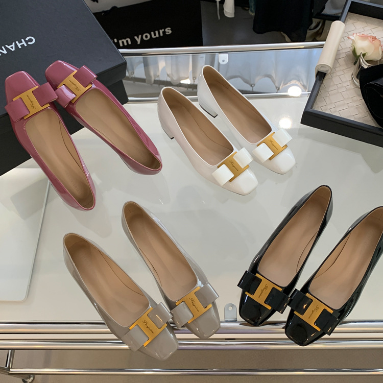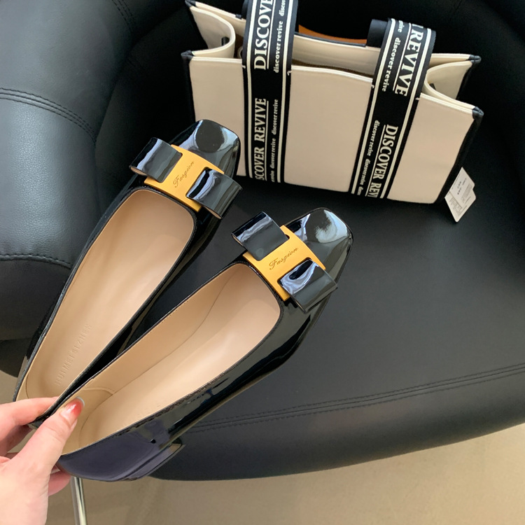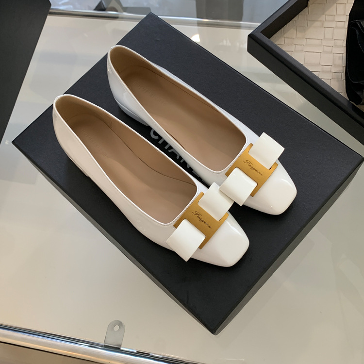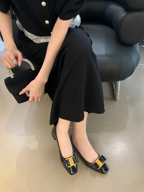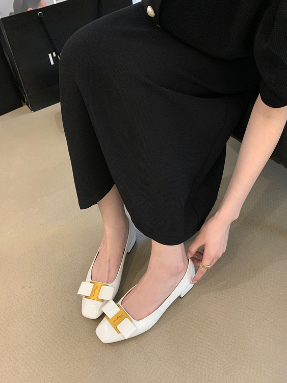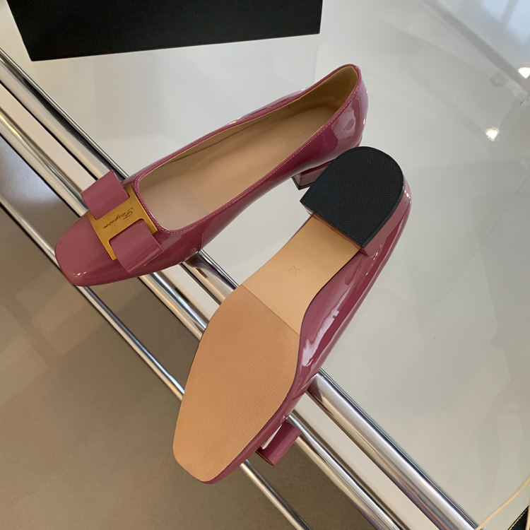 2026 봄 메탈 버클 에나멜 가죽 스퀘어 토 리본 장식 로우힐 여성용 오피스 워크 슈즈, 두꺼운 굽, 얕은 입구, 전문직용 싱글 슈즈