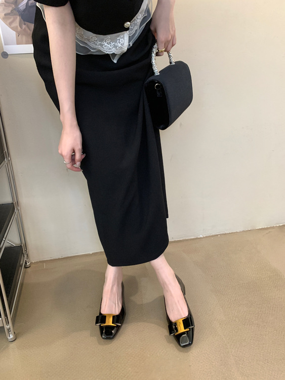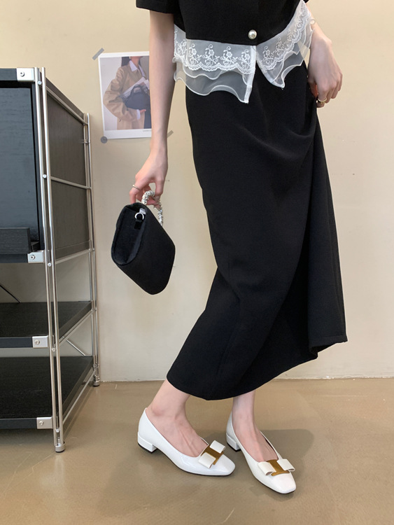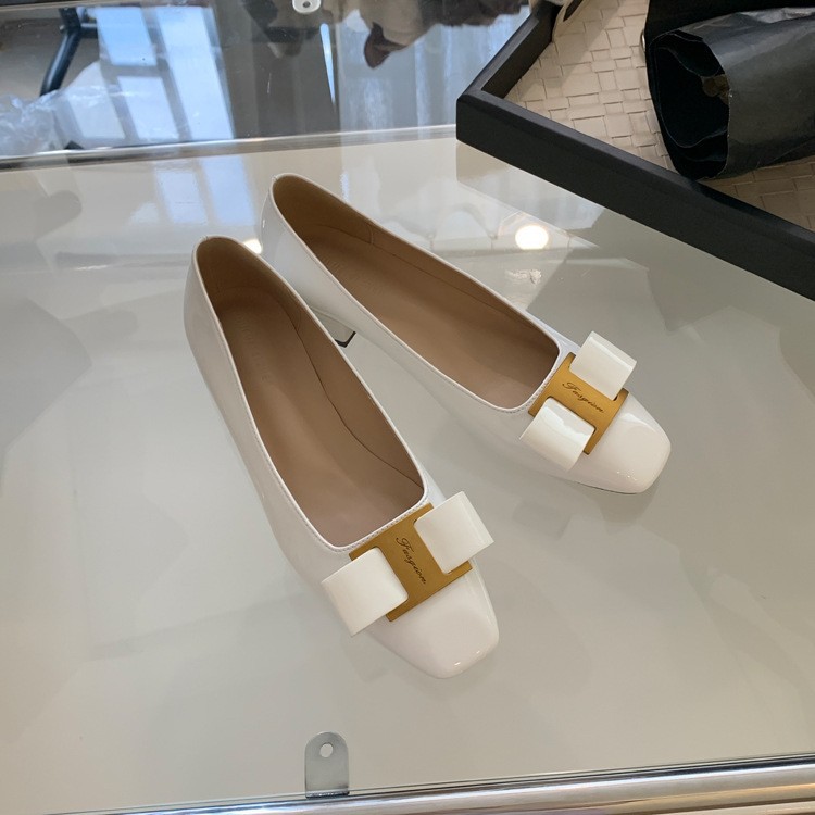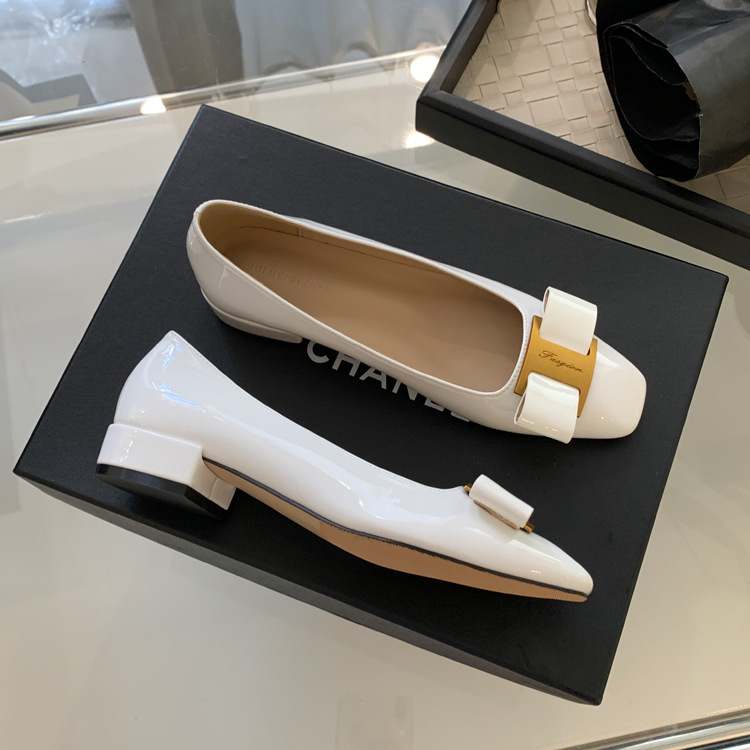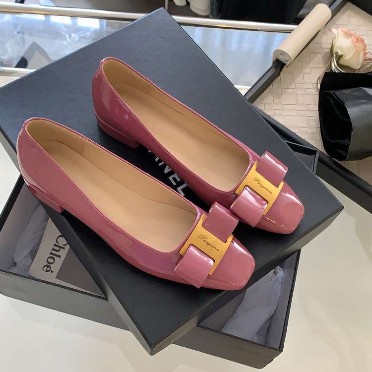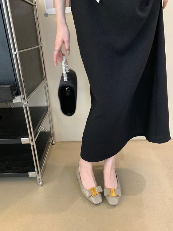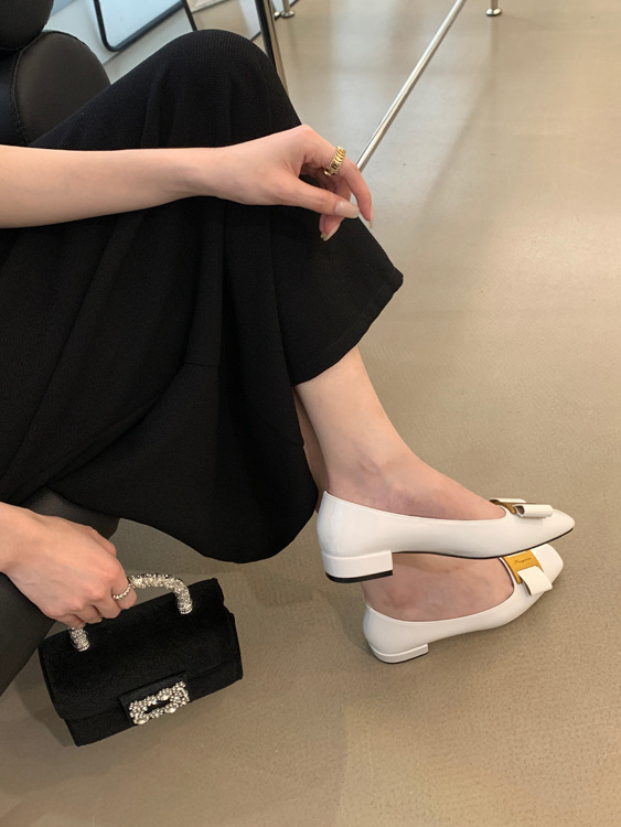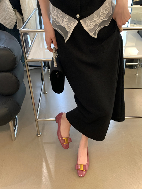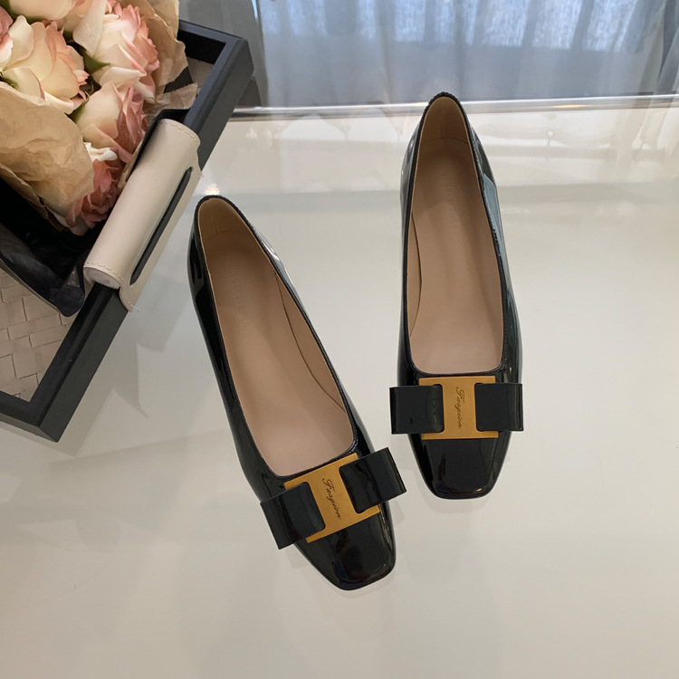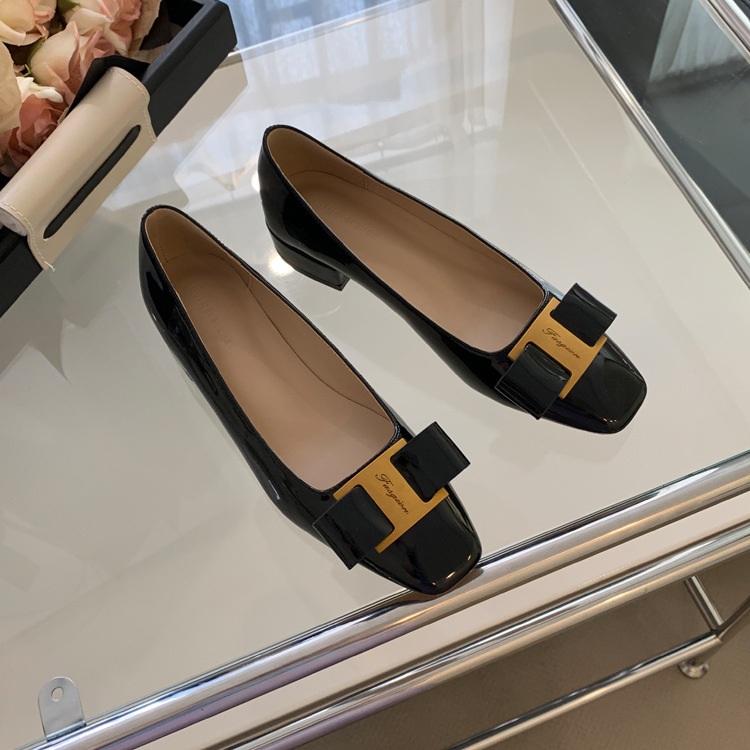2026 봄 메탈 버클 에나멜 가죽 스퀘어 토 리본 장식 로우힐 여성용 오피스 워크 슈즈, 두꺼운 굽, 얕은 입구, 전문직용 싱글 슈즈