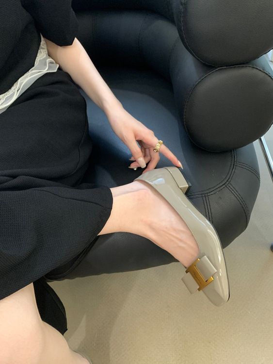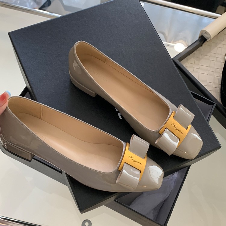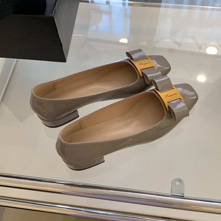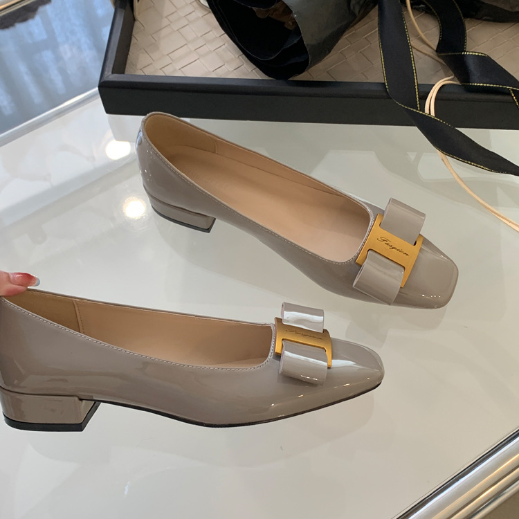 2026 봄 메탈 버클 에나멜 가죽 스퀘어 토 리본 장식 로우힐 여성용 오피스 워크 슈즈, 두꺼운 굽, 얕은 입구, 전문직용 싱글 슈즈스토어 가기