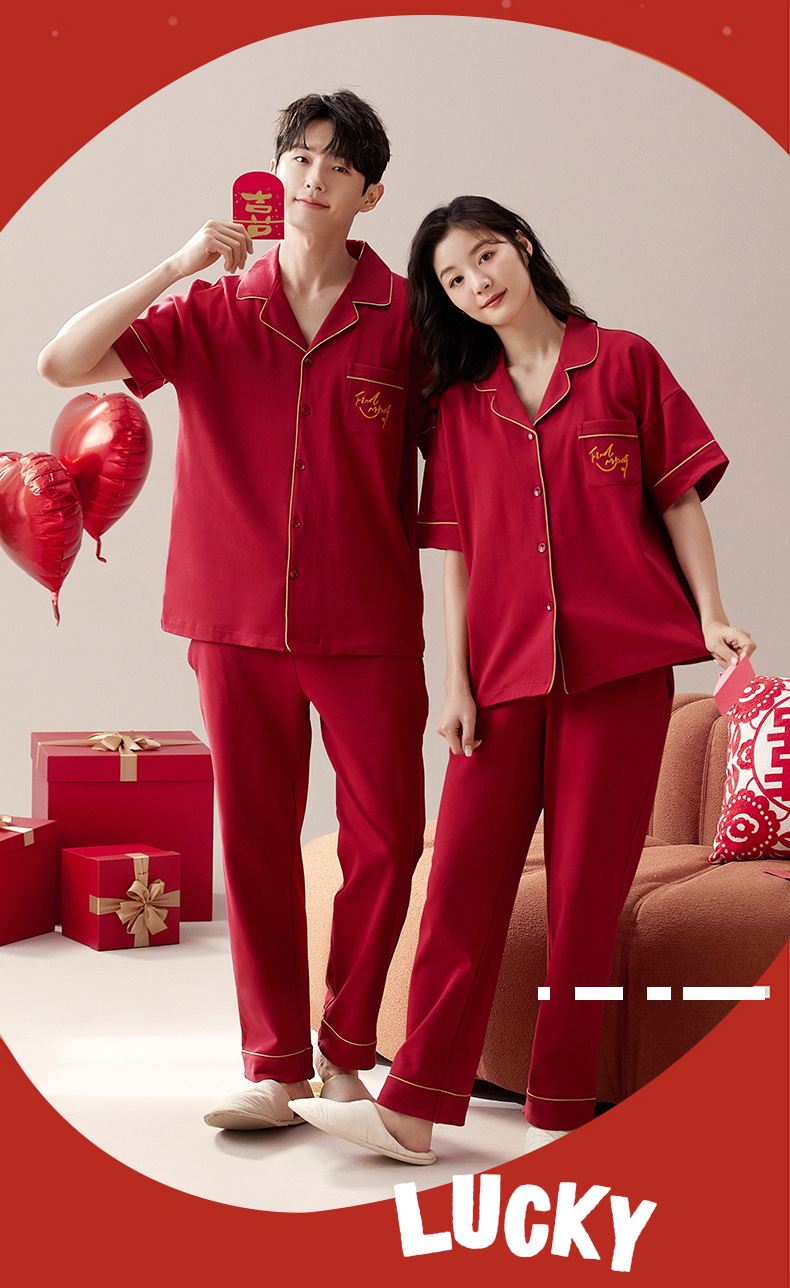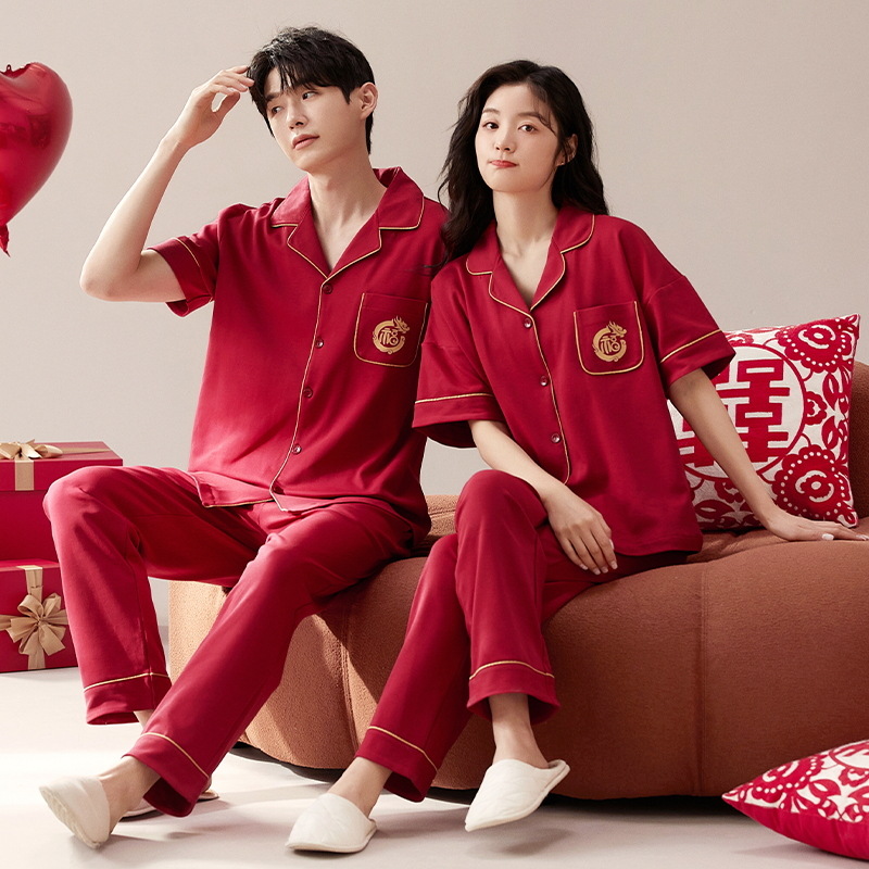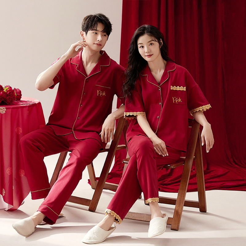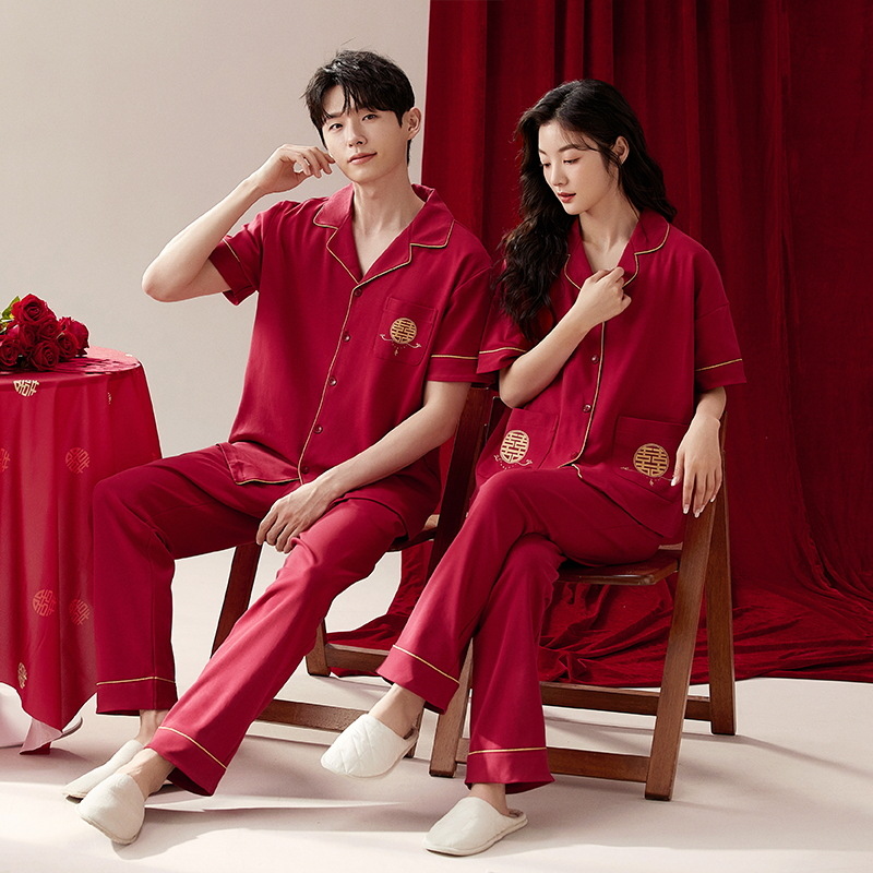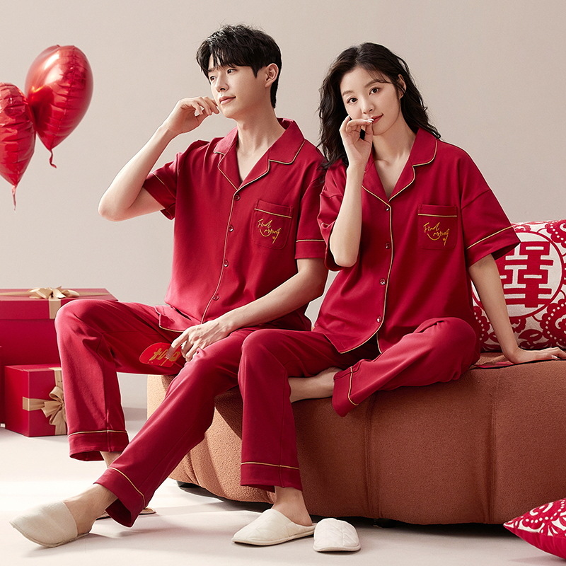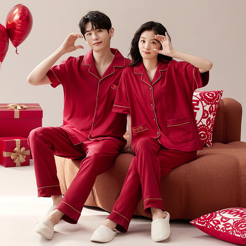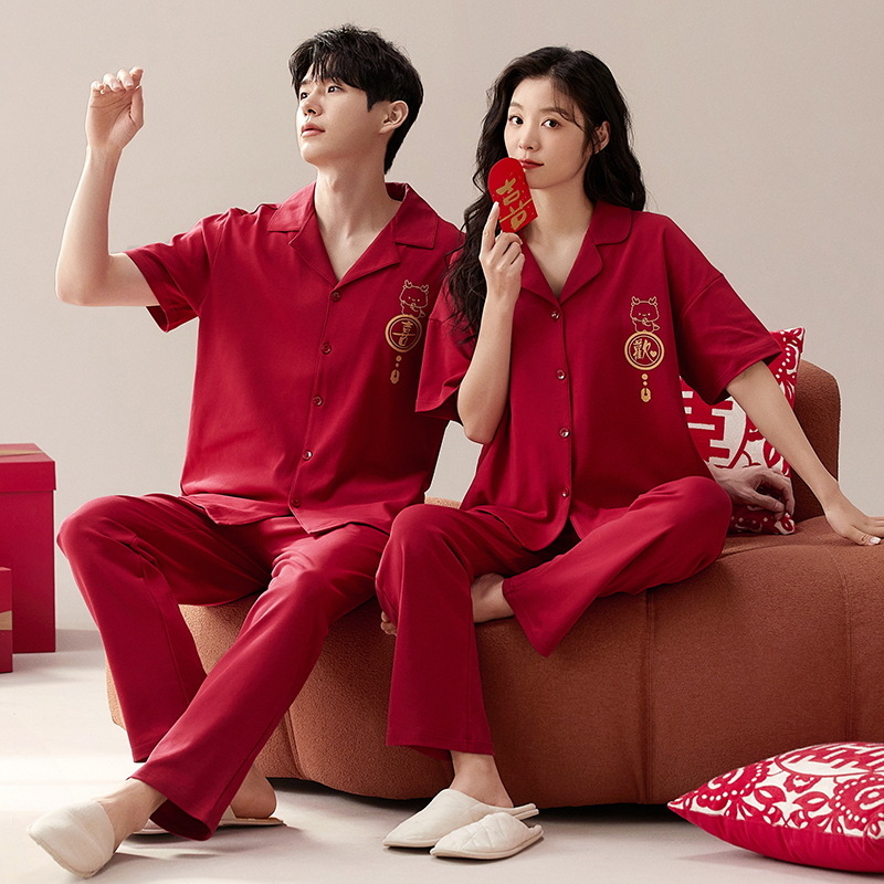 커플 잠옷 여름 면화 반팔 바지 웨딩 웨딩 레드 출생 년 남녀 홈 세트