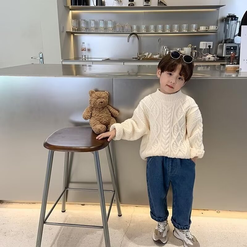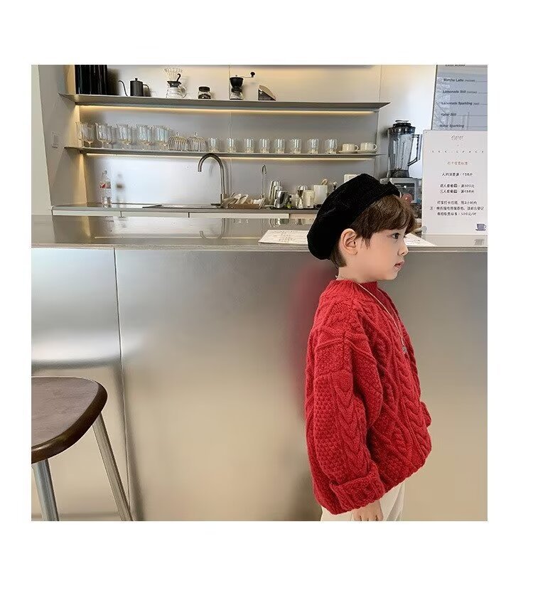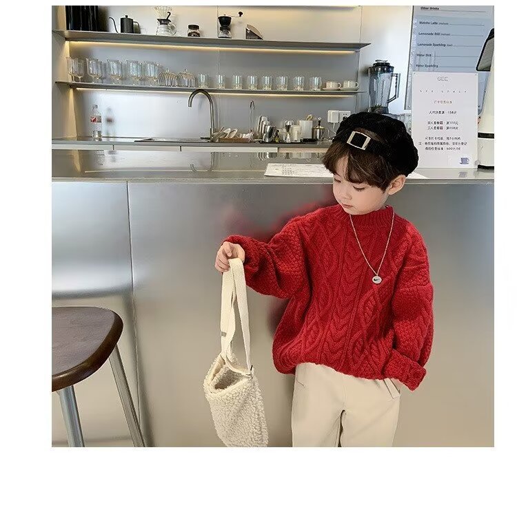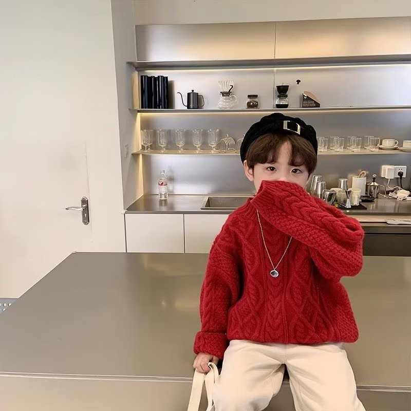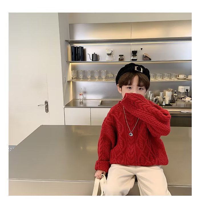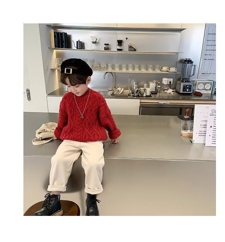 어린이 두꺼운 크루 넥 풀오버 레드 트위스트 스웨터 겨울 한국 스타일 소년과 소녀의 긴 소매 내부 니트 탑 트렌디