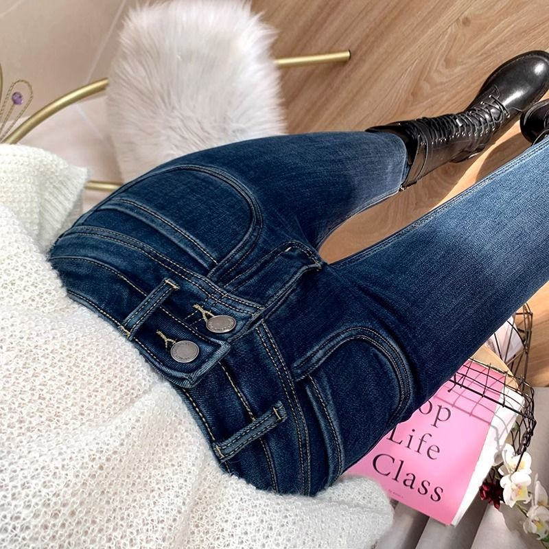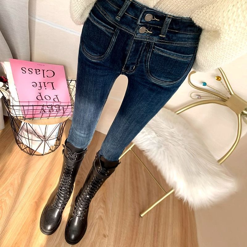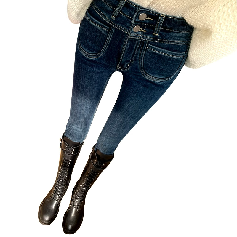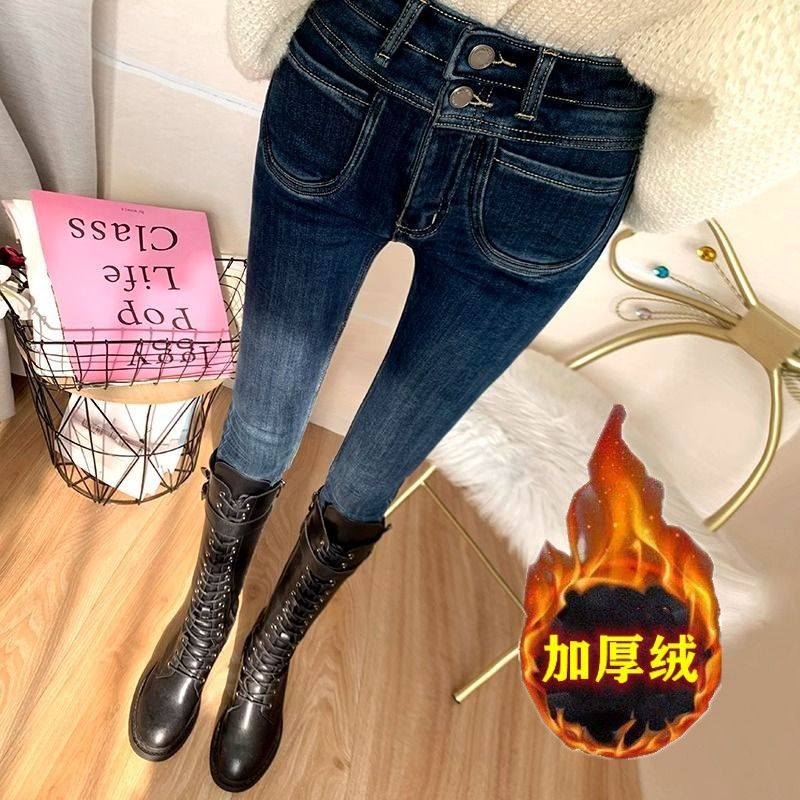 여성을위한 다크 블루 높은 허리 청바지 2024 겨울 새로운 기모 두껍게 슬림 핏 슬리밍 디자인 감각 크롭 연필 바지스토어 가기