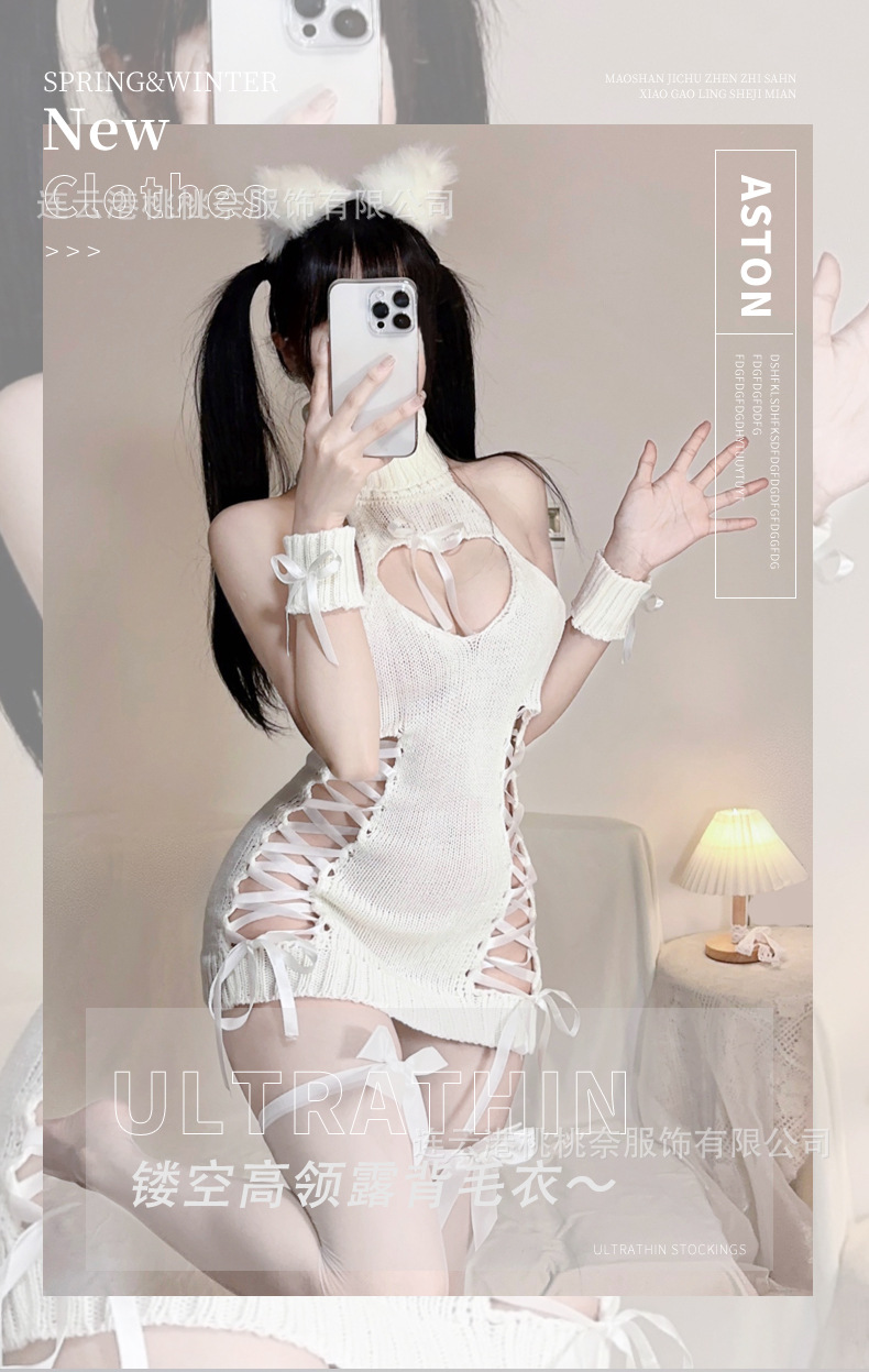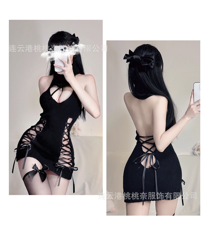 사악한 소녀 순수한 욕망 점프 수트 짧은 치마 섹시한 로우 컷 중공 터틀넥 니트 스웨터 백리스 섹시한 유니폼 유혹