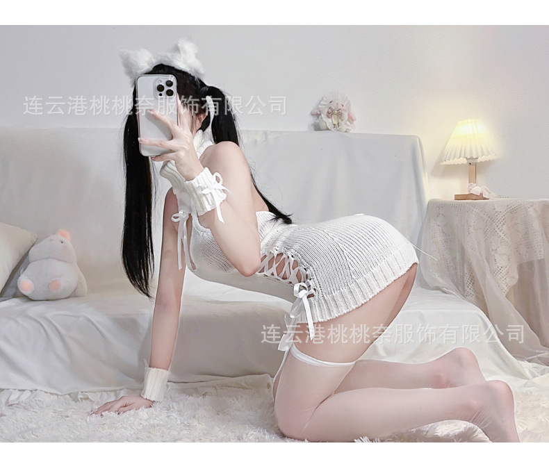 사악한 소녀 순수한 욕망 점프 수트 짧은 치마 섹시한 로우 컷 중공 터틀넥 니트 스웨터 백리스 섹시한 유니폼 유혹스토어 가기