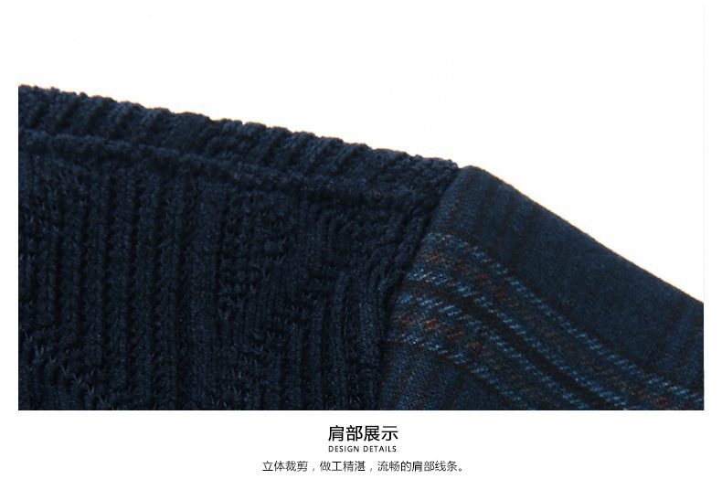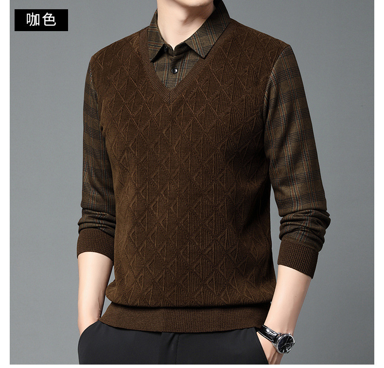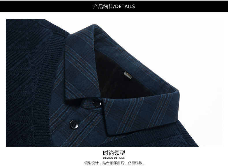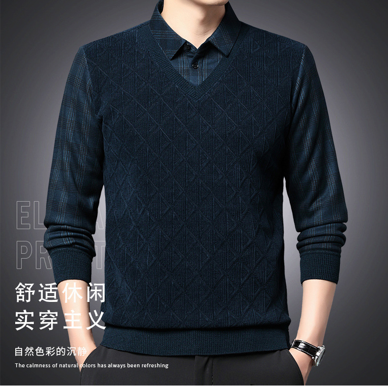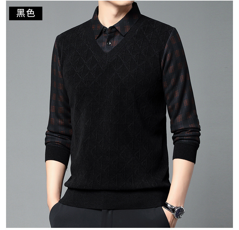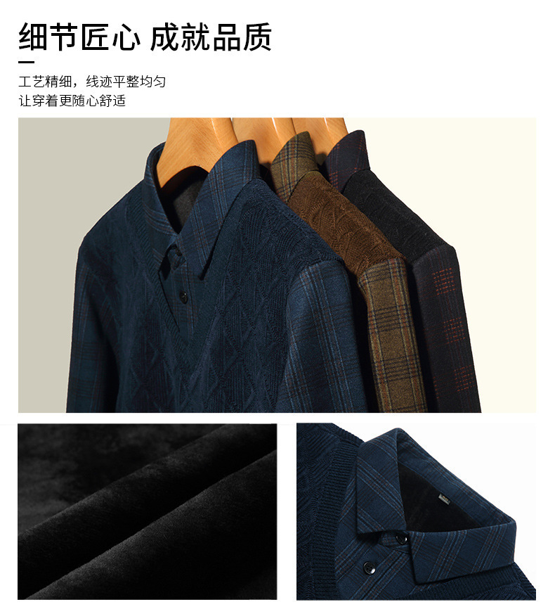 直播男装保暖毛衣针织翻领绵羊毛假两件中老年加绒加厚条纹休闲