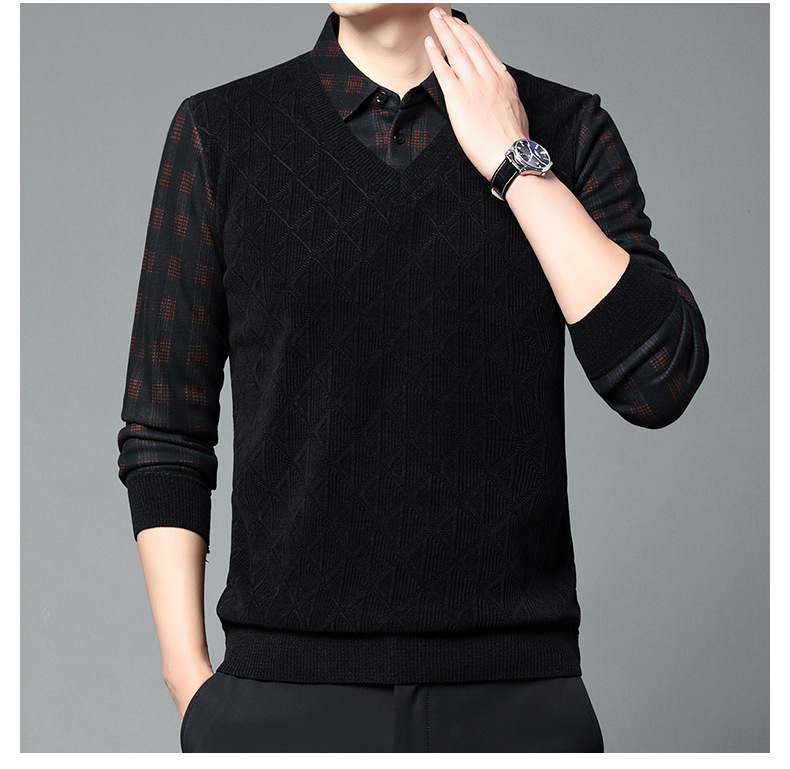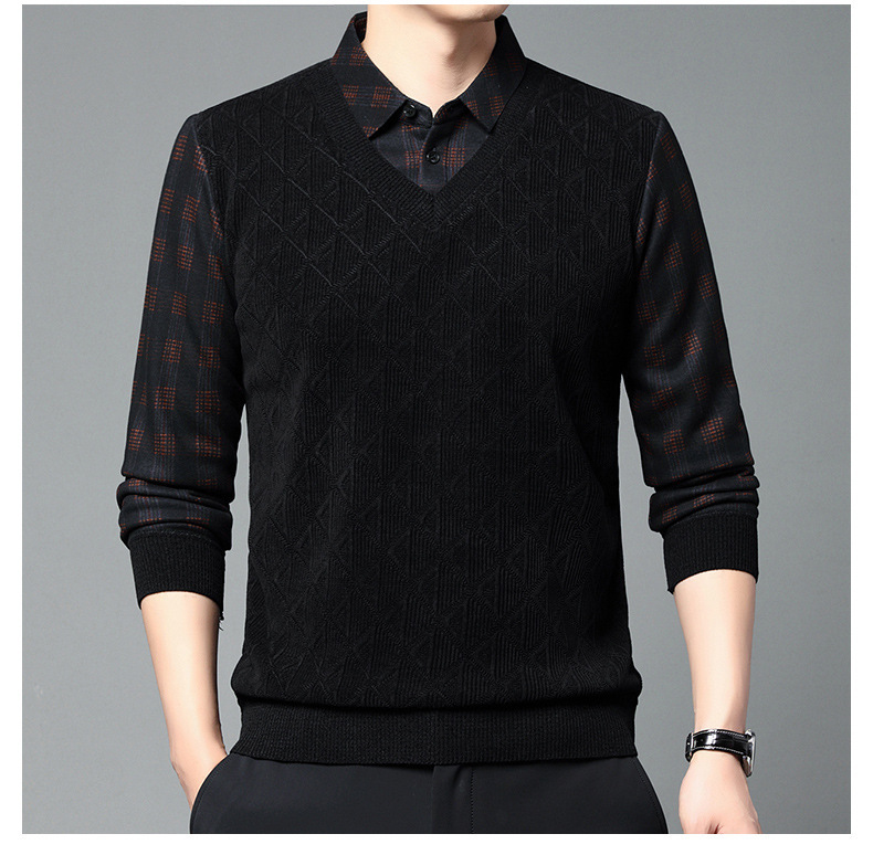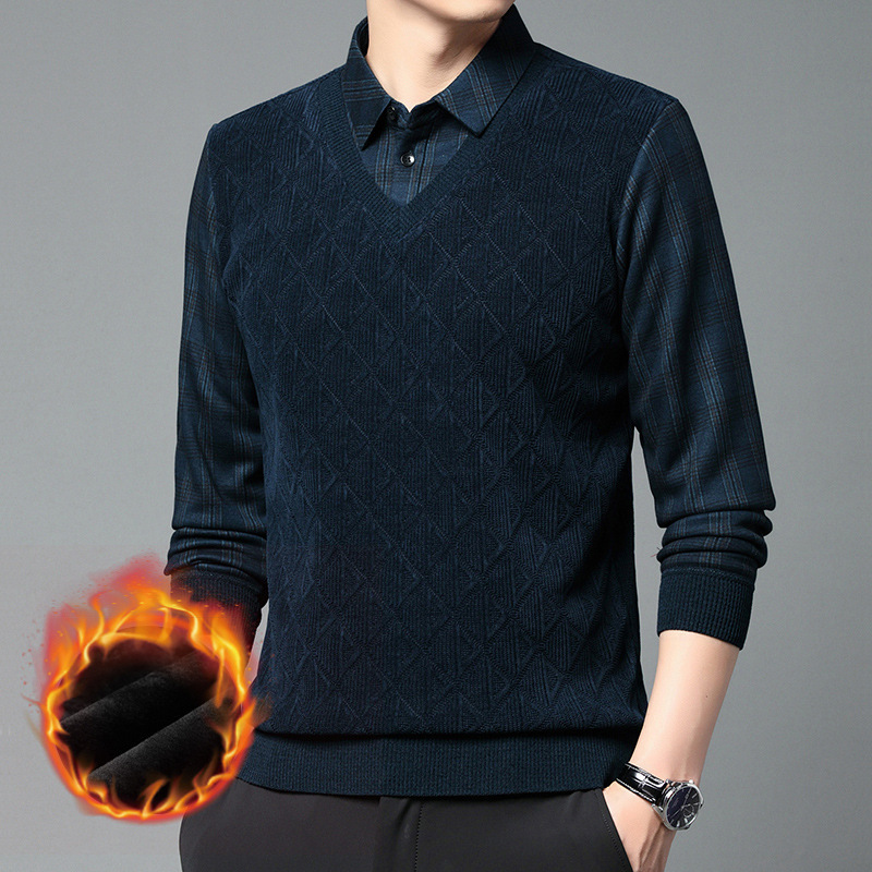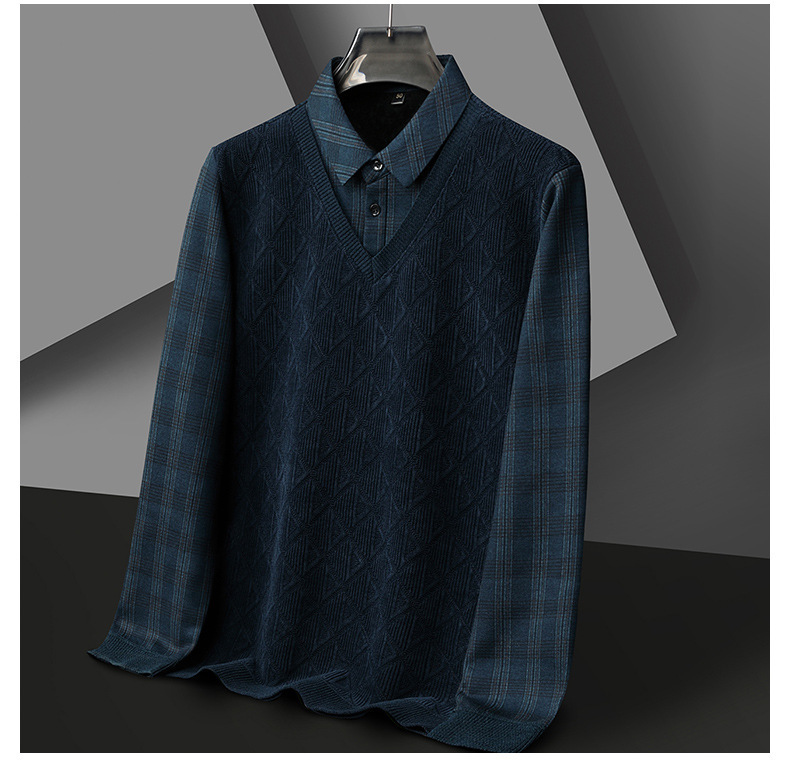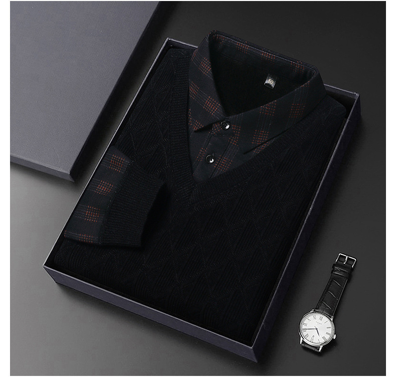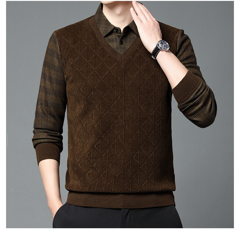 생방송 남성 따뜻한 스웨터 니트 옷깃면 가짜 2 피스 중년 및 노인 기모 두꺼운 줄무늬 캐주얼
