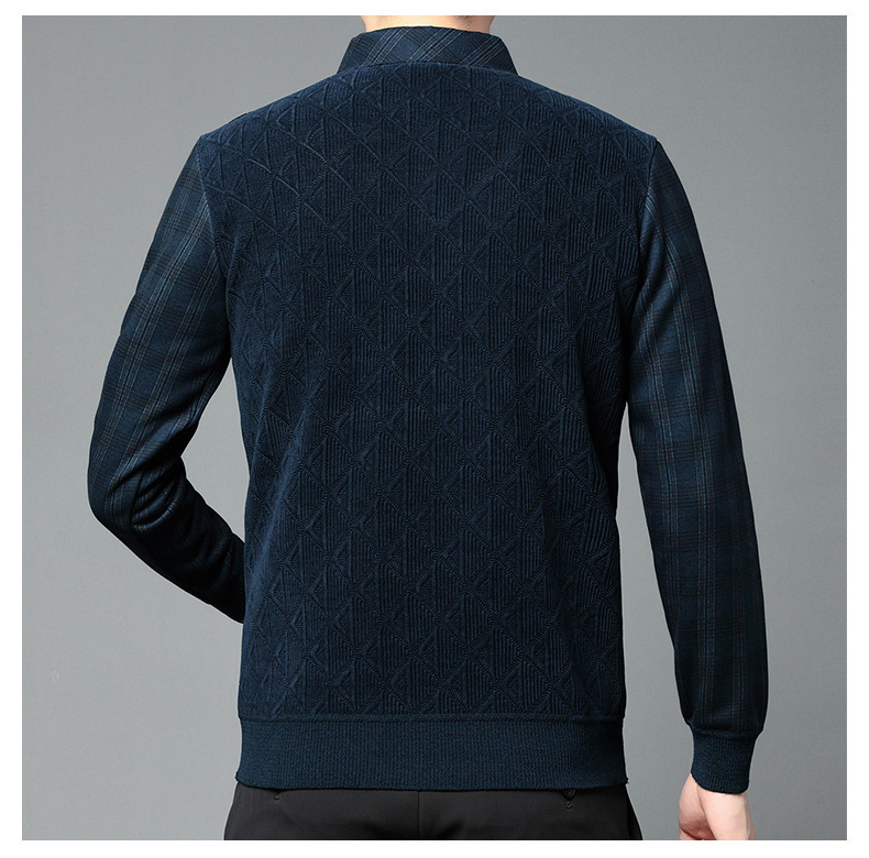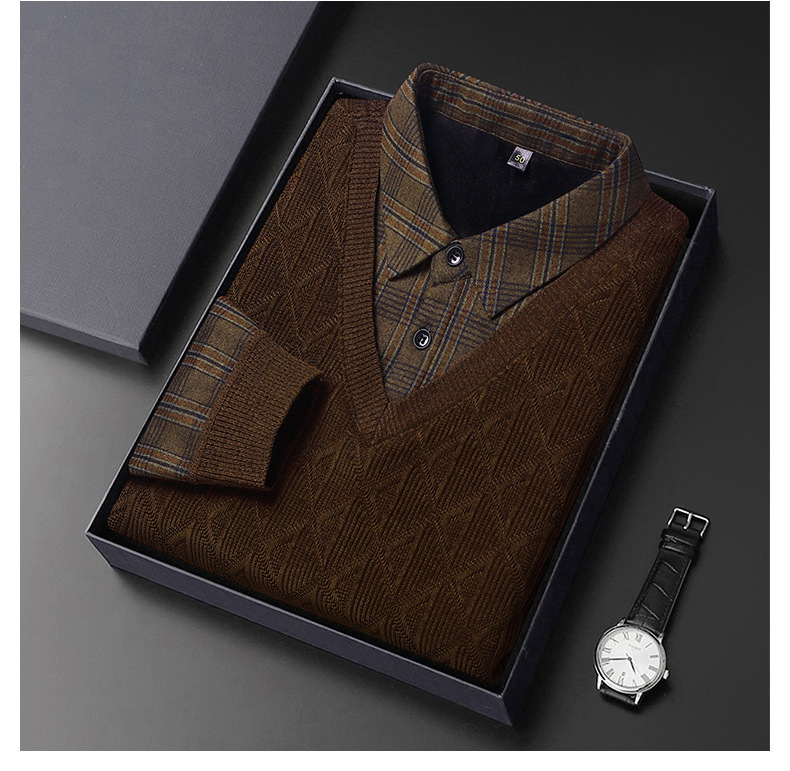 생방송 남성 따뜻한 스웨터 니트 옷깃면 가짜 2 피스 중년 및 노인 기모 두꺼운 줄무늬 캐주얼스토어 가기