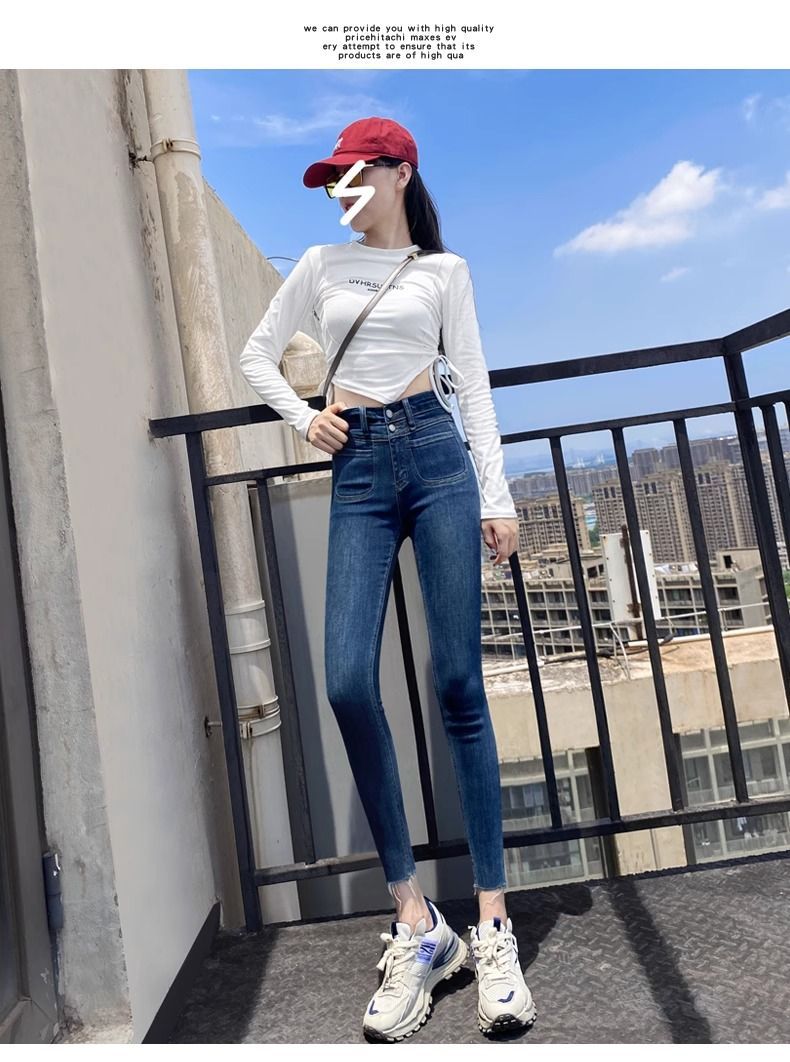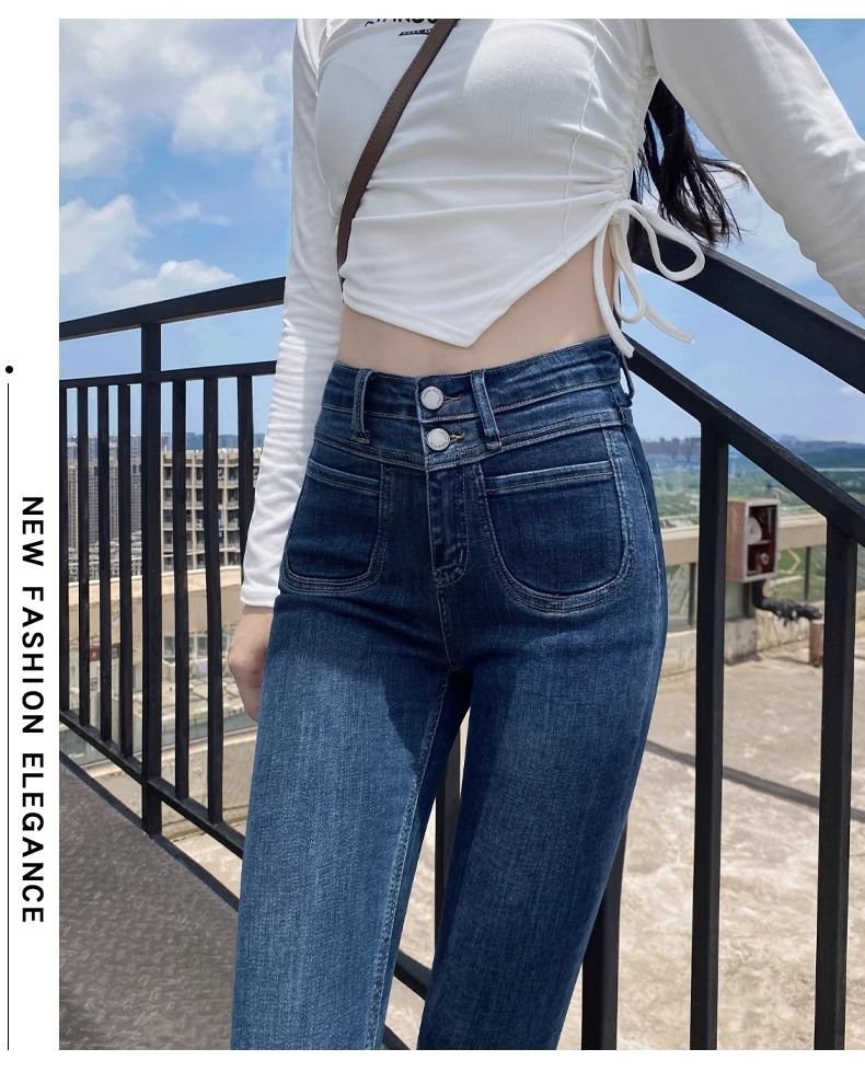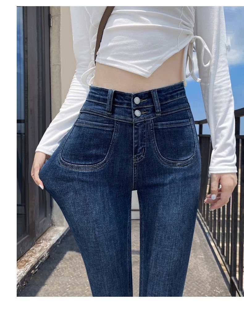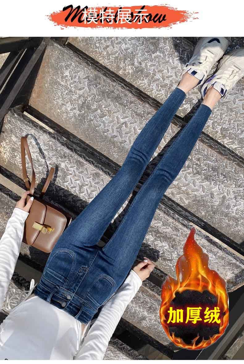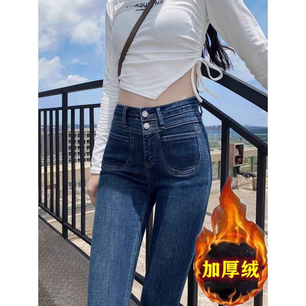 틈새 다크 블루 여성을위한 높은 허리 연필 청바지 2024 겨울 새로운 기모 두껍게 슬림 핏 스키니 바지스토어 가기