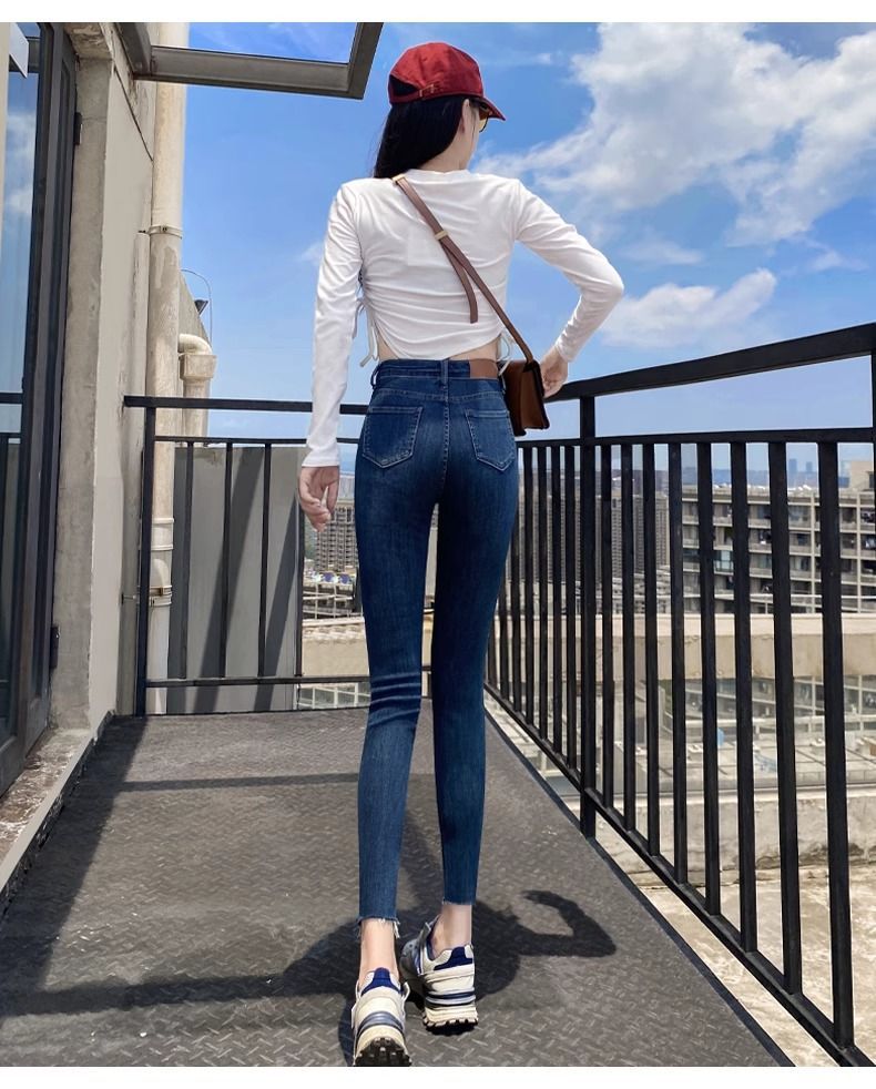 틈새 다크 블루 여성을위한 높은 허리 연필 청바지 2024 겨울 새로운 기모 두껍게 슬림 핏 스키니 바지