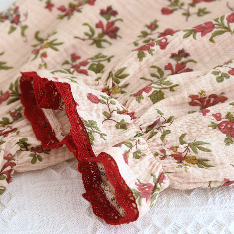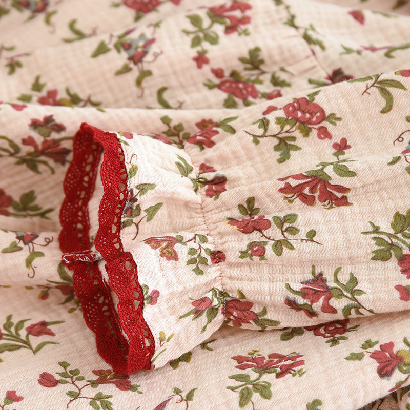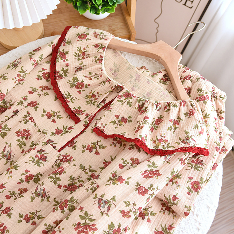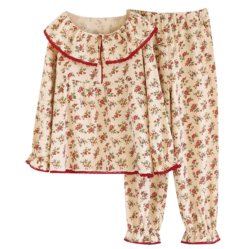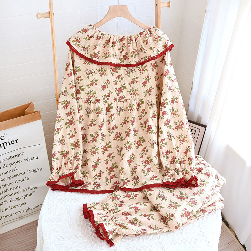 여성면 거즈 파자마 얇은 복고풍 긴팔 바지 면화 원사 홈 웨어는 봄과 가을 밖에서 착용 할 수 있습니다.스토어 가기