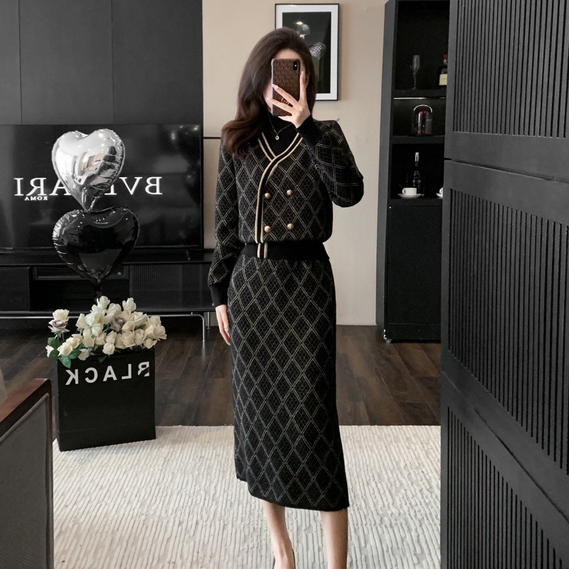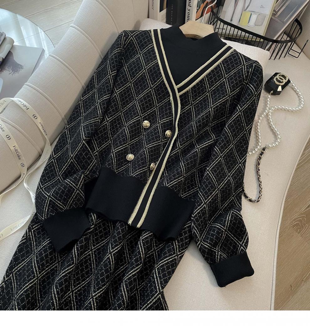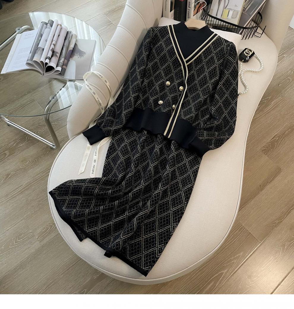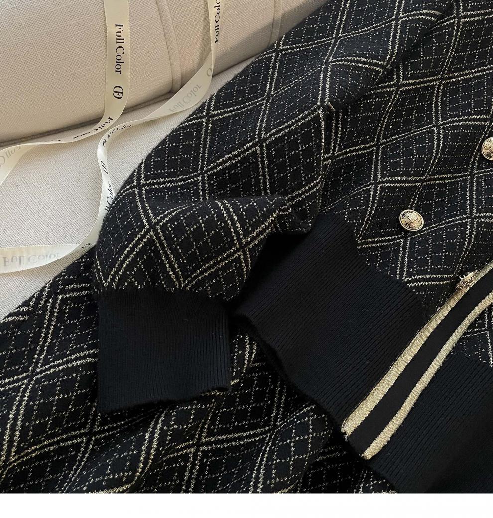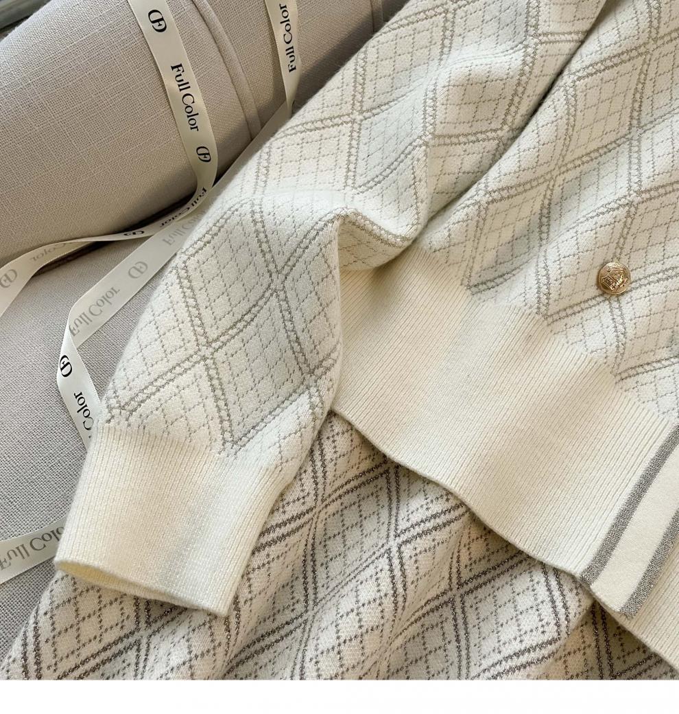 프렌치 스타일의 고급 니트 정장 스커트 여성용 2025 봄 가을 신상품 다이아몬드 패턴 재킷과 스커트 투피스 세트