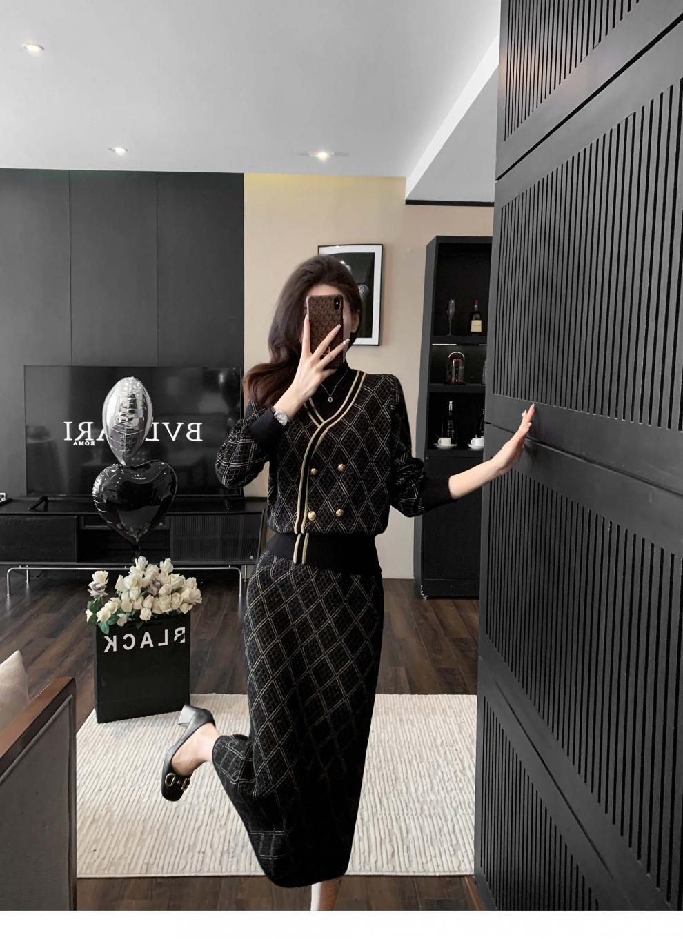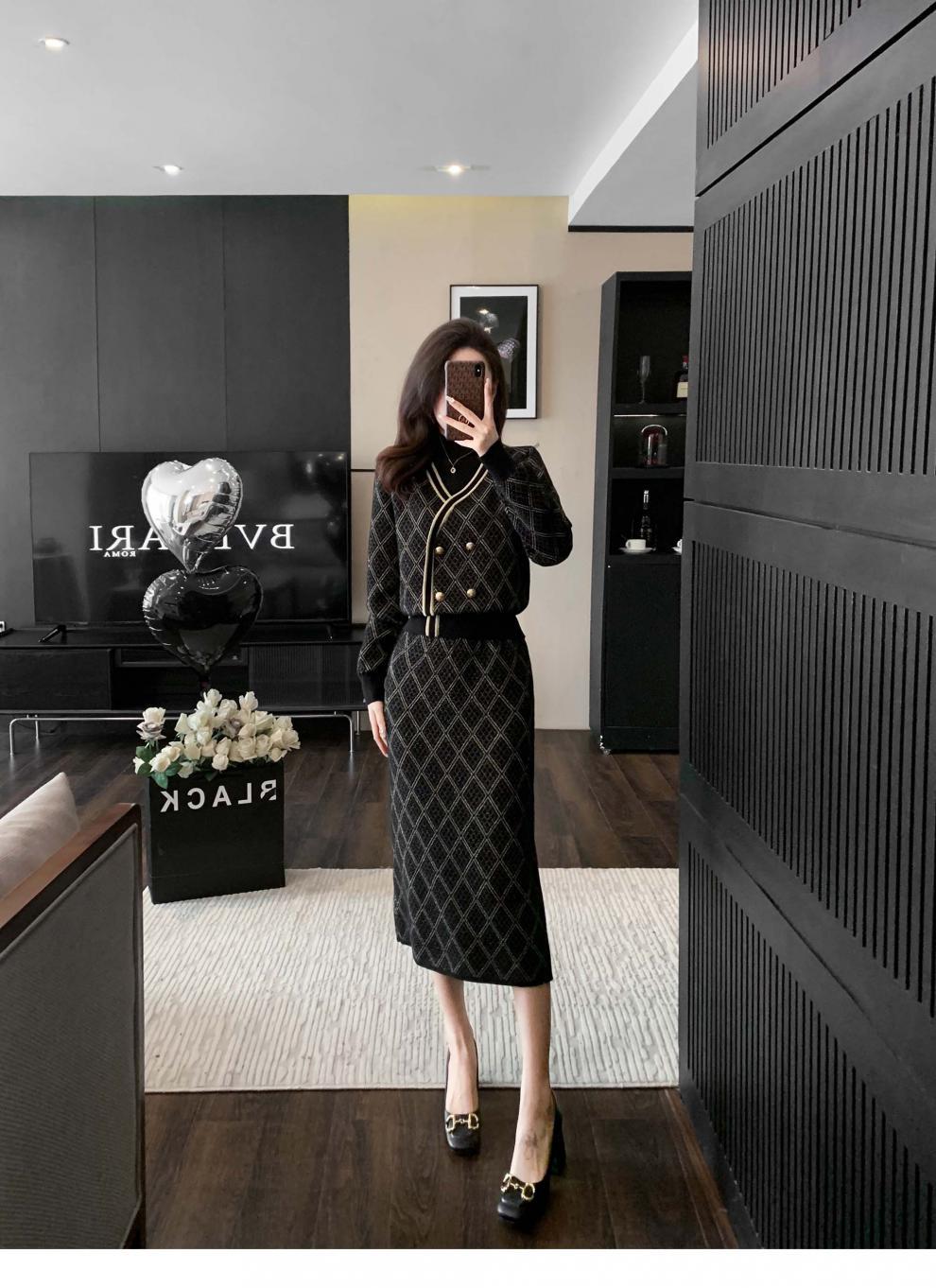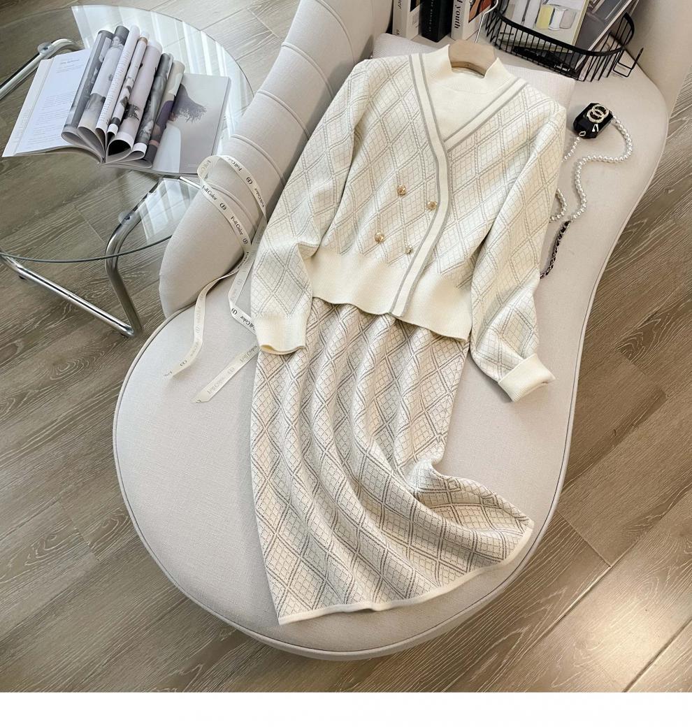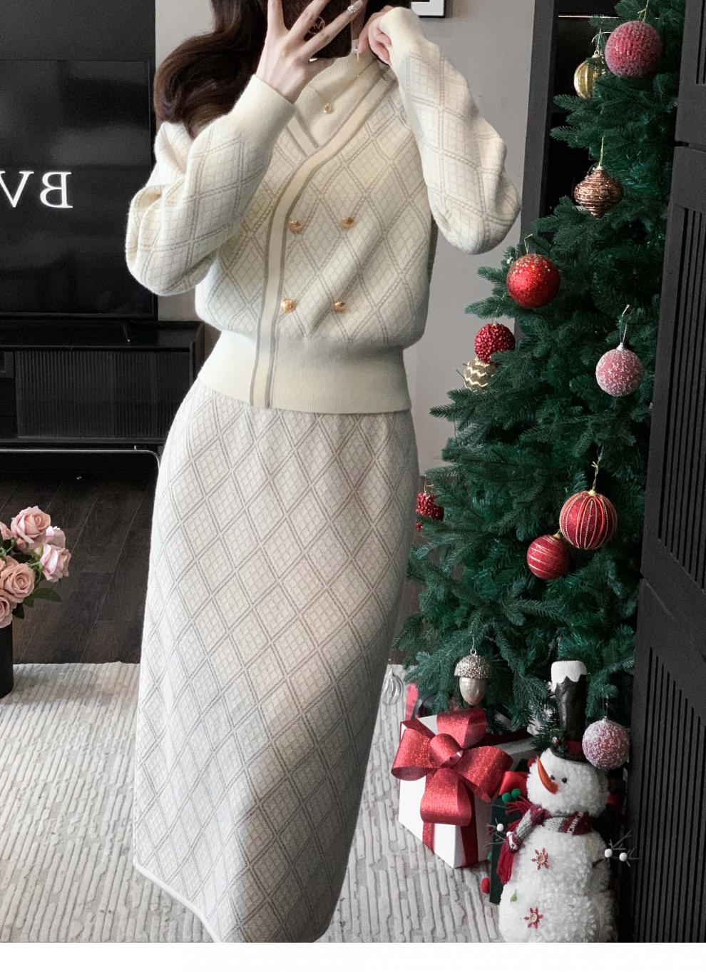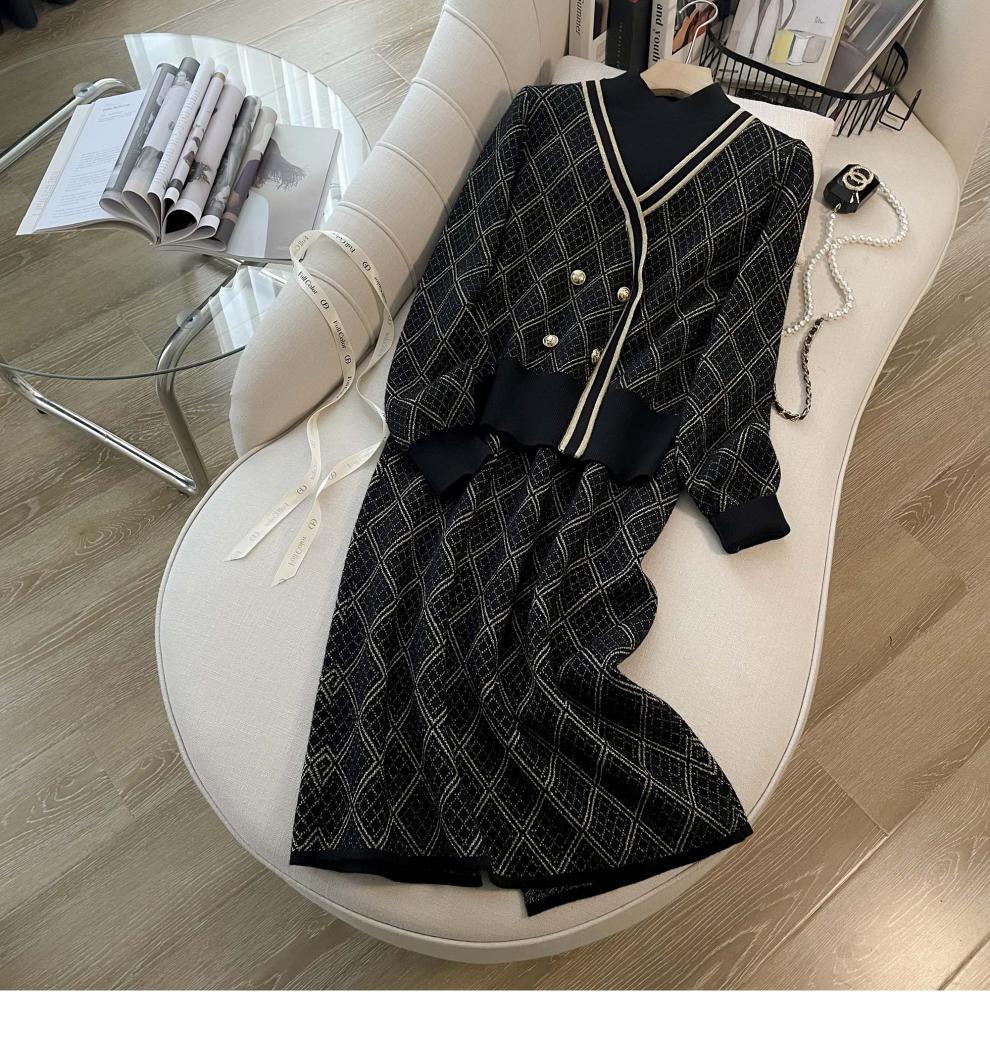 프렌치 스타일의 고급 니트 정장 스커트 여성용 2025 봄 가을 신상품 다이아몬드 패턴 재킷과 스커트 투피스 세트
