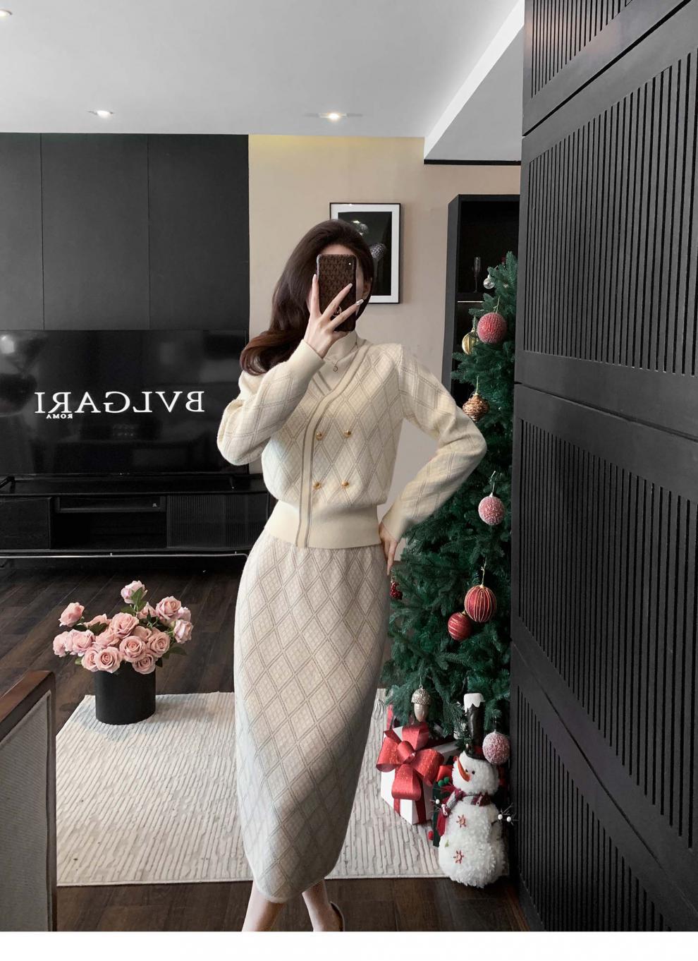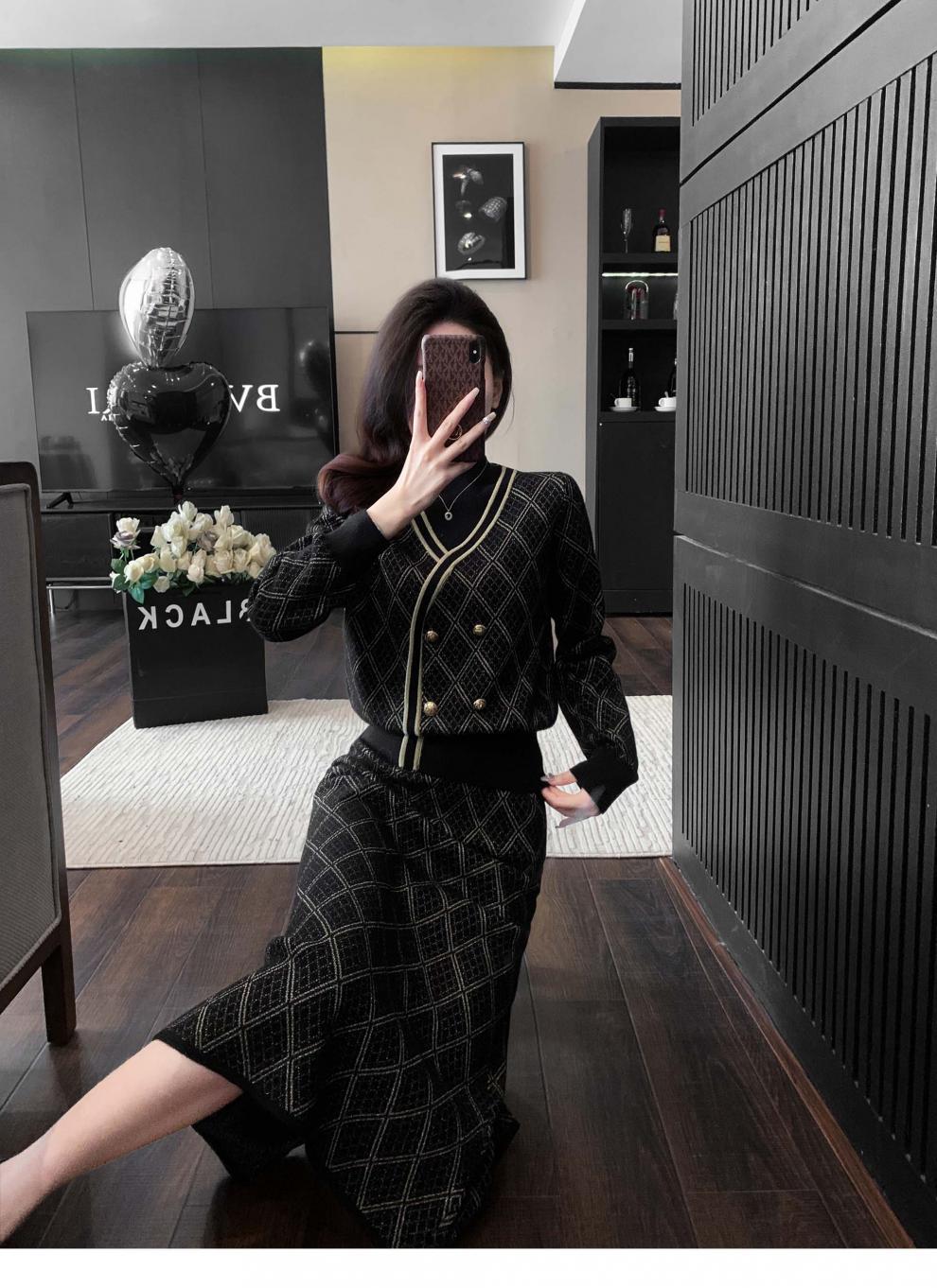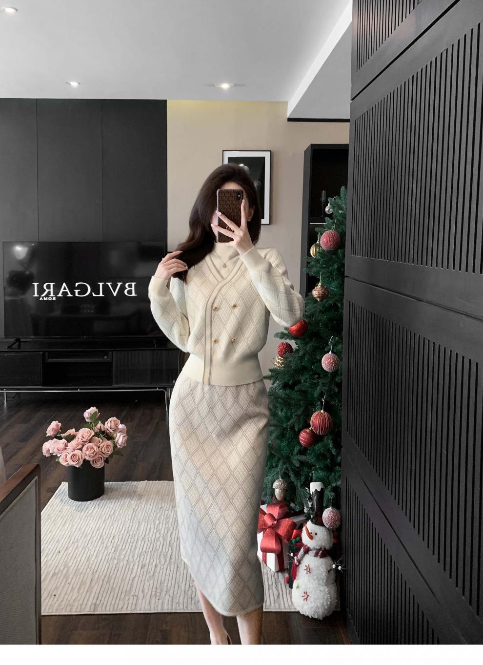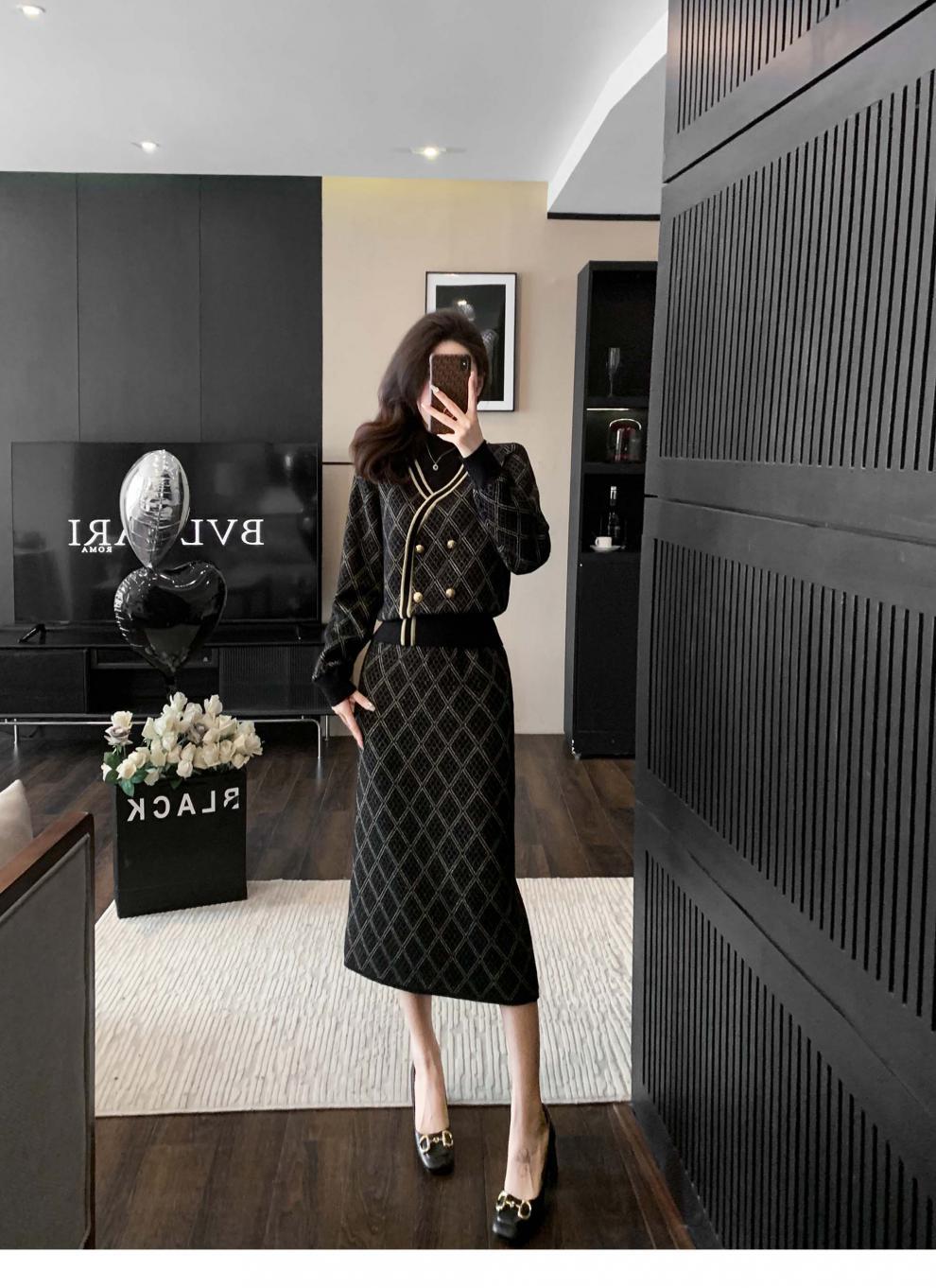프렌치 스타일의 고급 니트 정장 스커트 여성용 2025 봄 가을 신상품 다이아몬드 패턴 재킷과 스커트 투피스 세트