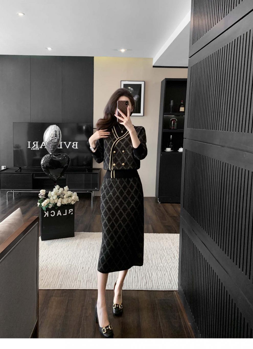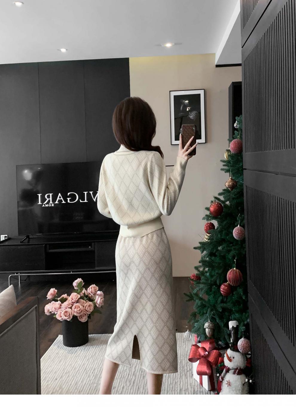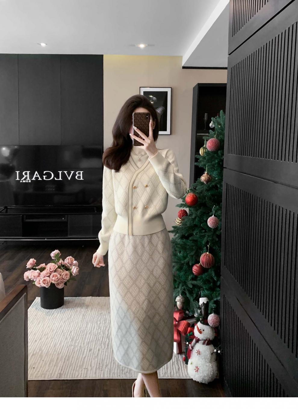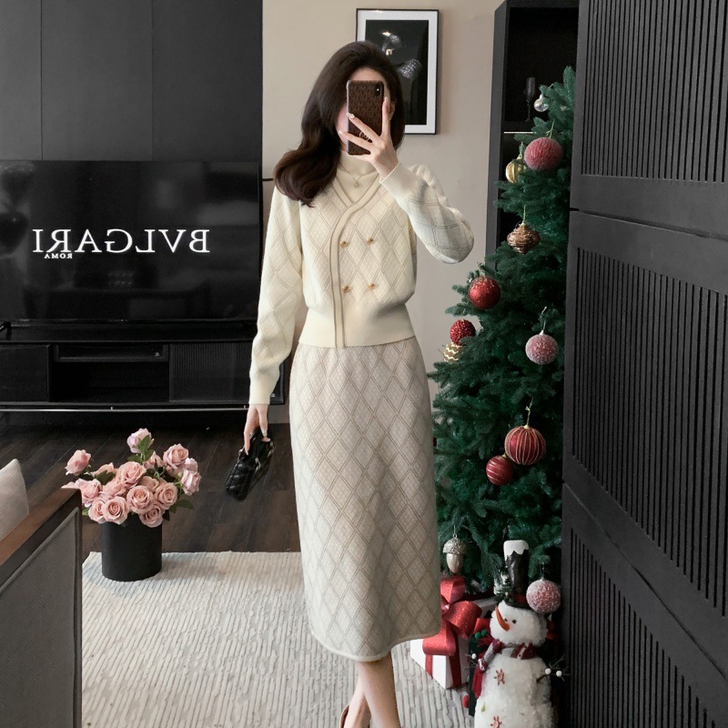 프렌치 스타일의 고급 니트 정장 스커트 여성용 2025 봄 가을 신상품 다이아몬드 패턴 재킷과 스커트 투피스 세트스토어 가기