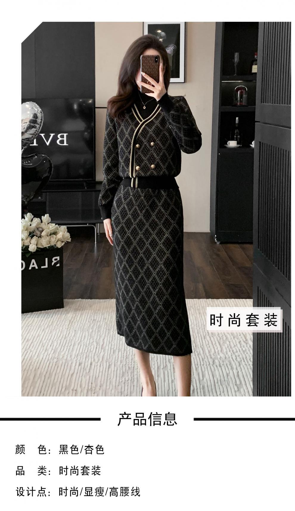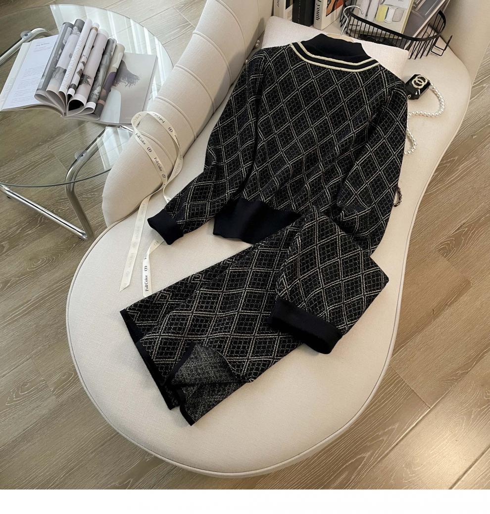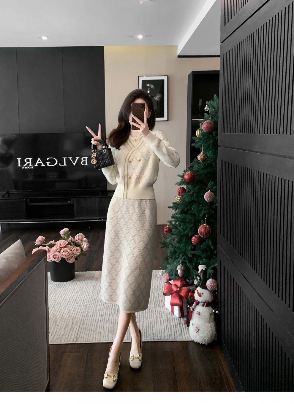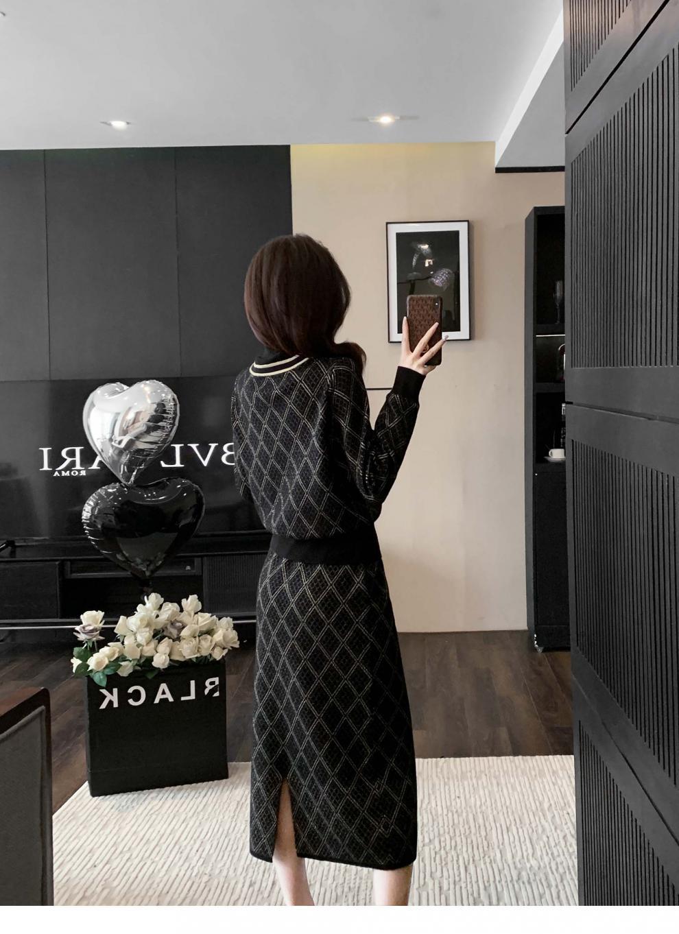 프렌치 스타일의 고급 니트 정장 스커트 여성용 2025 봄 가을 신상품 다이아몬드 패턴 재킷과 스커트 투피스 세트스토어 가기