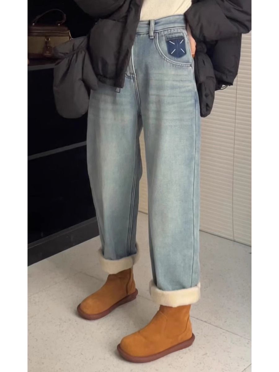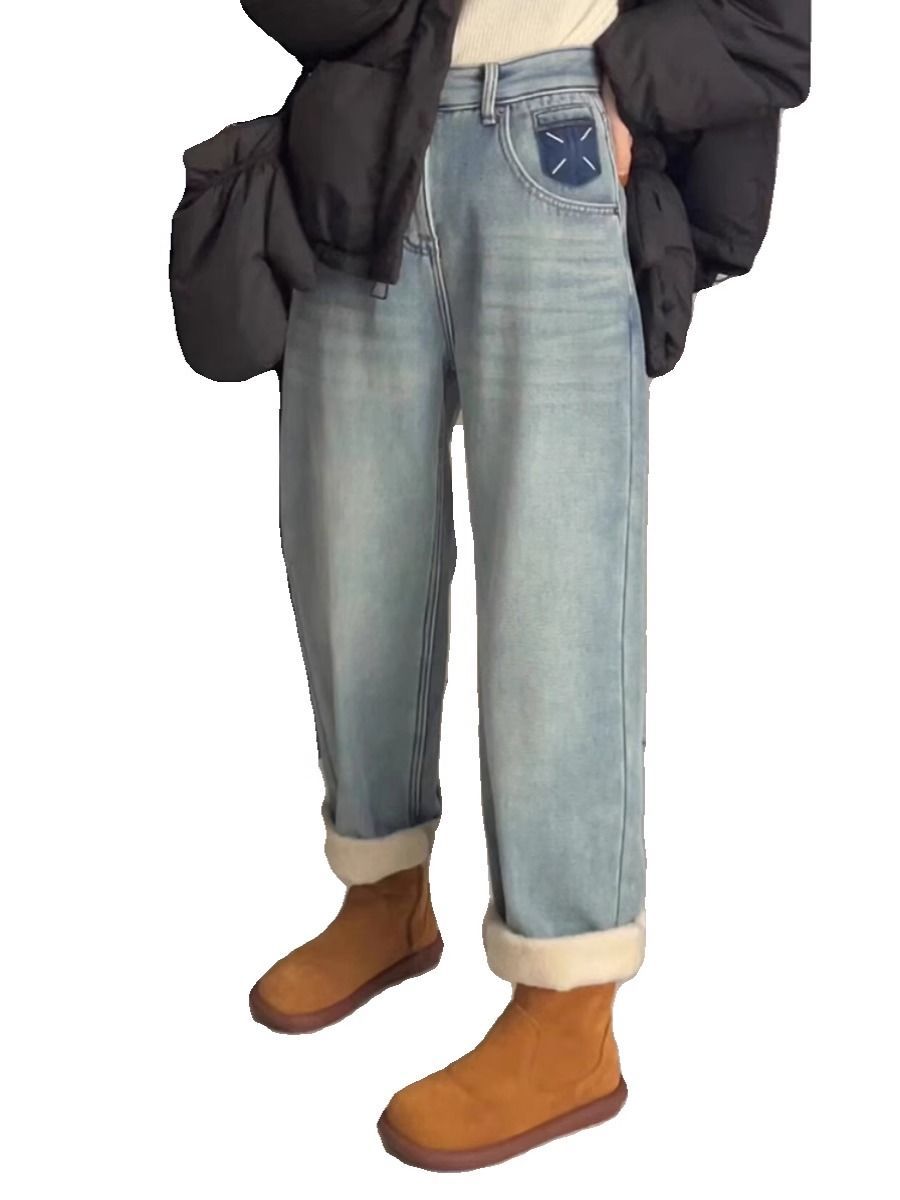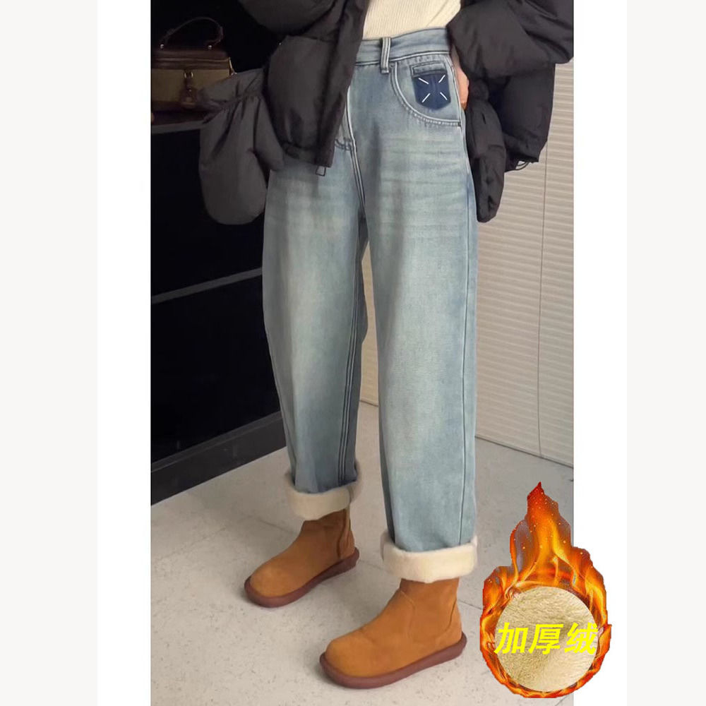 여성을위한 기모 두꺼운 청바지 2024 겨울 새로운 하이 웨이스트 슬리밍 하이 웨스턴 스타일 올 매치 따뜻한 스트레이트 팬츠스토어 가기