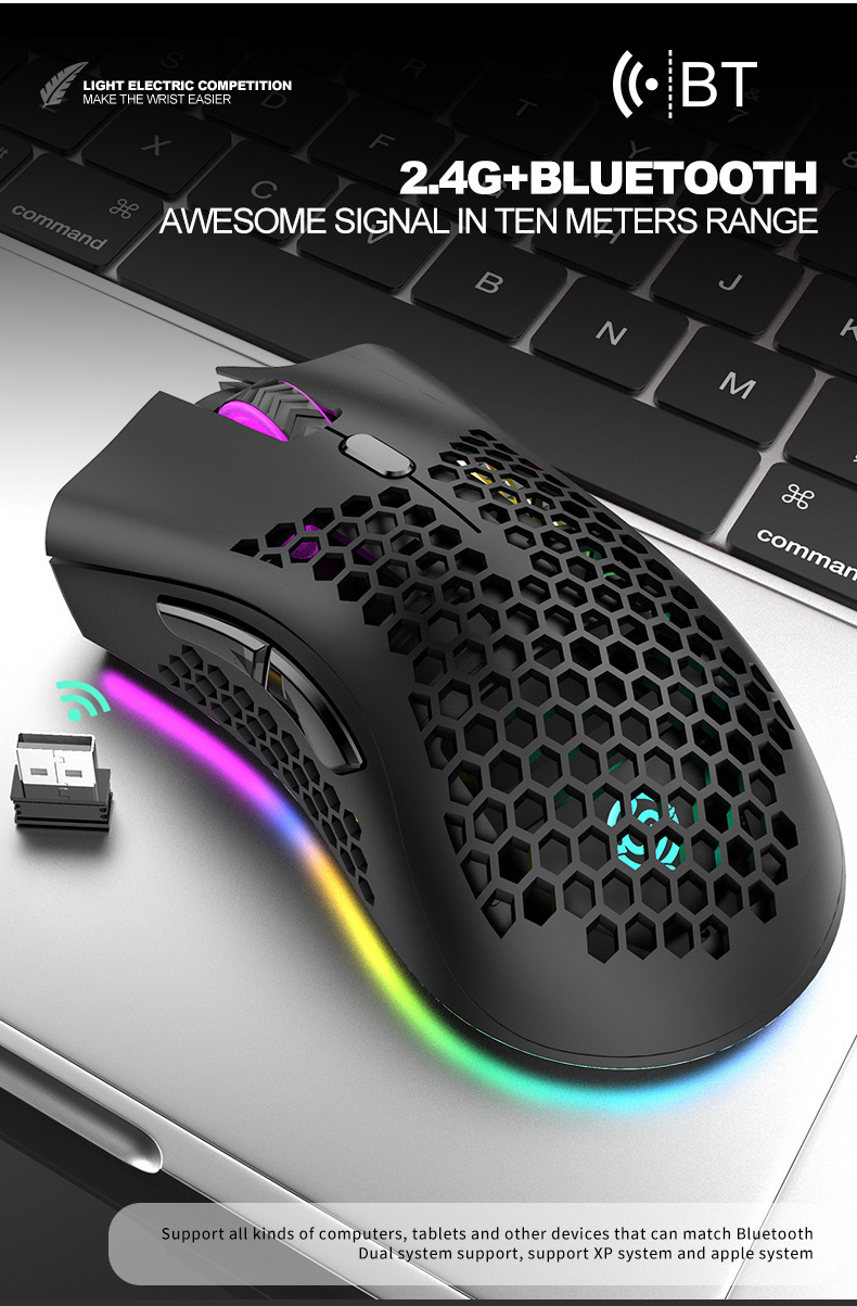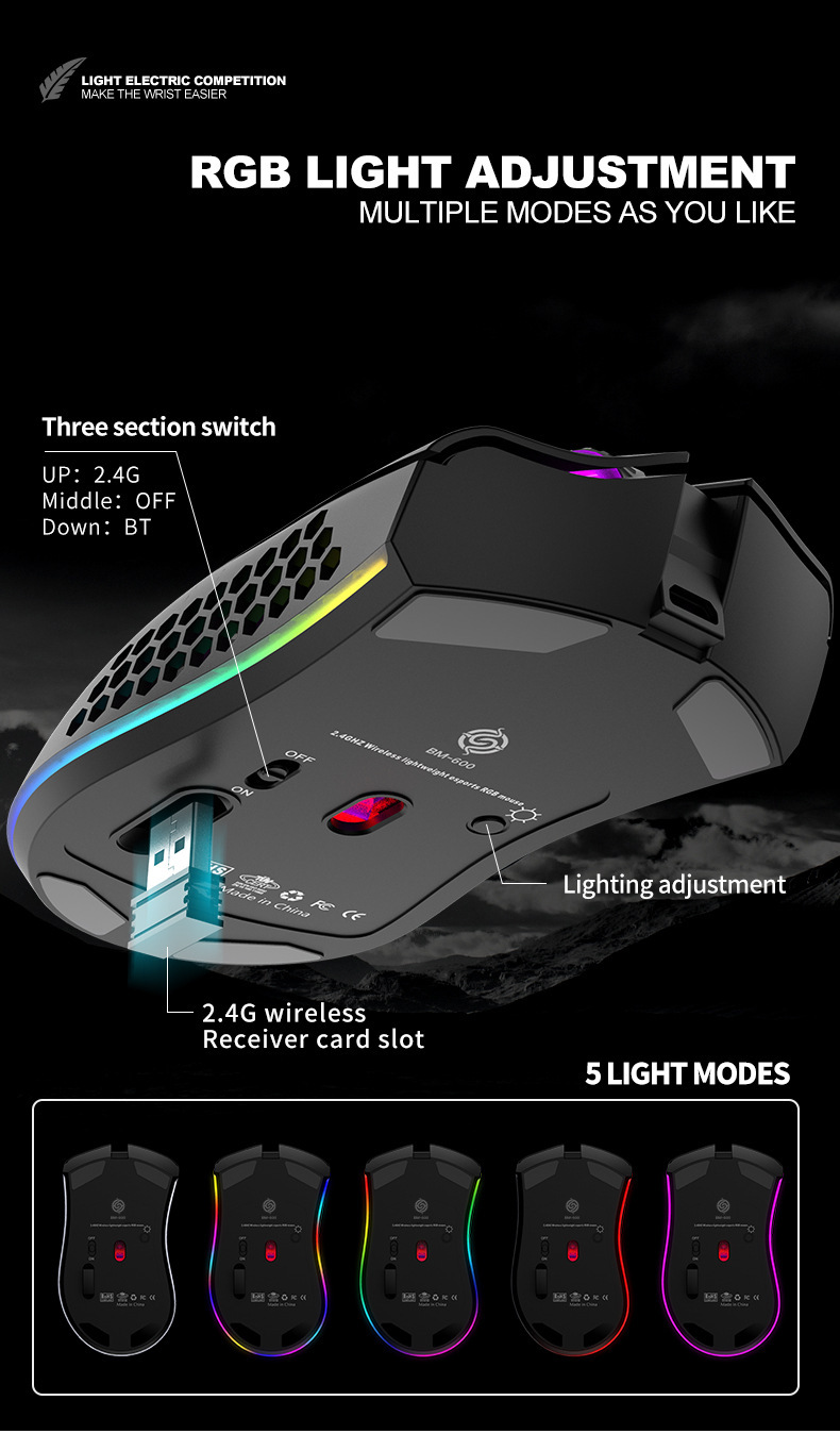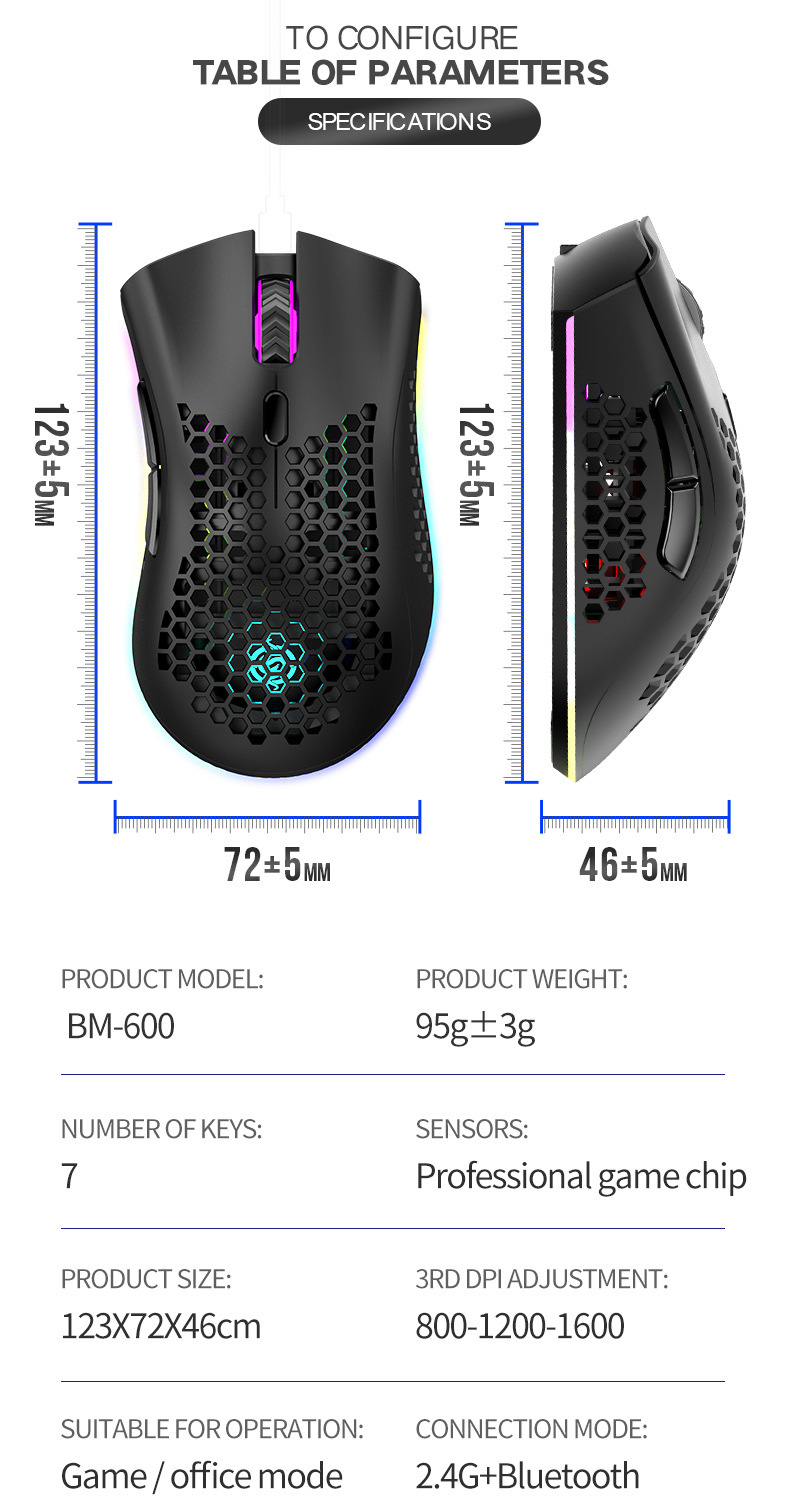 바이퍼 BM600 무선 블루투스 듀얼 모드 경량 중공 구멍 RGB 충전 게임 마우스 아마존 이베이
