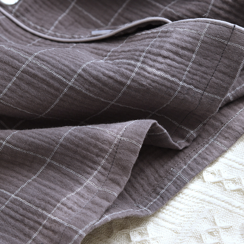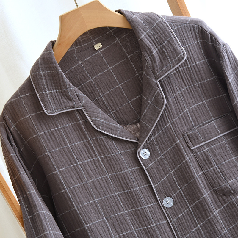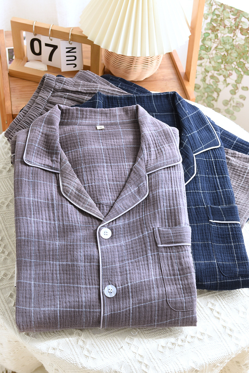 남성용 면 격자 무늬 잠옷 봄과 가을 긴 소매 얇은 크레이프 면사 옷깃 클래식 홈 웨어 느슨한 플러스 사이즈