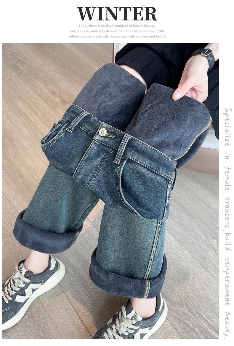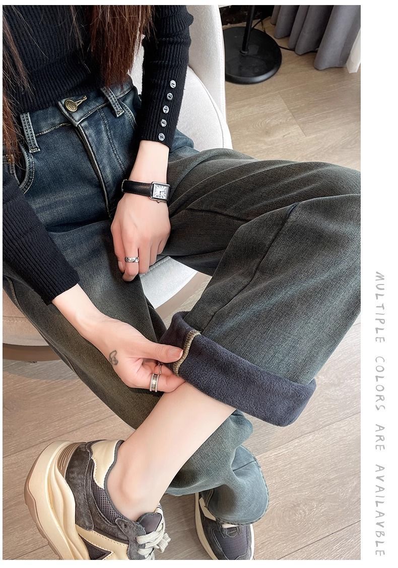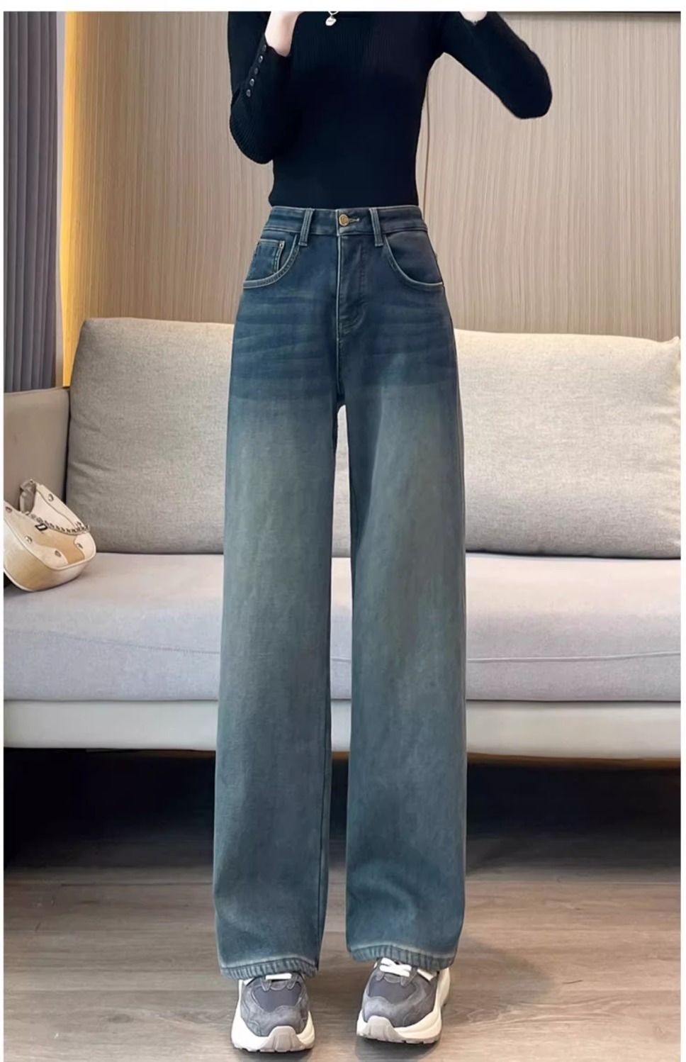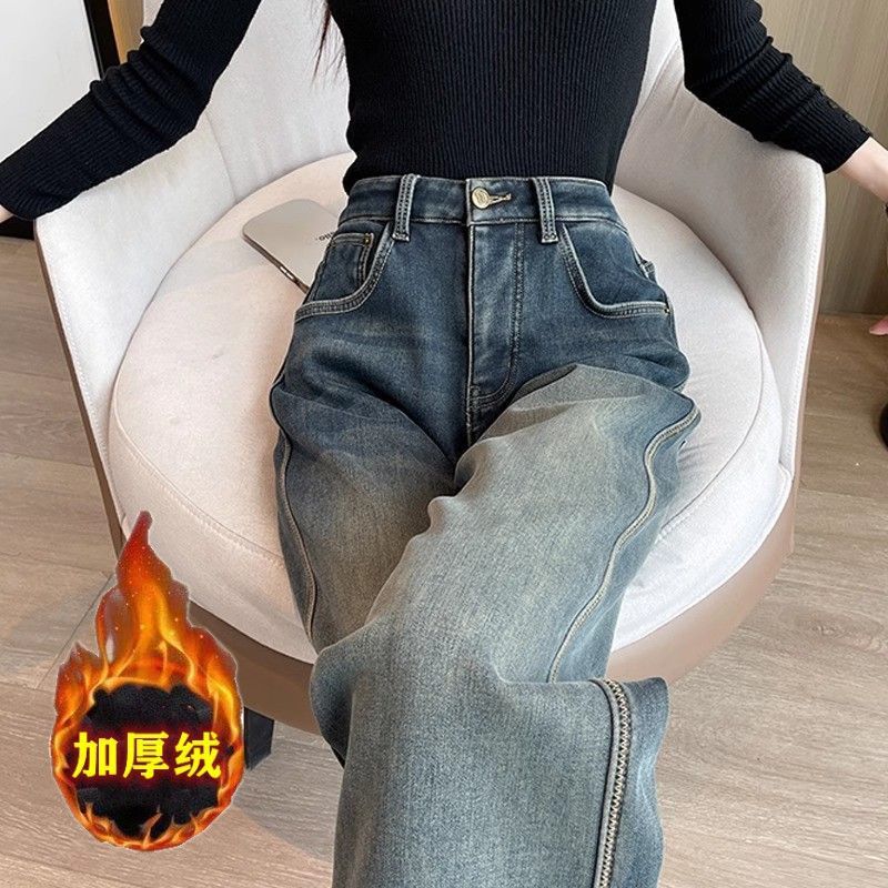 틈새 디자인 넓은 다리 청바지 여성의 2020 겨울 새로운 높은 허리 기모 두꺼운 슬리밍 스트레이트 걸레 바지스토어 가기