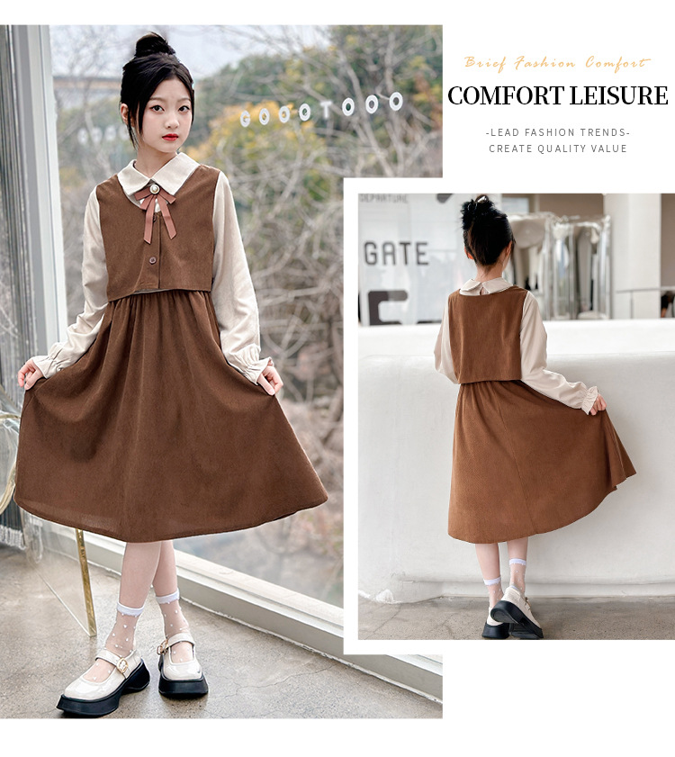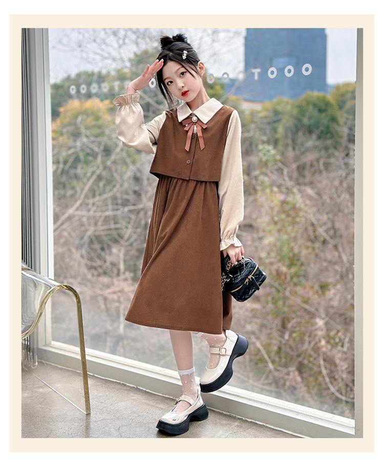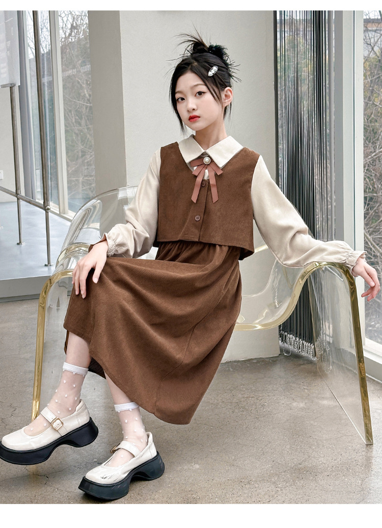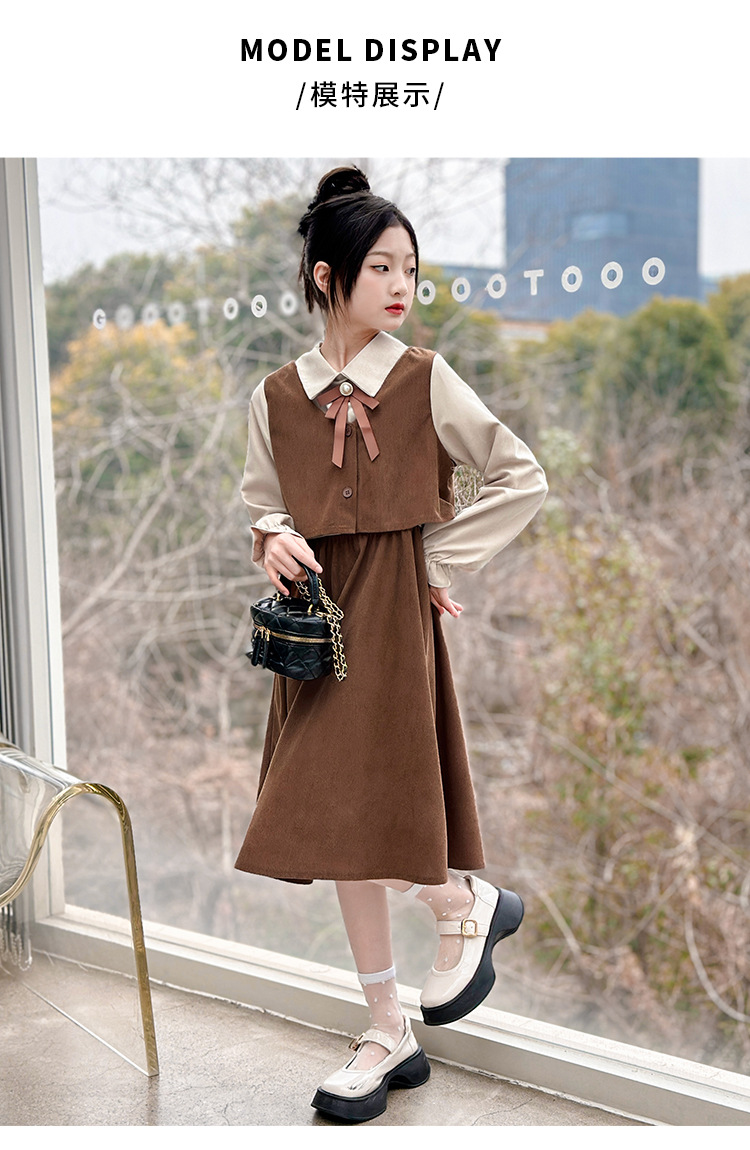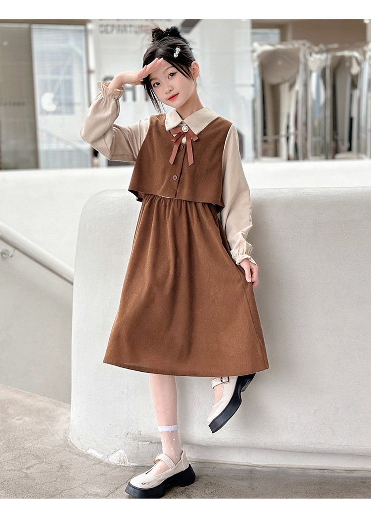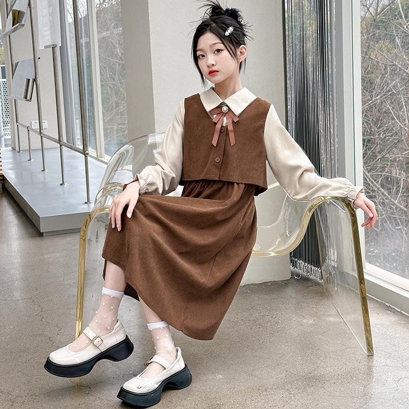 소녀 원피스 봄과 가을 2024 새로운 서양식 어린이 가짜 투피스 원피스 소녀 봄 긴팔 원피스스토어 가기