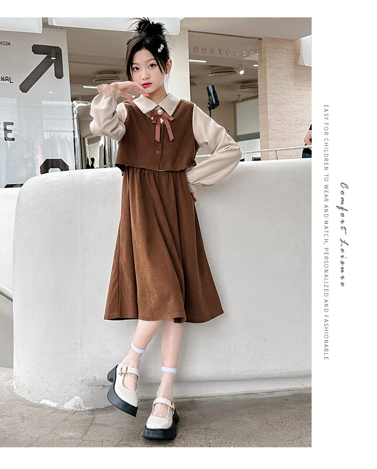 소녀 원피스 봄과 가을 2024 새로운 서양식 어린이 가짜 투피스 원피스 소녀 봄 긴팔 원피스