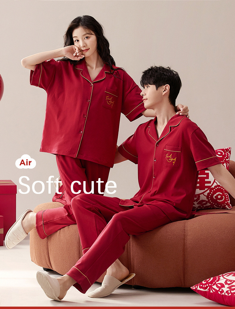 국경 간 도매 커플 잠옷 여름면 짧은 소매 결혼식 축제 출생 년 붉은 면화 세트