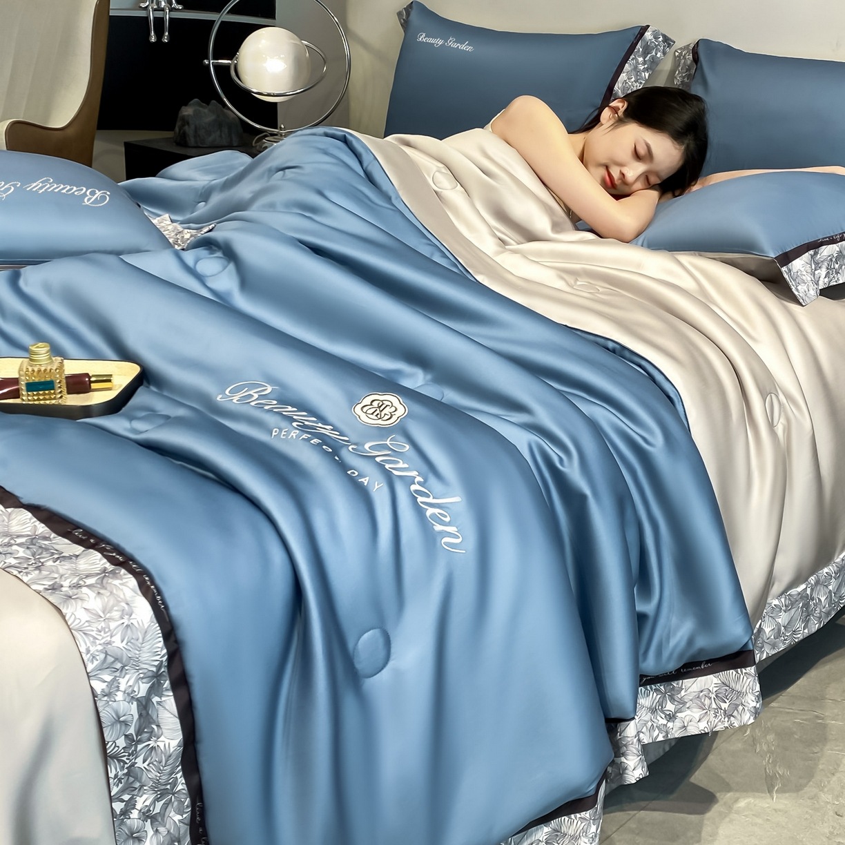 세탁 가능한 A급 여름 이불 4종 세트, 에어컨 이불, 알몸으로 잠들 수 있는 아이스 실크 에어컨 이불, 싱글/더블 자수 얇은 이불