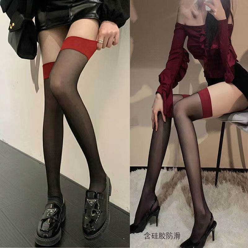 레드 엣지 섹시한 블랙 실크 인 그물 레드와 블랙 스타킹 착용 슬리밍 하이 무릎 양말 봄과 여름 얇은 안티 훅 스타킹
