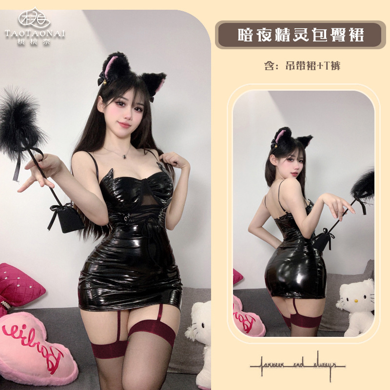 작은 악마 섹시한 광택 PU 홀터 레이스 업 투명 스커트 세트 유니폼 원피스 코스프레 섹시한 세트스토어 가기
