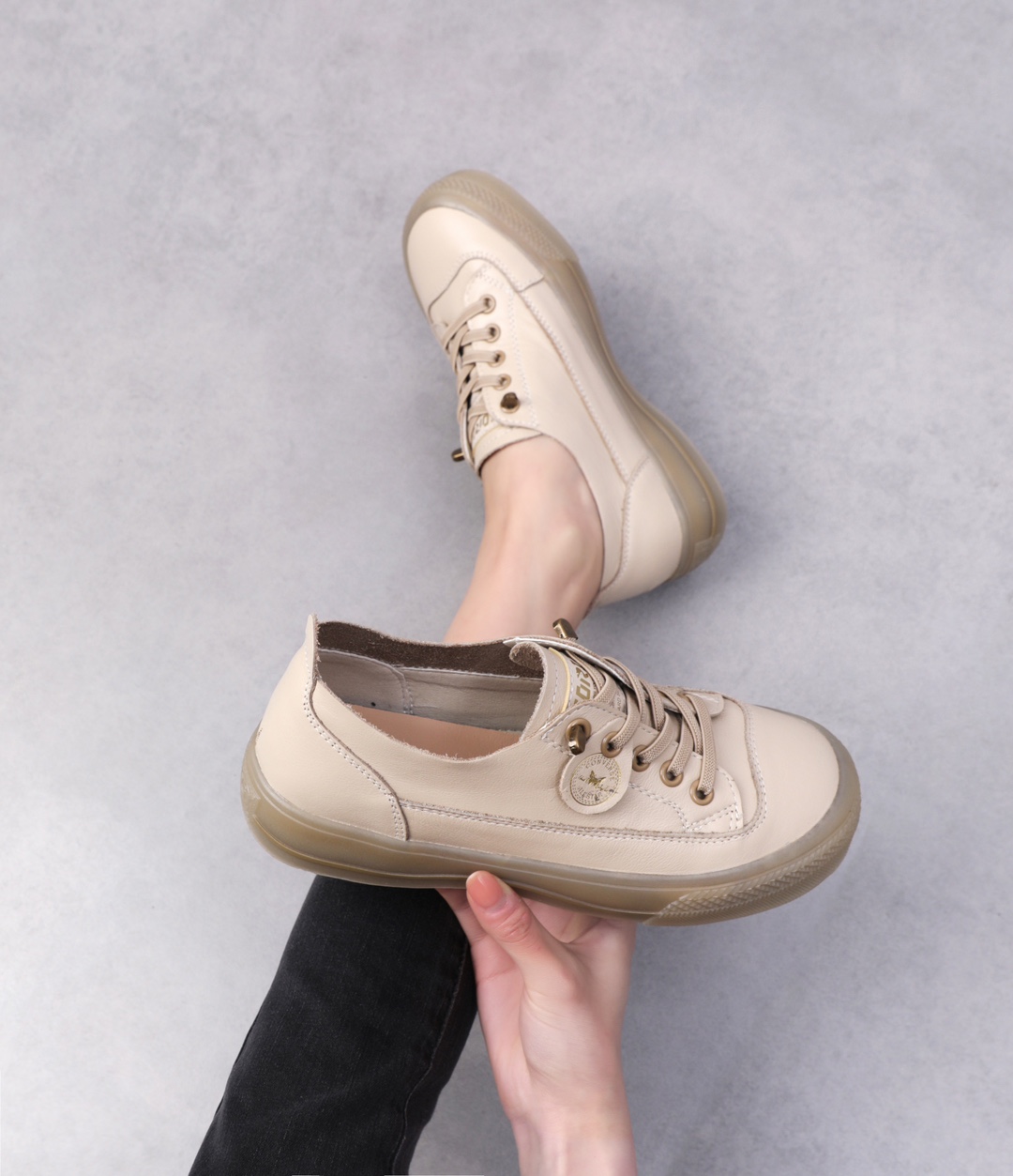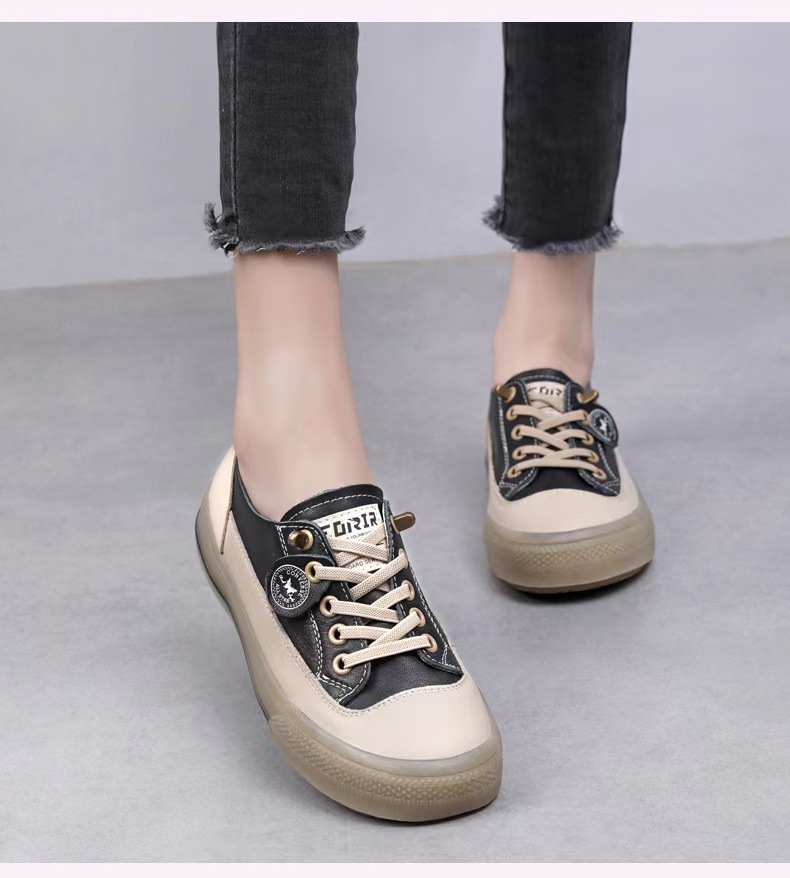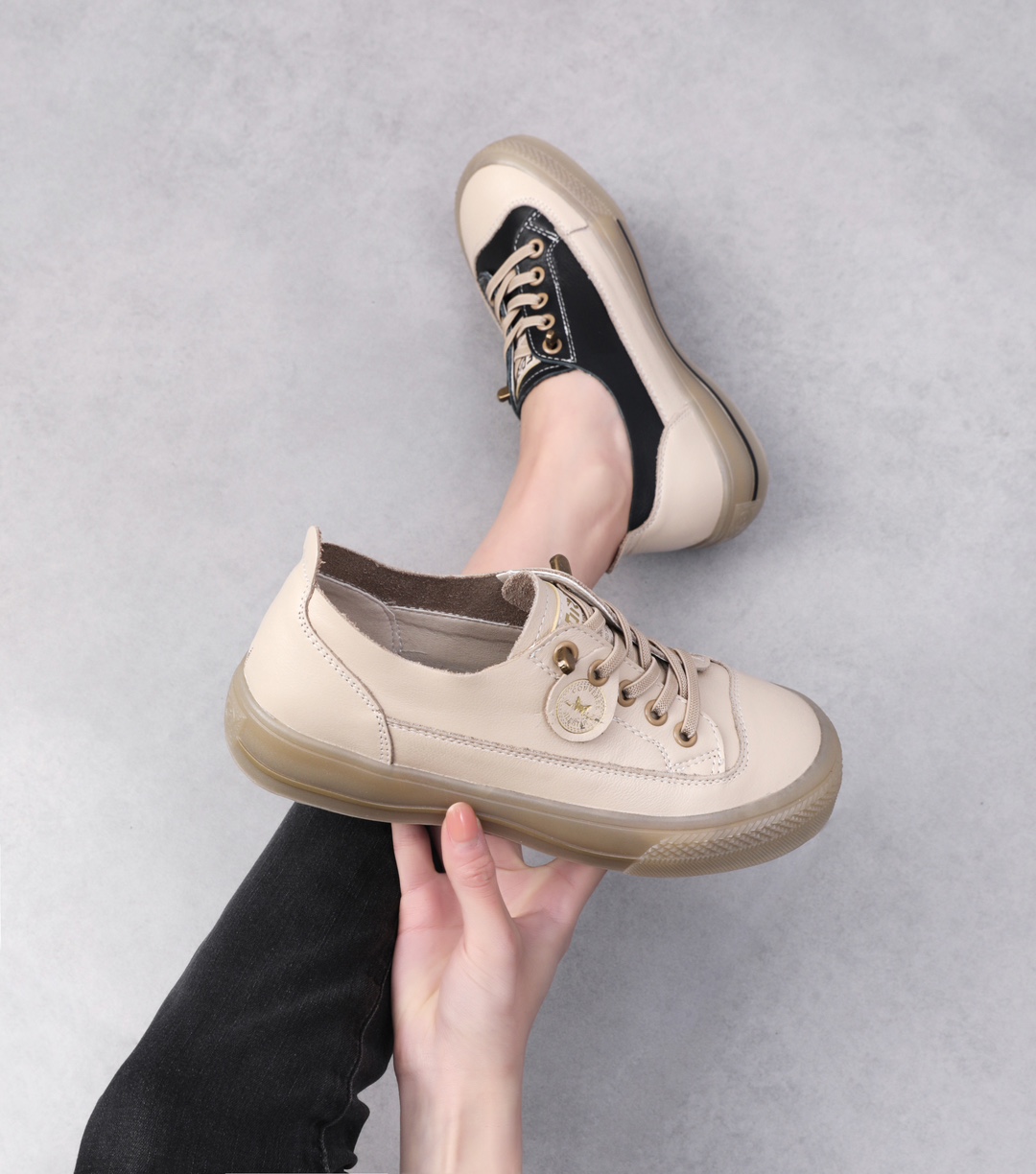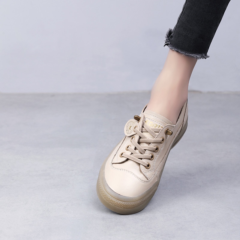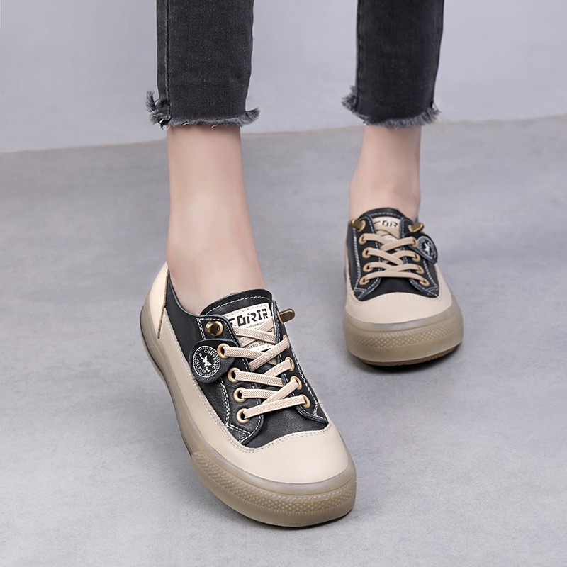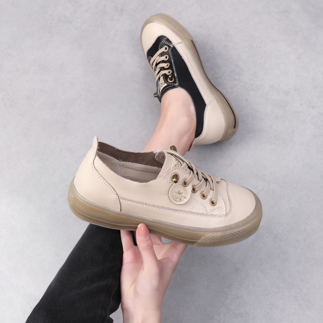 첫 번째 레이어 소 가죽 여성의 2024 새로운 봄과 가을 두꺼운 바닥 슬립-쇠고기 힘줄 평평한 부드러운 표면 캐주얼 여성 화이트 보드 신발스토어 가기