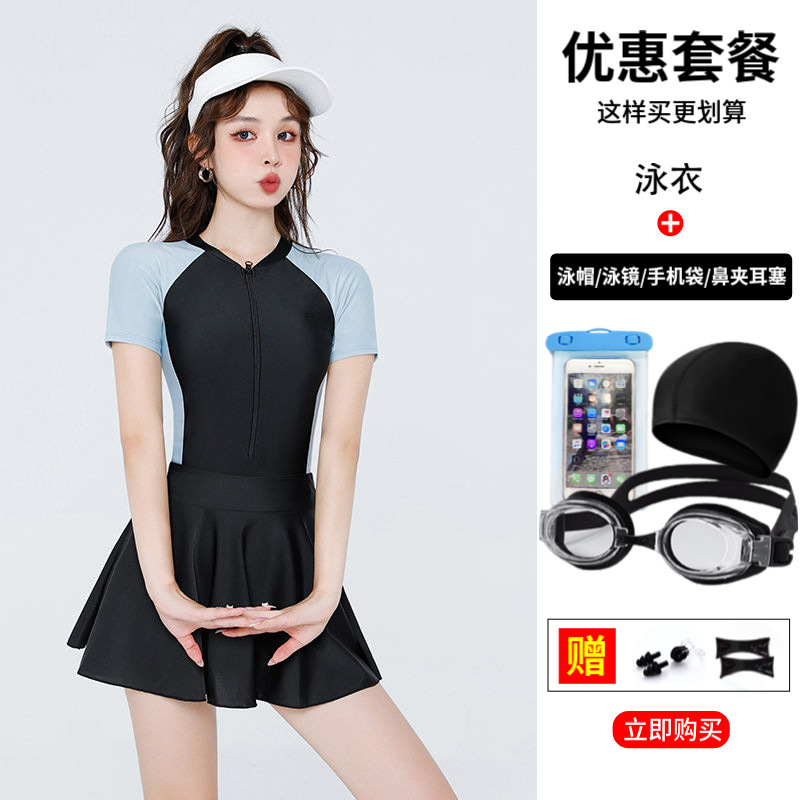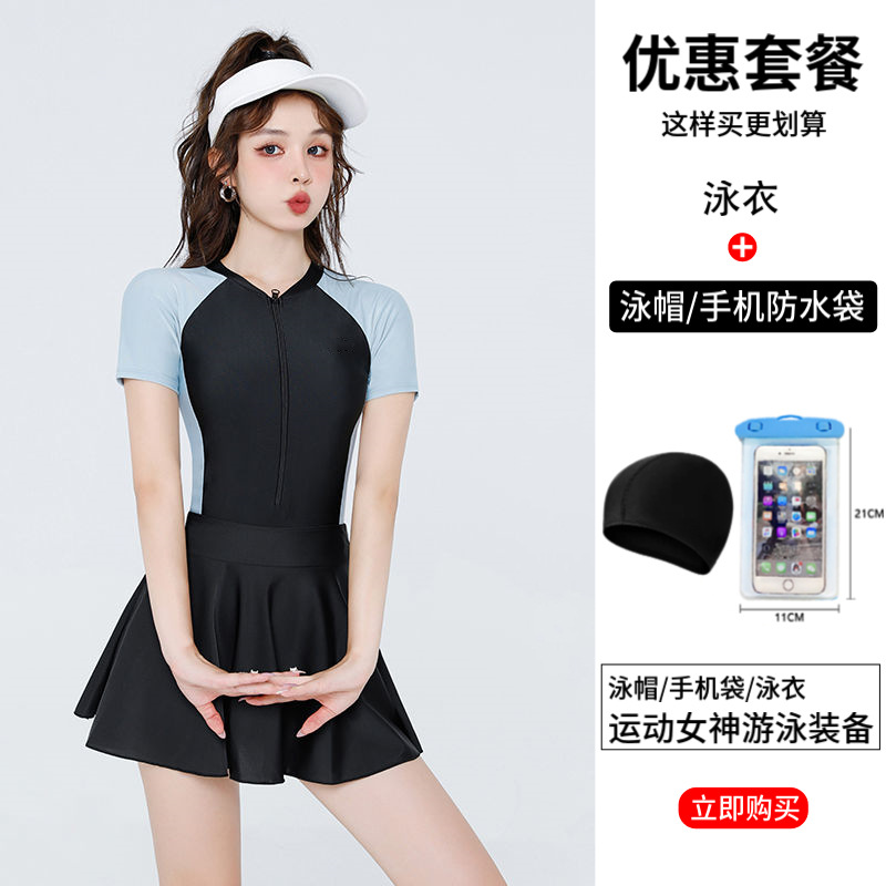 • 파란색과 검은 색-짧은 소매 [분리 가능한 스커트] + 수영 모자 + 휴대 전화 가방