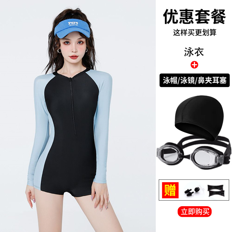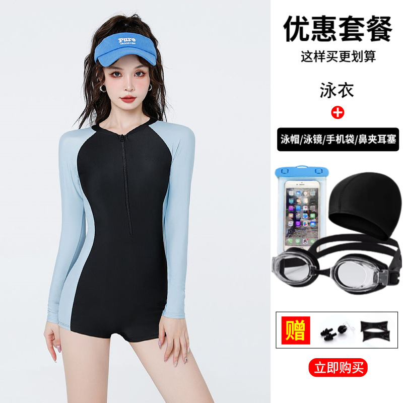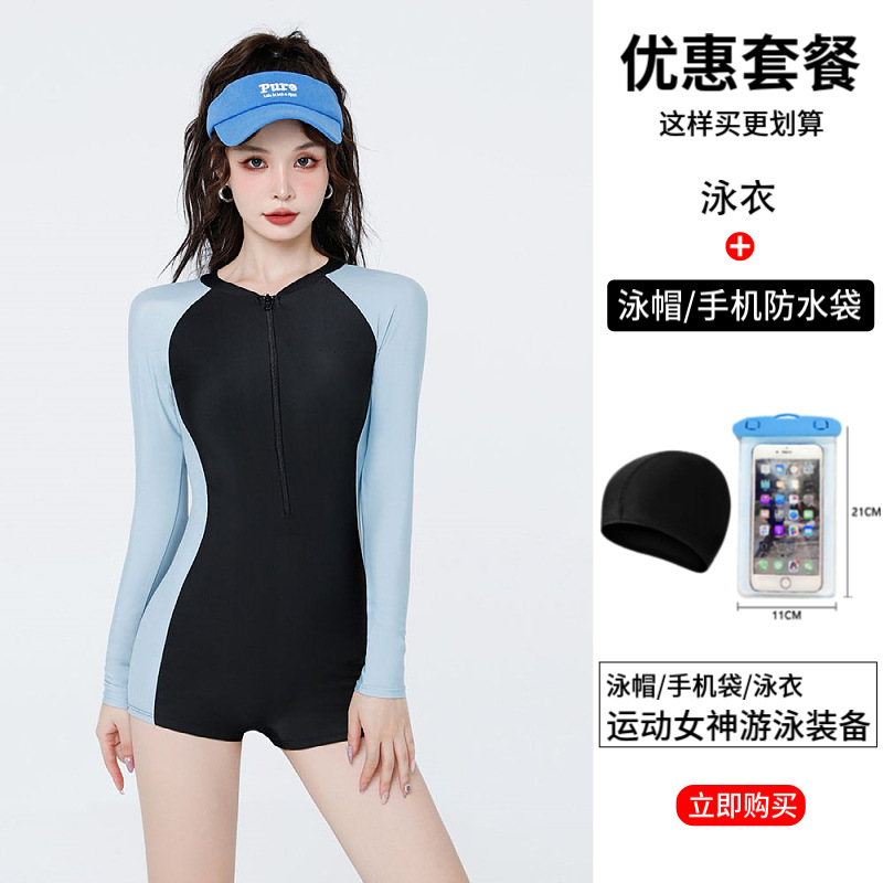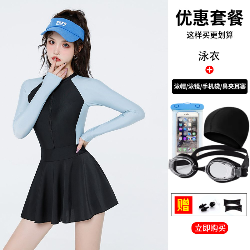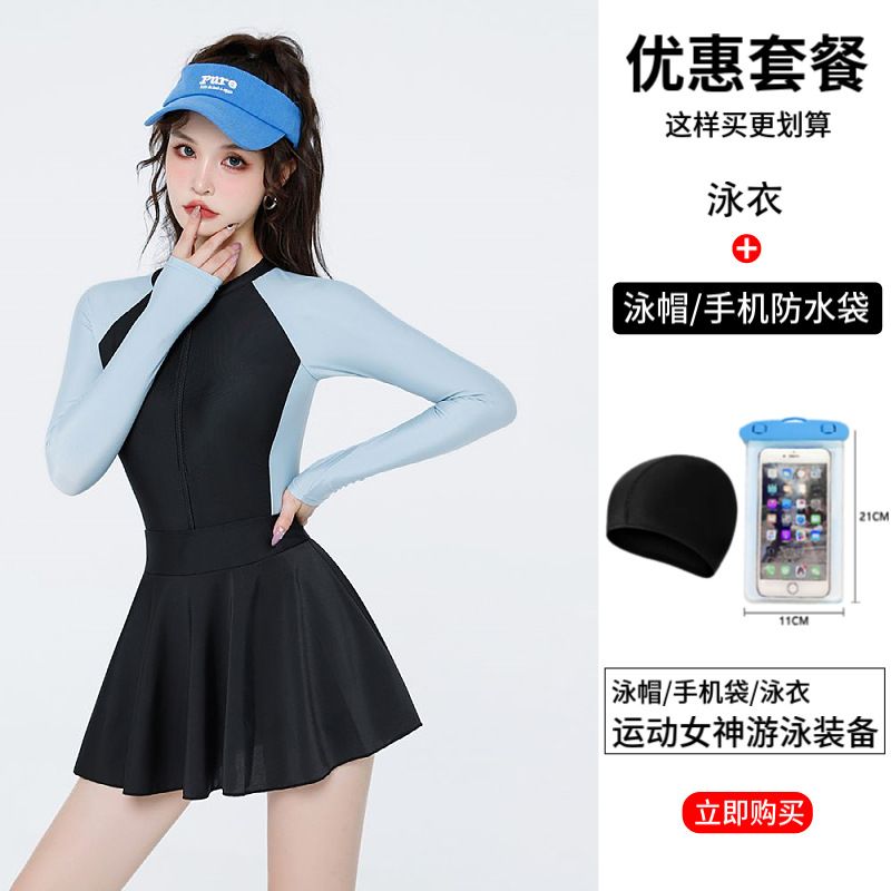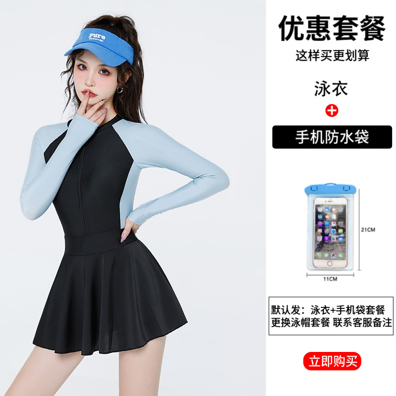 • 파란색과 검은 색 긴 소매 [분리 가능한 스커트] + 수영 모자 + 휴대 전화 가방