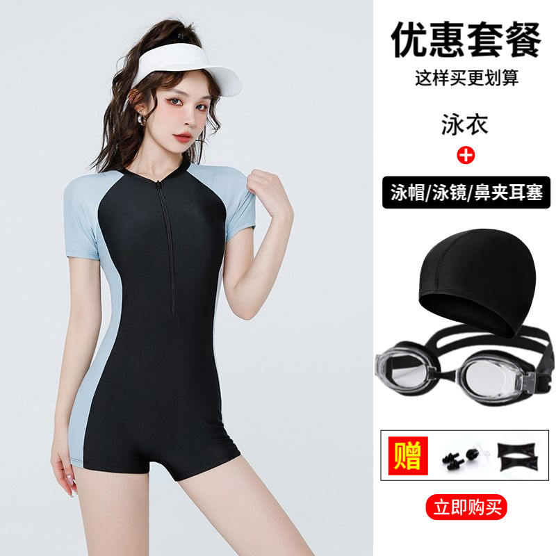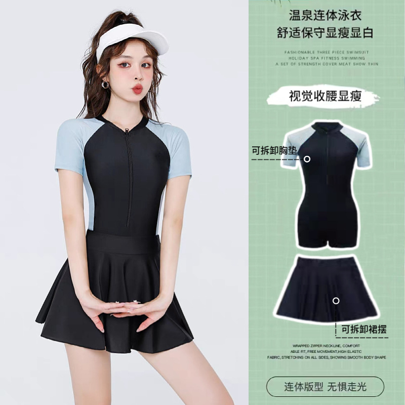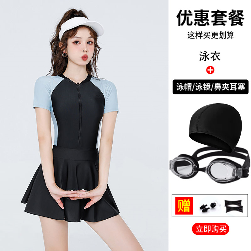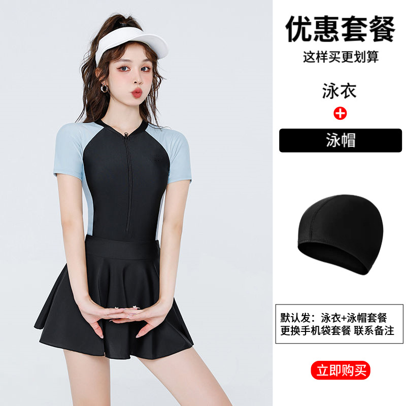 • 파란색과 검은 색-짧은 소매 [분리 가능한 스커트] + 수영 모자