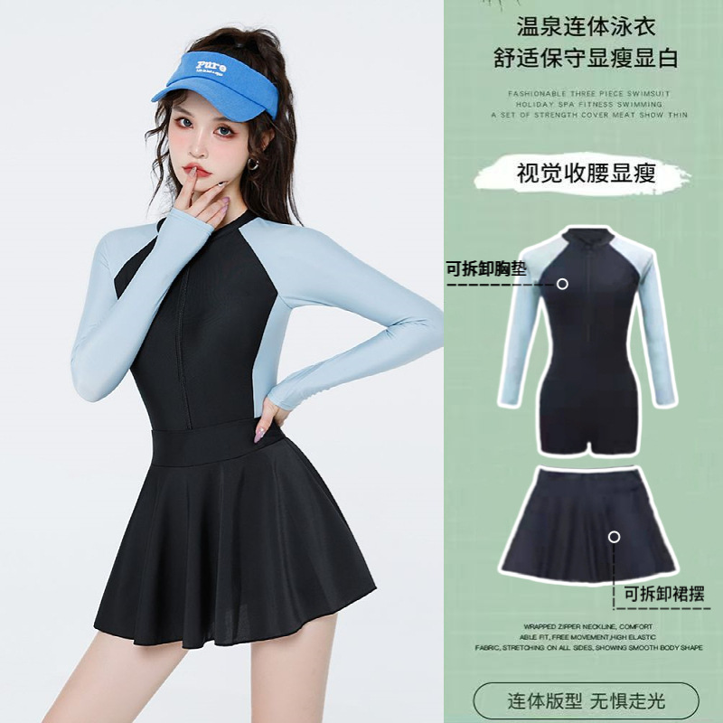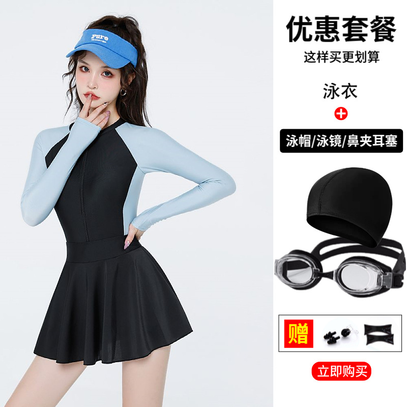• 파란색과 검은 색 긴 소매 [분리 가능한 스커트] + 수영 모자